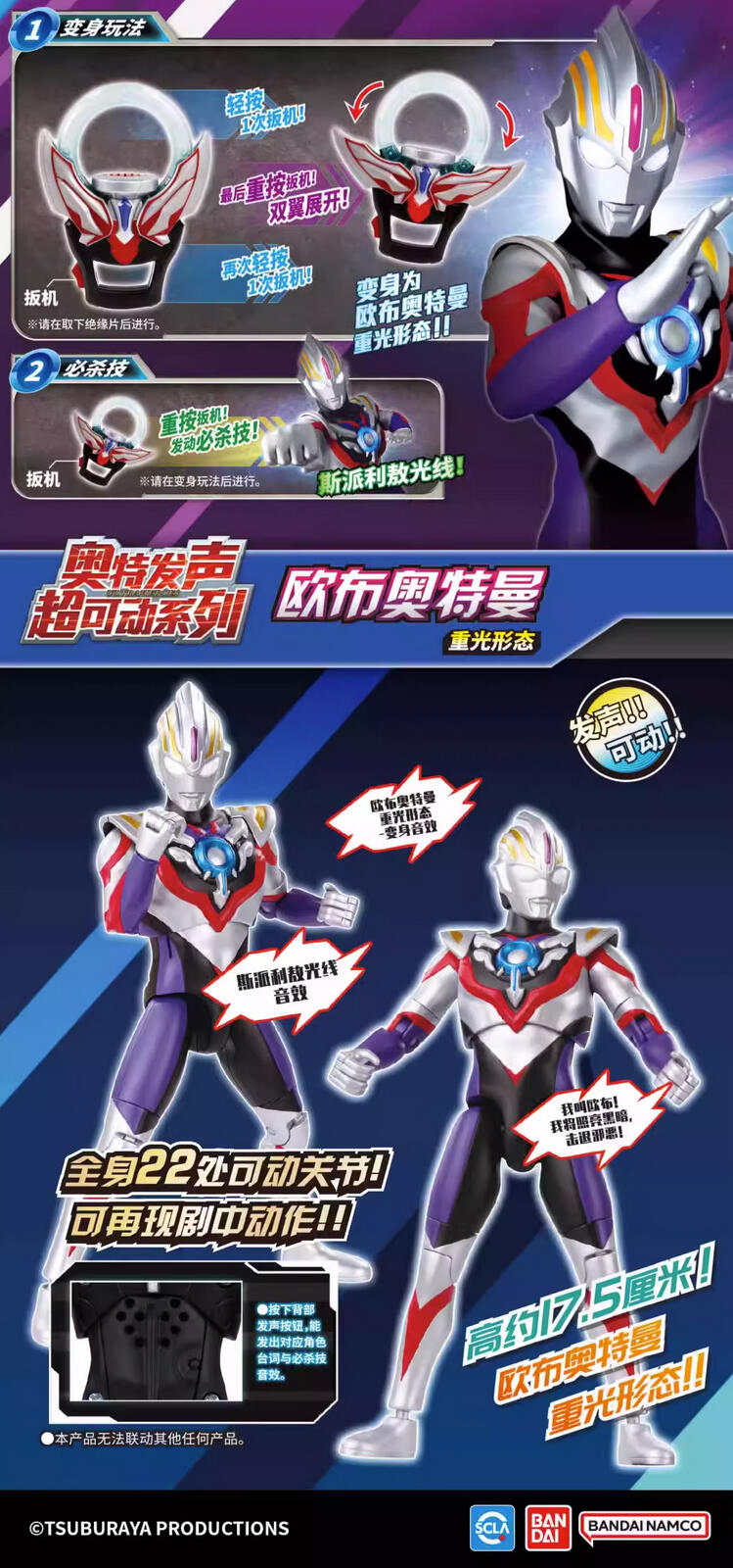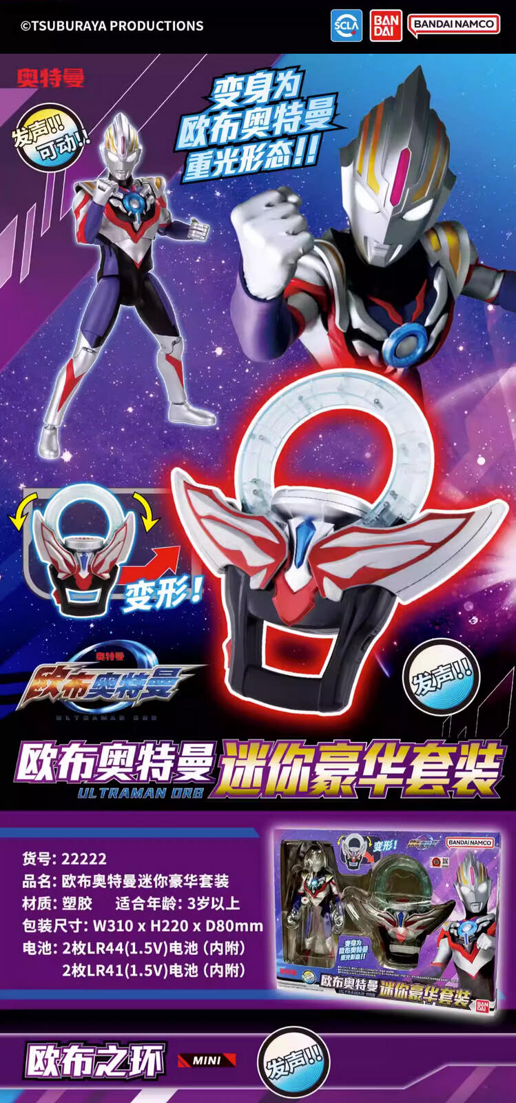 欧布奥特曼迷你豪华套装,套装包含迷你欧布之环、发声超可动人偶 欧布奥特曼重光形态,迷你欧布之环可发声,按下扳机变身为欧布奥特曼重光形态;发声超可动人偶 欧布奥特曼 重光形态全身多出可动,可以播放各种台词