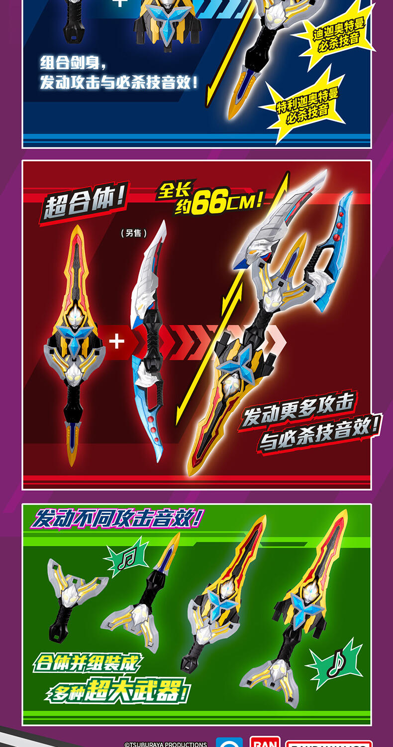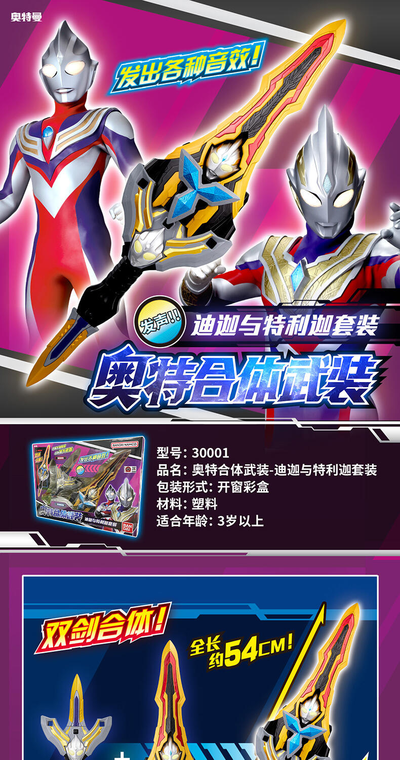奥特合体武装-迪迦与特利迦套装,内含特利迦剑身和迪迦剑身,两把剑均能发声,可分开赏玩,发动必杀技音效,也可以组合剑身,发动合体模式的攻击和变身音效,还能和另售的其他奥特合体武装联动,进行超合体,发动更多攻击与必杀技音效