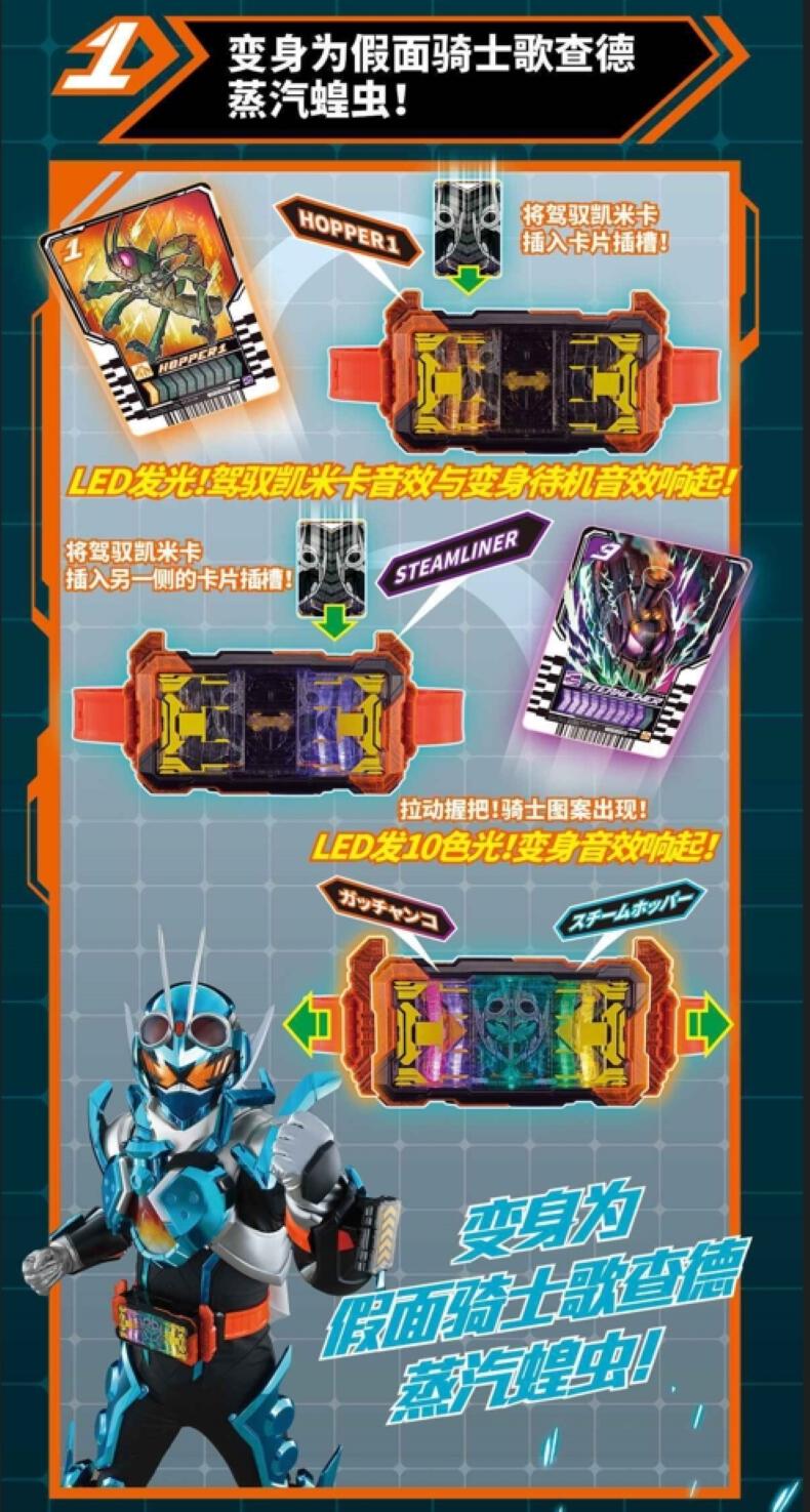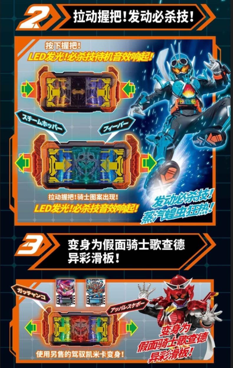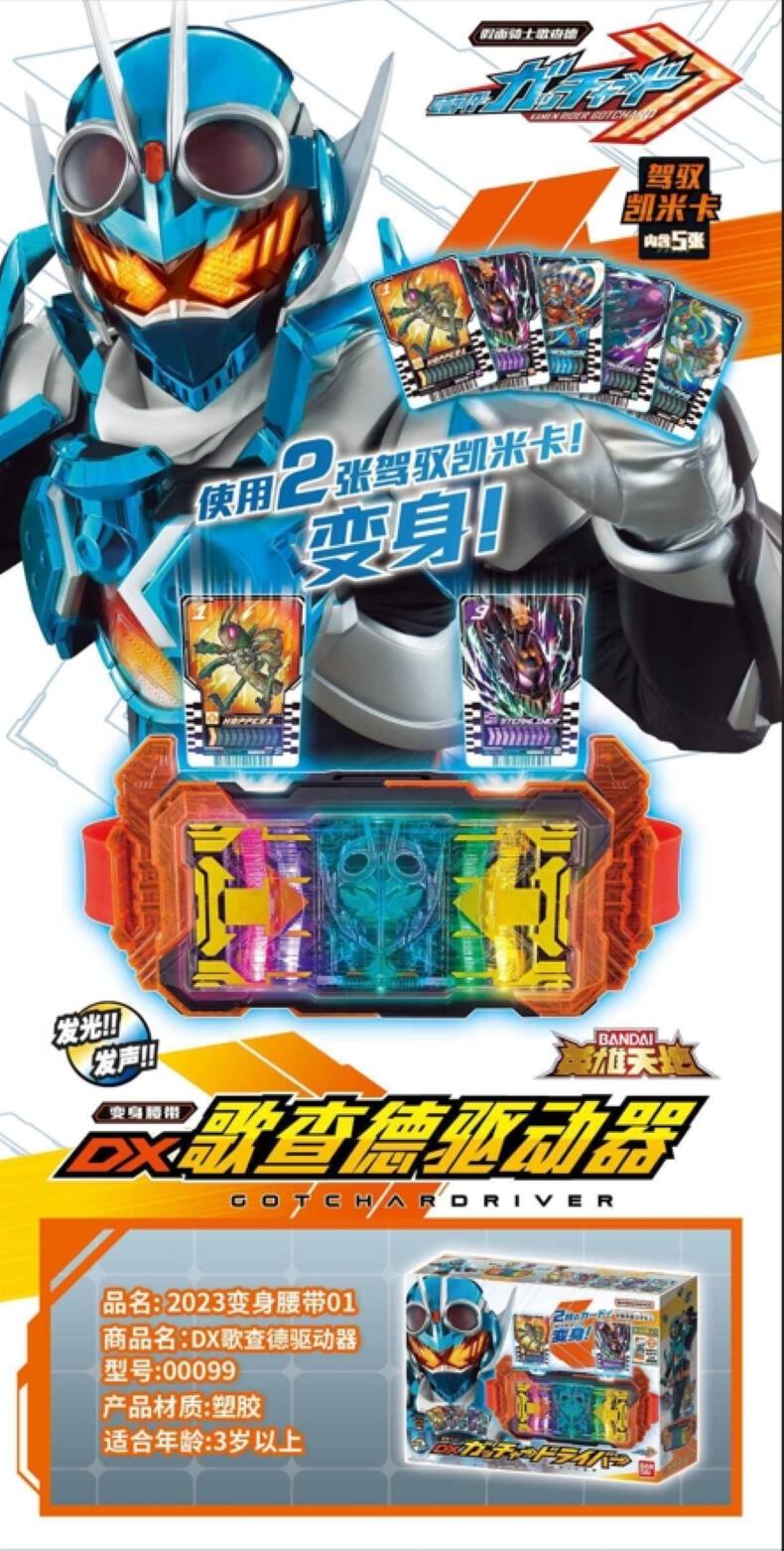「假面骑士Gotchard」中,变身驱动器登场!在左右的插卡槽设置2张卡“ride keemitreka”的话,卡名和变身待机声音发动!拉杆的话,在腰带中央骑士面罩出现!LED 10色发光和变身声音发动!再次进行手柄操作的话,LED发光和必杀技声音发动!按下控制杆的话,卡片就会弹出!可以取出放置在腰带上的卡片。