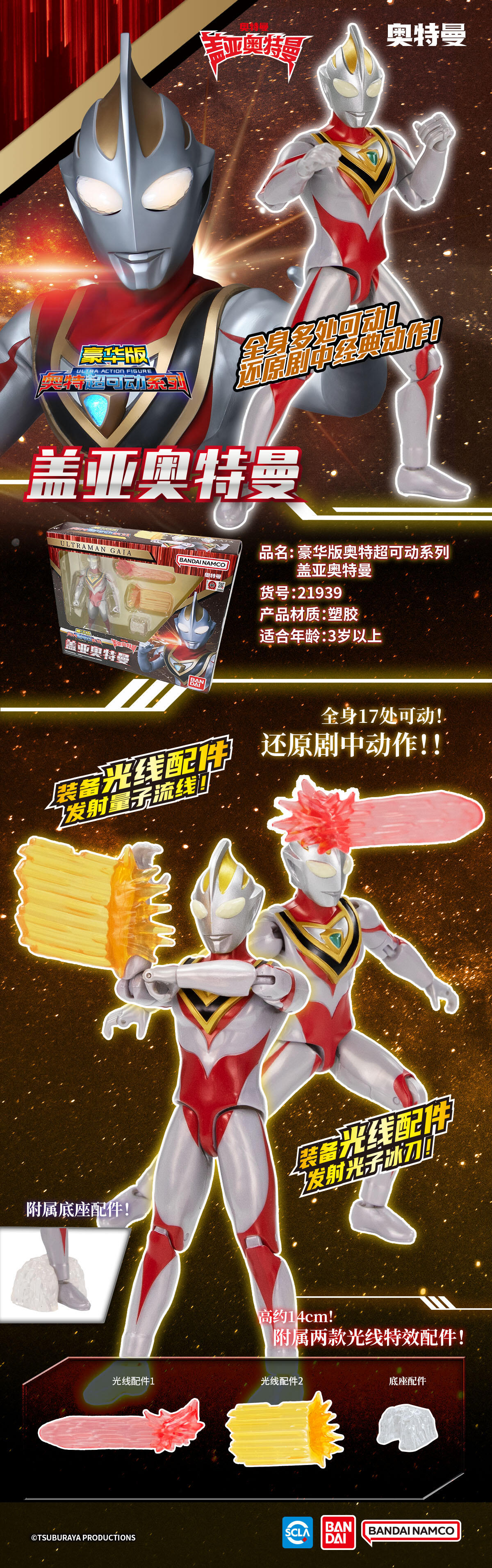 盖亚奥特曼全身多处可动,使用装备武器配件与光线配件可完美还原剧中动作!