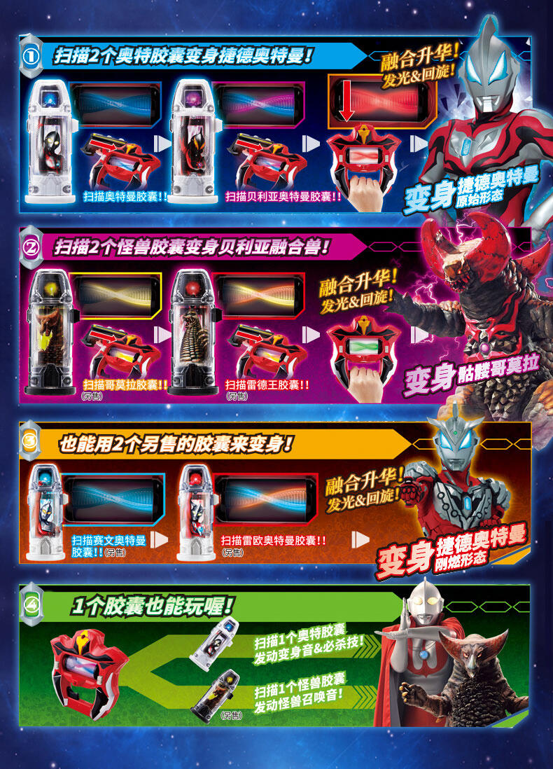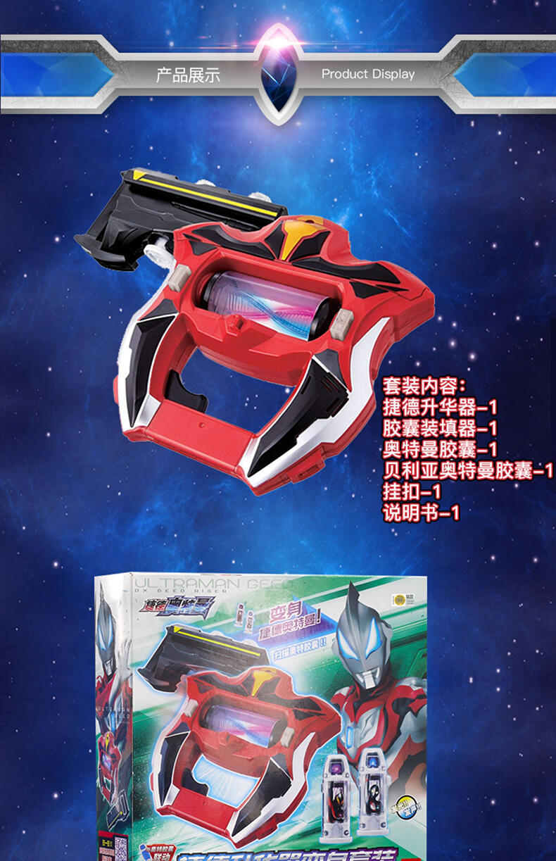 捷德升华器变身套装中,捷德升华器扫描胶囊可发动不同的奥特英雄/奥特怪兽的变身、召唤音效,附送2个胶囊,升华器可与另售的捷德之爪决战套装联动,发动变身音效,极具赏玩性