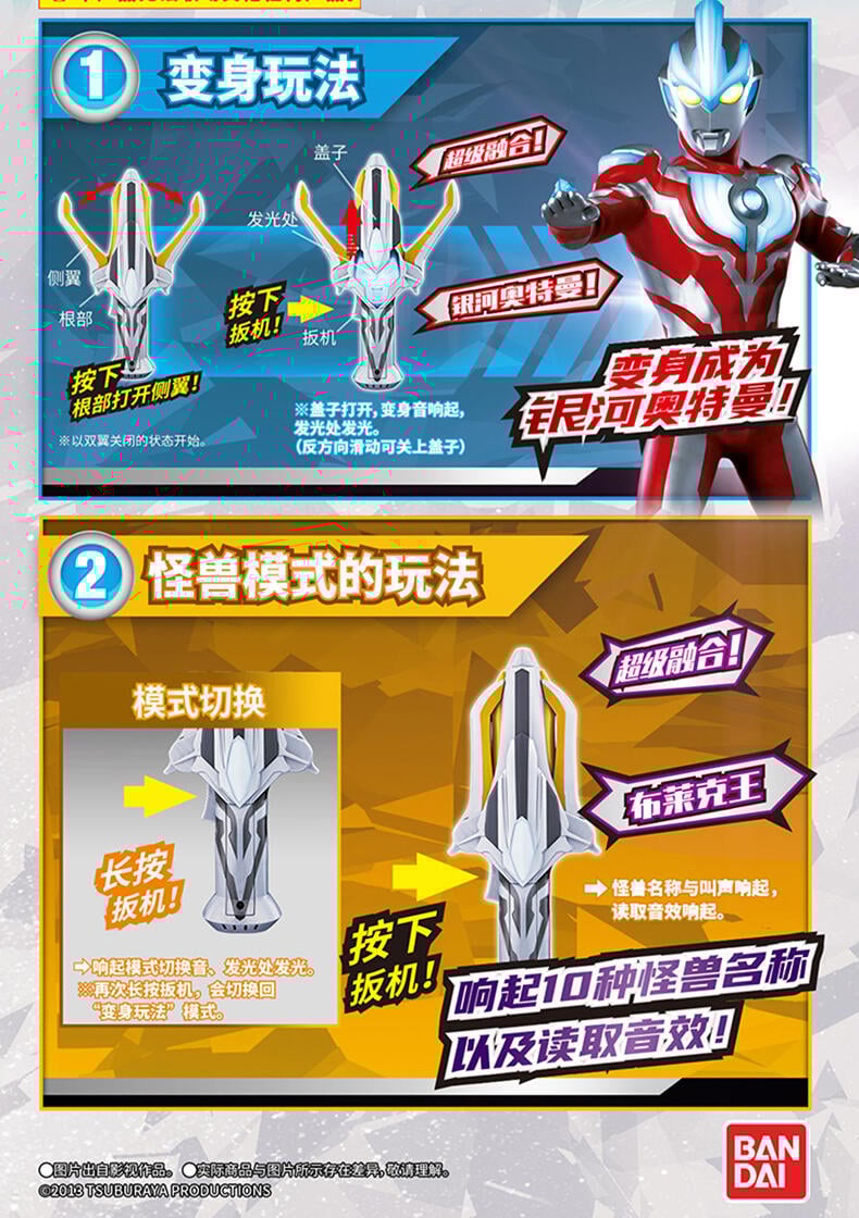 使用银河火花变身成为银河奥特曼,打开侧翼,按下扳机,发光发声,长按扳机,发动怪兽名称与叫声,想起读取音效