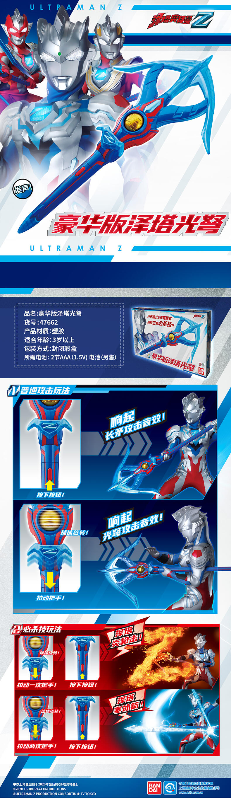 豪华版泽塔光弩可发声,拉动把手可发出攻击音效,长按按钮切换为必杀技模式,可发出不同的必杀技音效