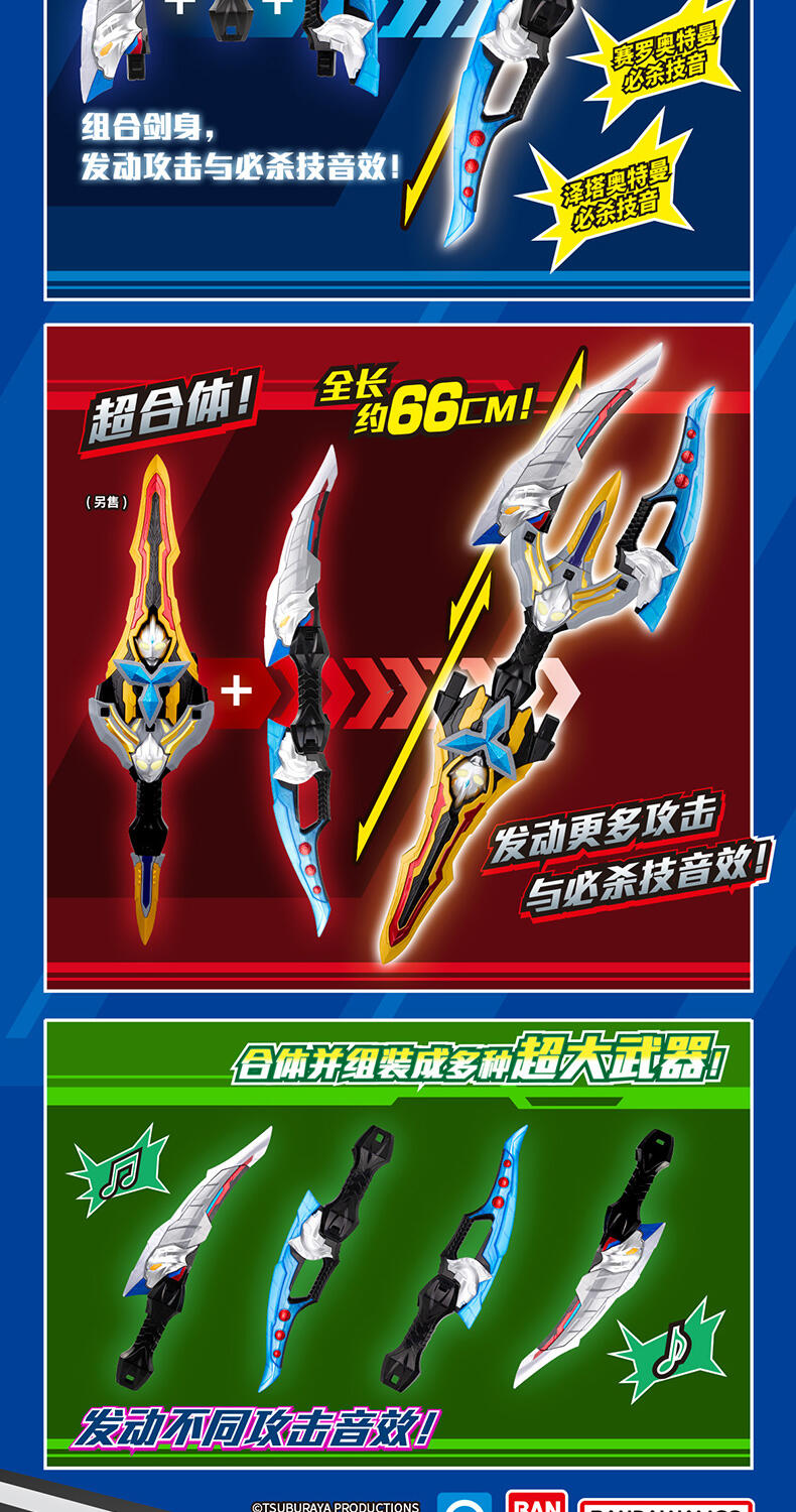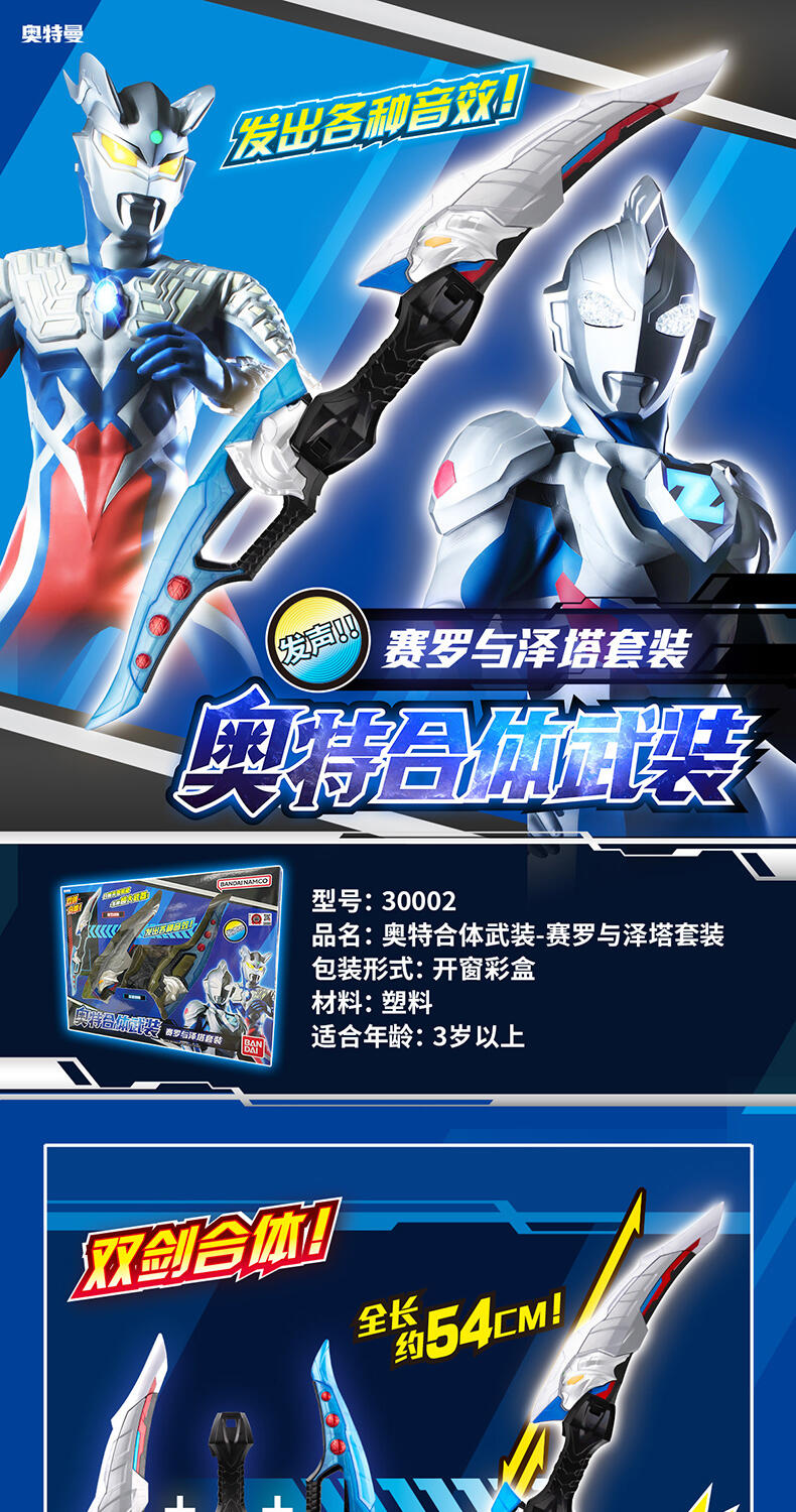 奥特合体武装-赛罗与泽塔套装,内含赛罗剑和泽塔剑,两把剑均能发声,可分开赏玩,发动必杀技音效,也可以组合剑身,发动合体模式的攻击和变身音效,还能和另售的其他奥特合体武装联动,进行超合体,发动更多攻击与必杀技音效