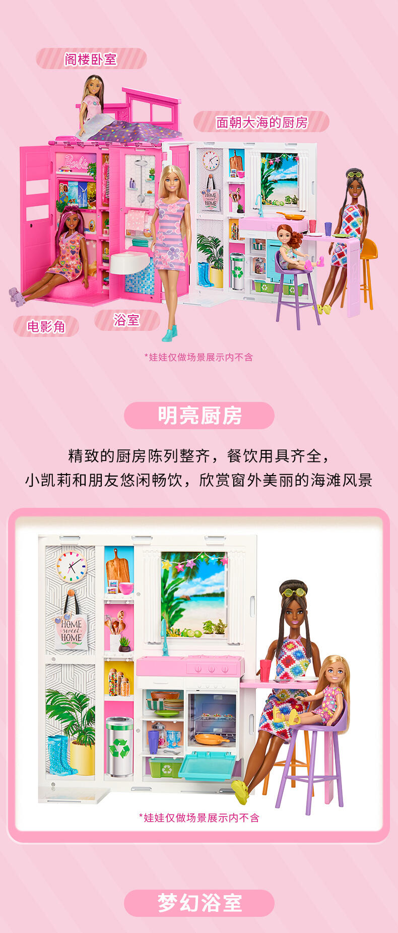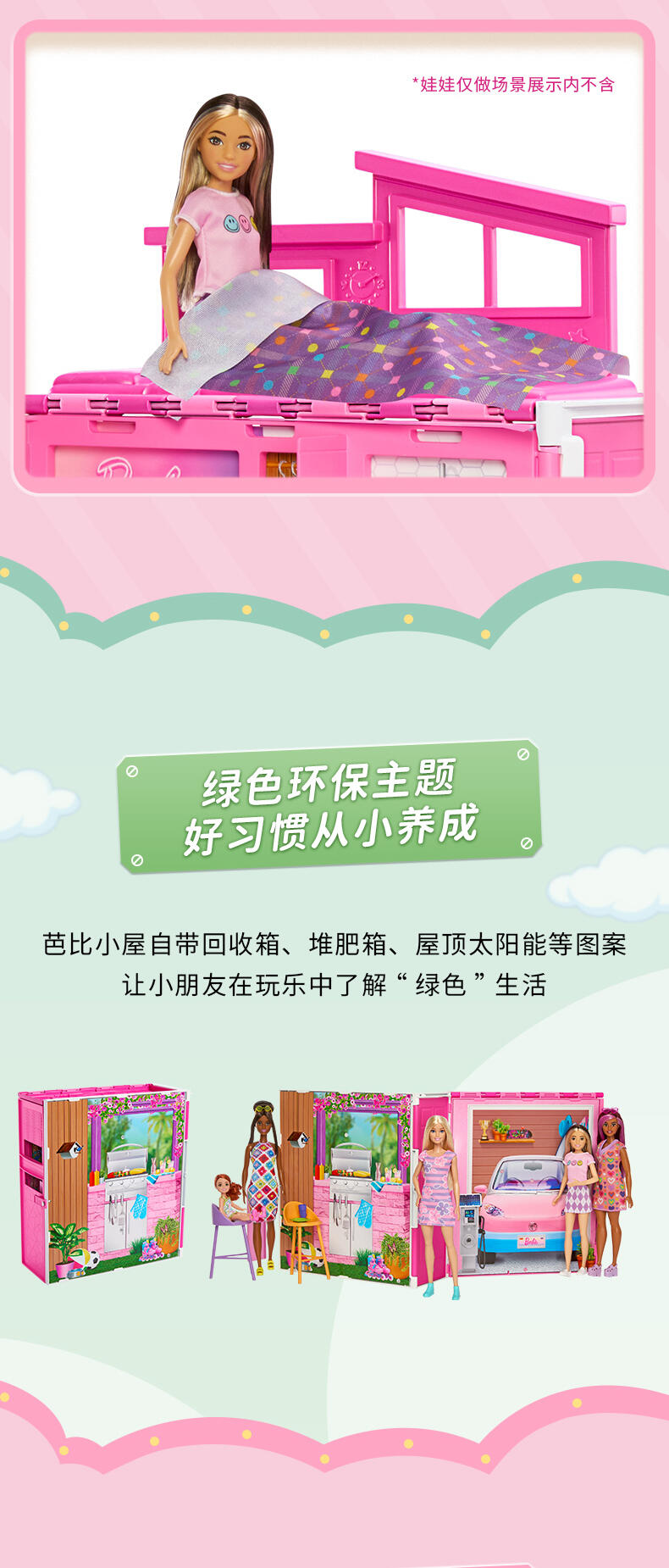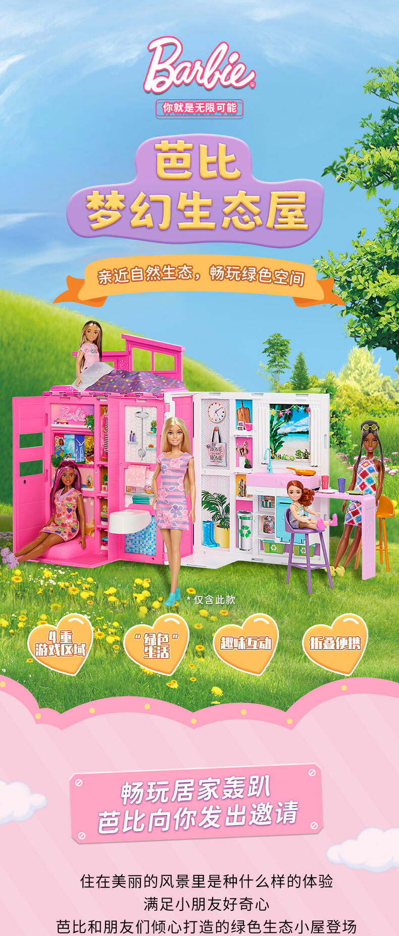 由ISCC认证的生物基塑料材质制成;环保设计题材。提倡环保/可持续的行动;4个游戏区。包括厨房、浴室、卧室和可折叠的电影角,便于携带及储存;可折叠,方便储存;包括穿着一个碎花连衣裙和蓝色鞋子的芭比娃娃;11主题性演绎配件