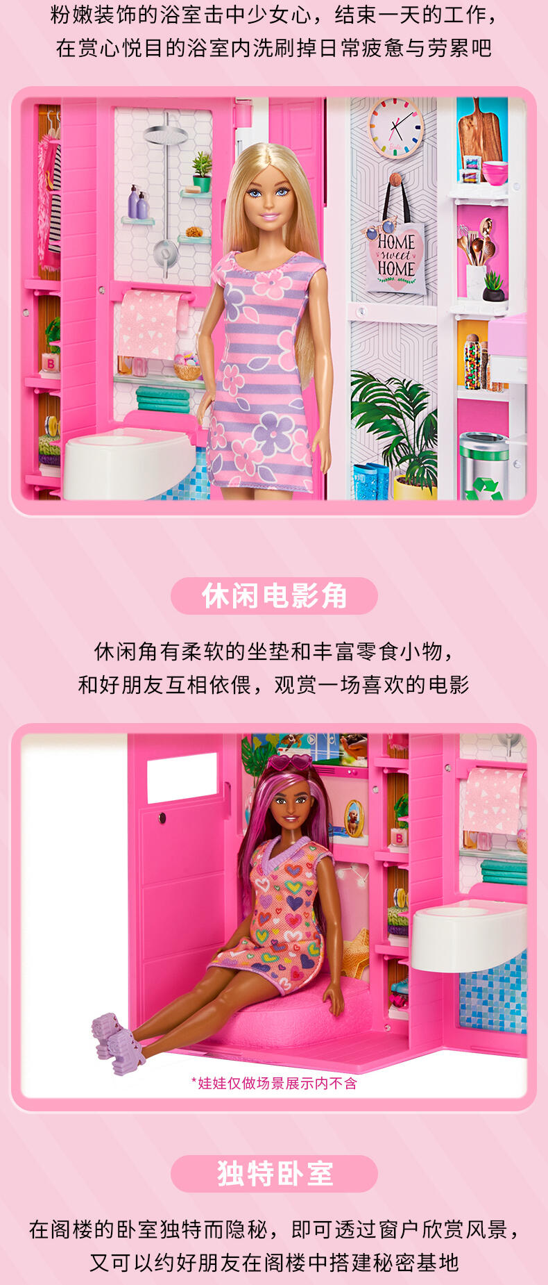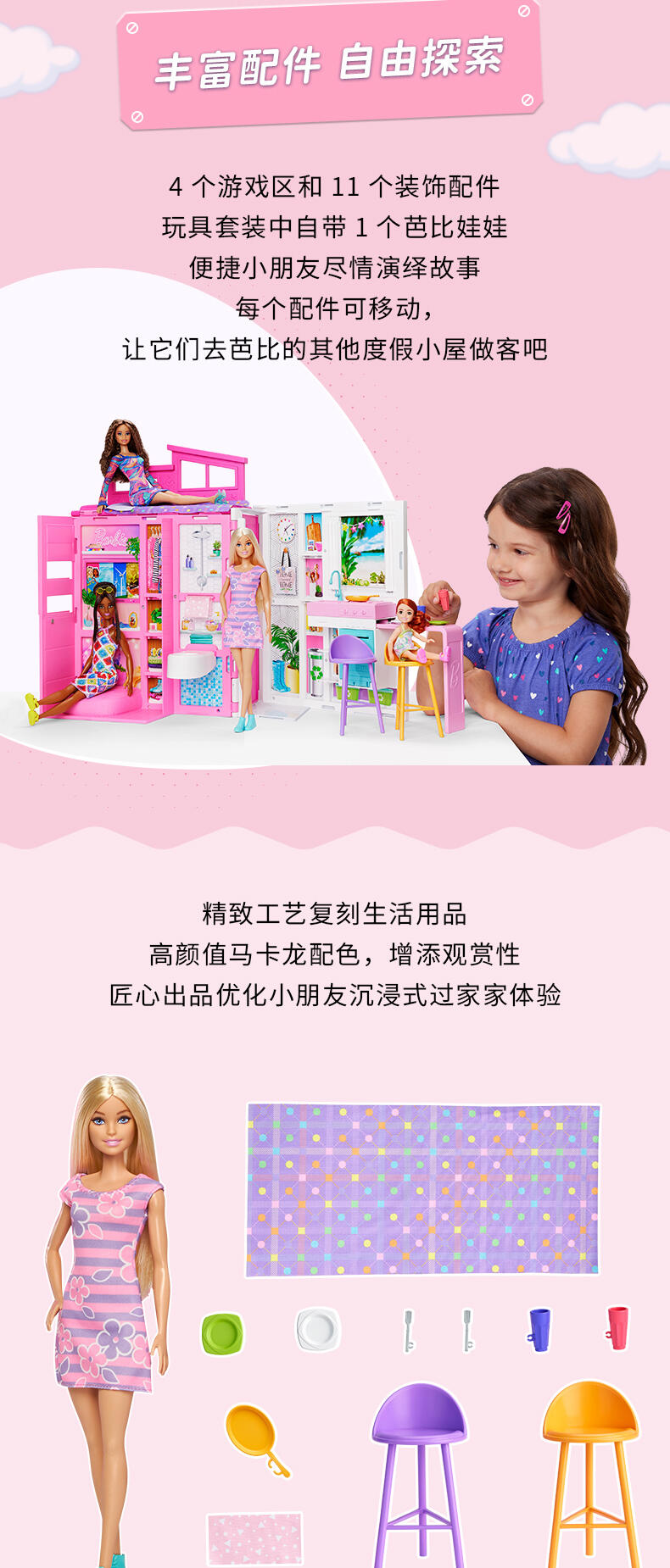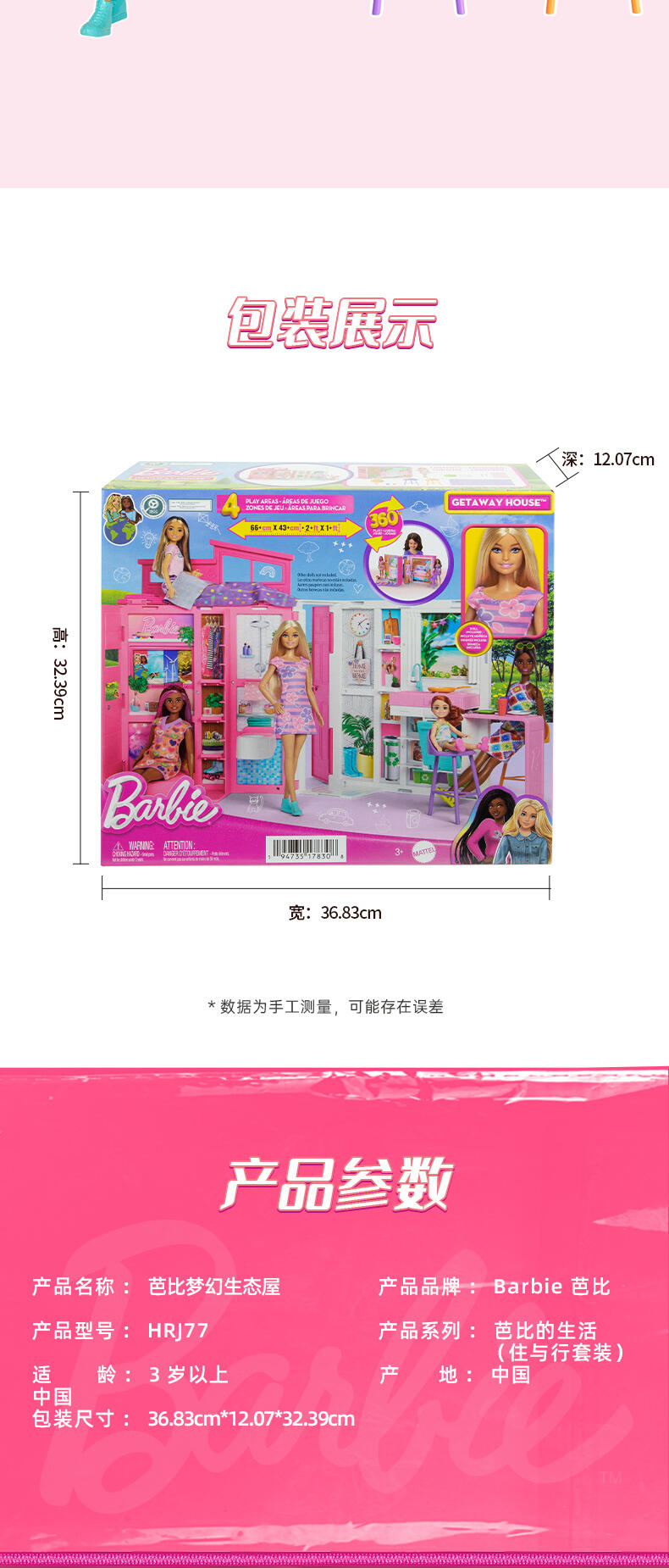 由ISCC认证的生物基塑料材质制成;环保设计题材。提倡环保/可持续的行动;4个游戏区。包括厨房、浴室、卧室和可折叠的电影角,便于携带及储存;可折叠,方便储存;包括穿着一个碎花连衣裙和蓝色鞋子的芭比娃娃;11主题性演绎配件