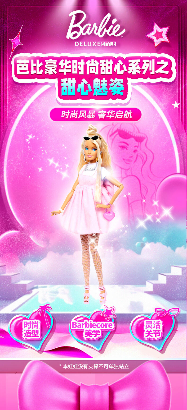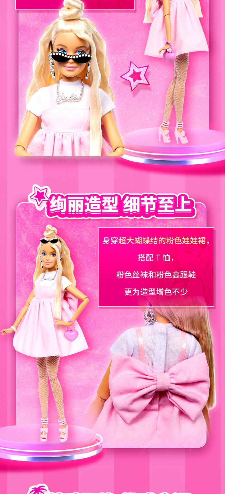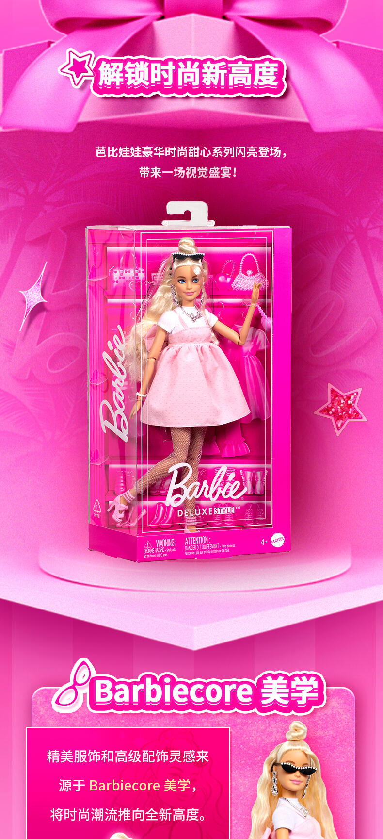全新豪华系列,将亮丽带回核心产品 发布主题庆祝芭比的标志性颜色,并在货架上重新夺回粉色的主权 每个娃娃都采用优质面料、潮流轮廓、适合女孩的细节和高级配饰 全关节可动设计增加了在时尚游戏中的可塑性 白人米莉娃娃,穿着带有超大蝴蝶结细节的闪亮质感连衣裙
