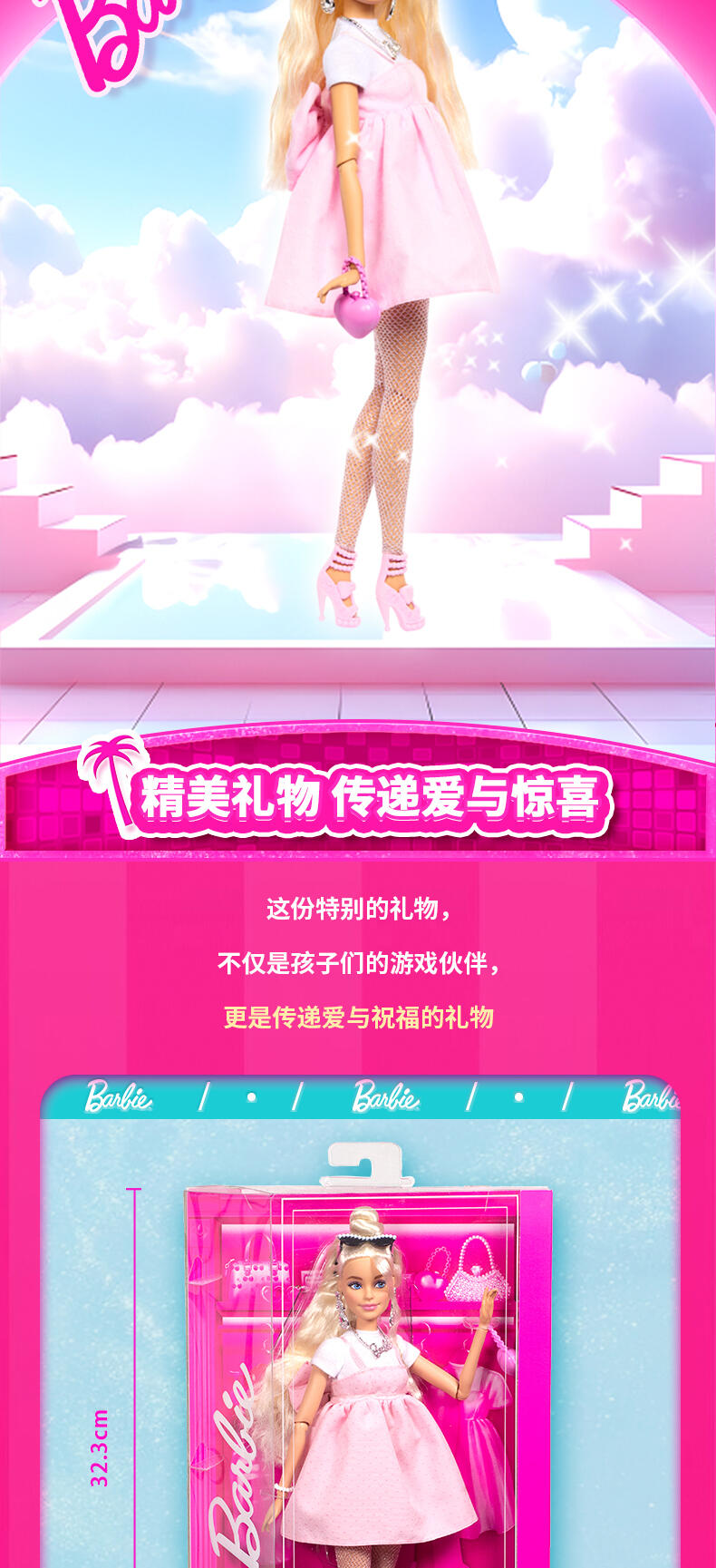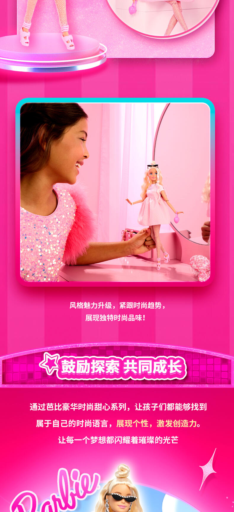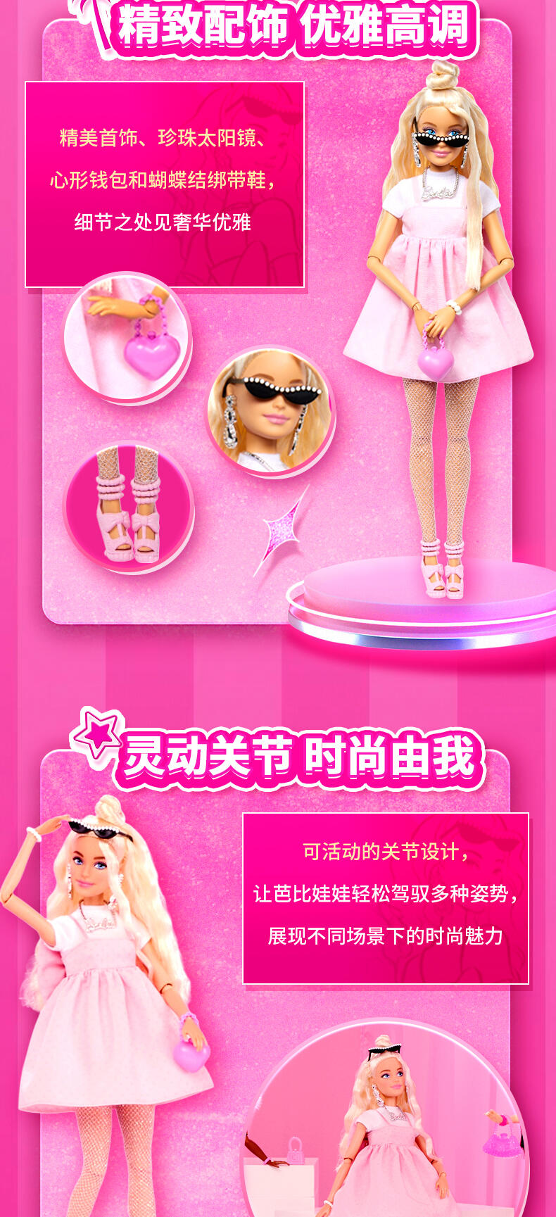 全新豪华系列,将亮丽带回核心产品 发布主题庆祝芭比的标志性颜色,并在货架上重新夺回粉色的主权 每个娃娃都采用优质面料、潮流轮廓、适合女孩的细节和高级配饰 全关节可动设计增加了在时尚游戏中的可塑性 白人米莉娃娃,穿着带有超大蝴蝶结细节的闪亮质感连衣裙