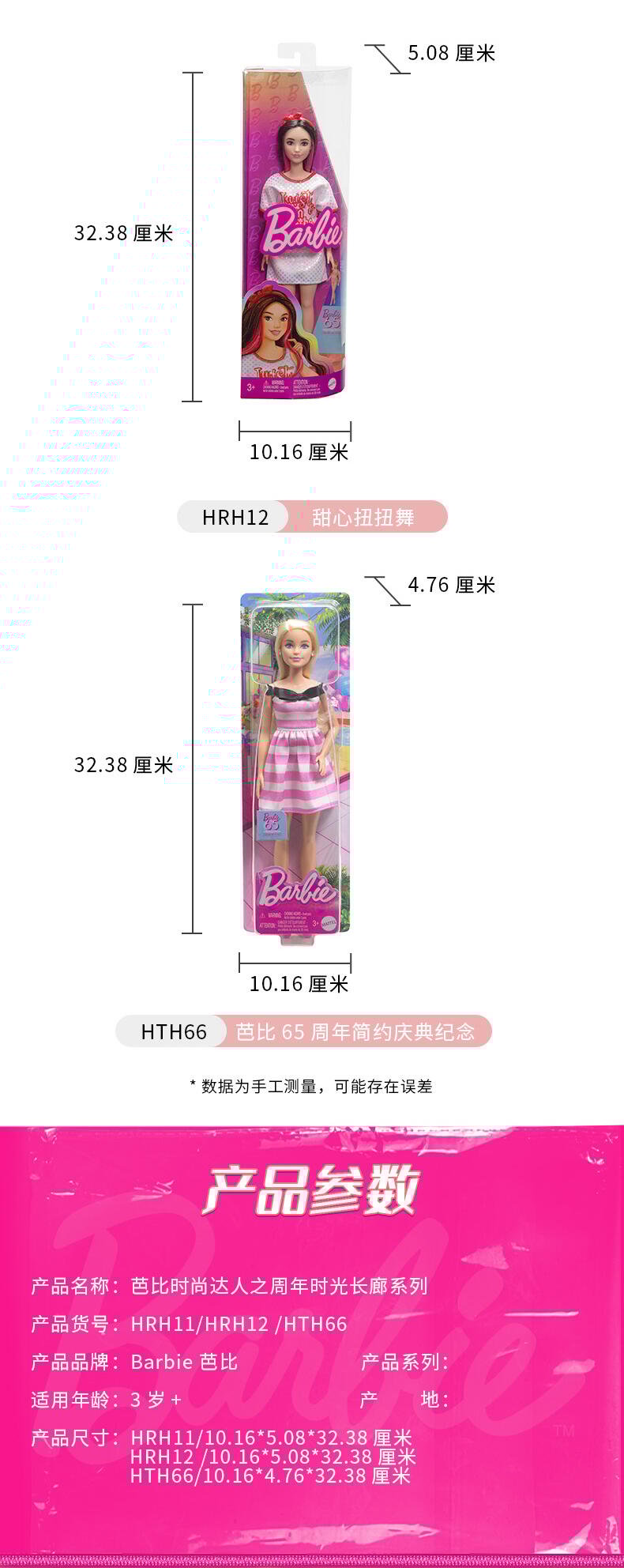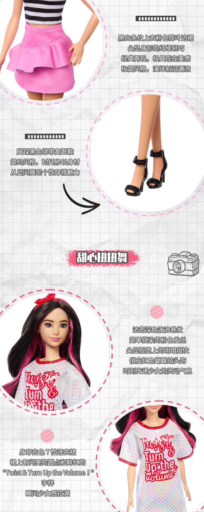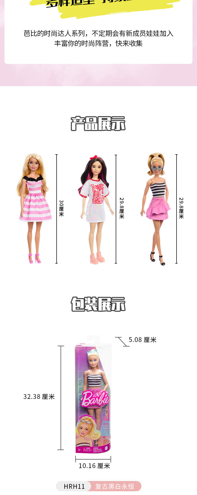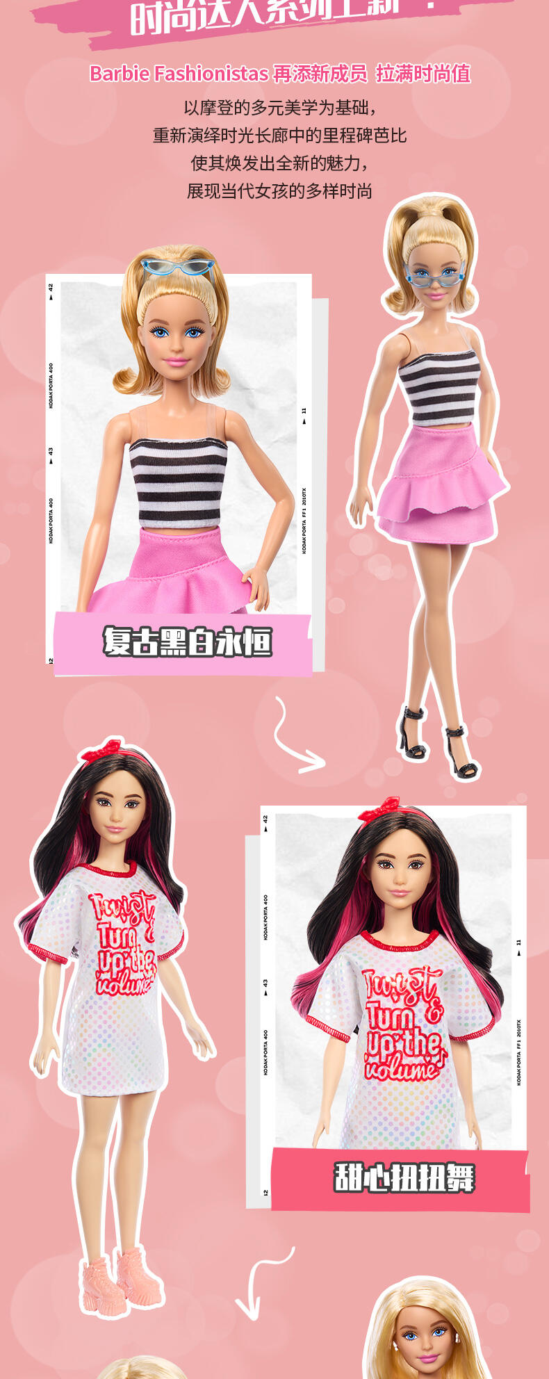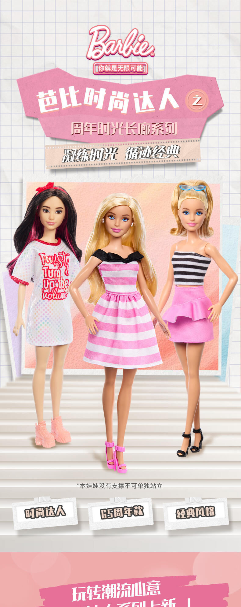 全新周年特别款时尚达人系列;以摩登的多元美学,重新演绎时光长廊中的里程碑芭比;结合50~90年代标志性元素的芭比款式,并身着更现代、更多元的服装配饰,多种身材与肤色让美更多元化;该系列设计既能吸引小朋友,亦能吸引成年粉丝,全线搭配销售亦能激发粉丝的收藏欲望