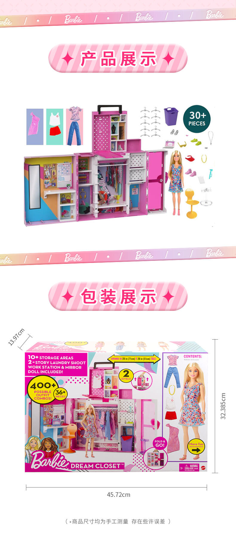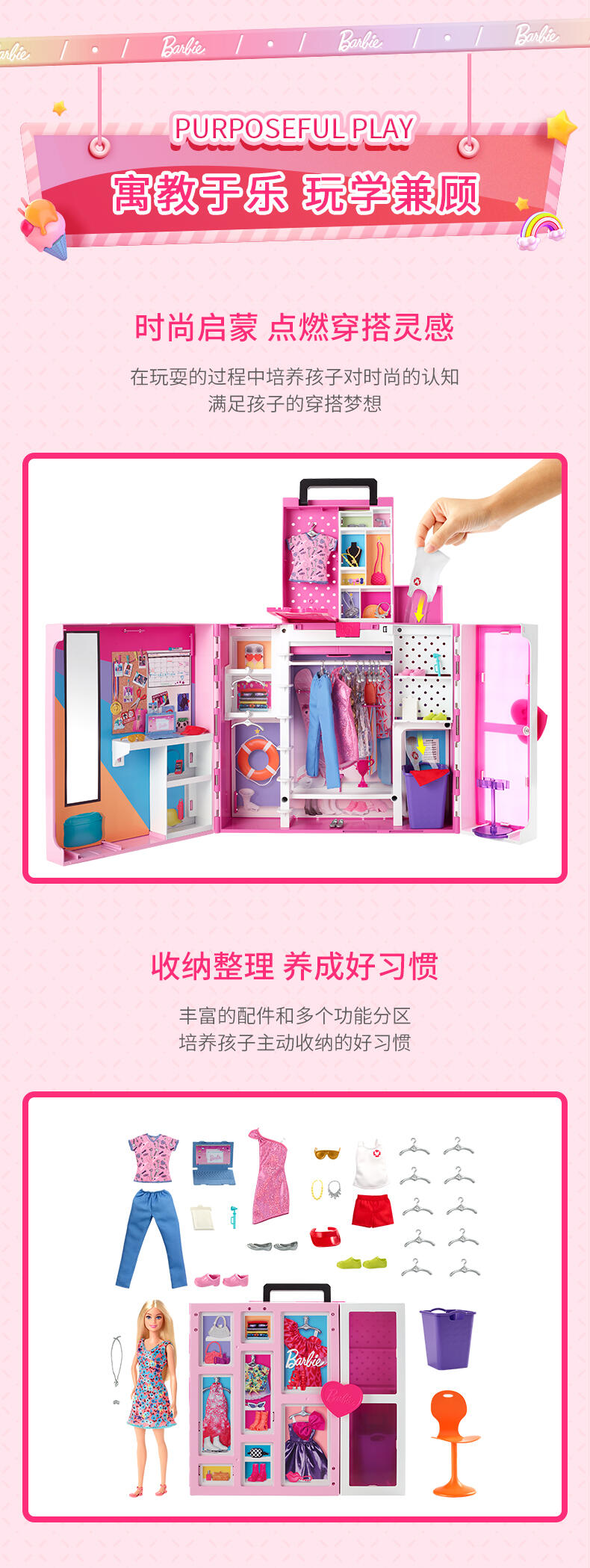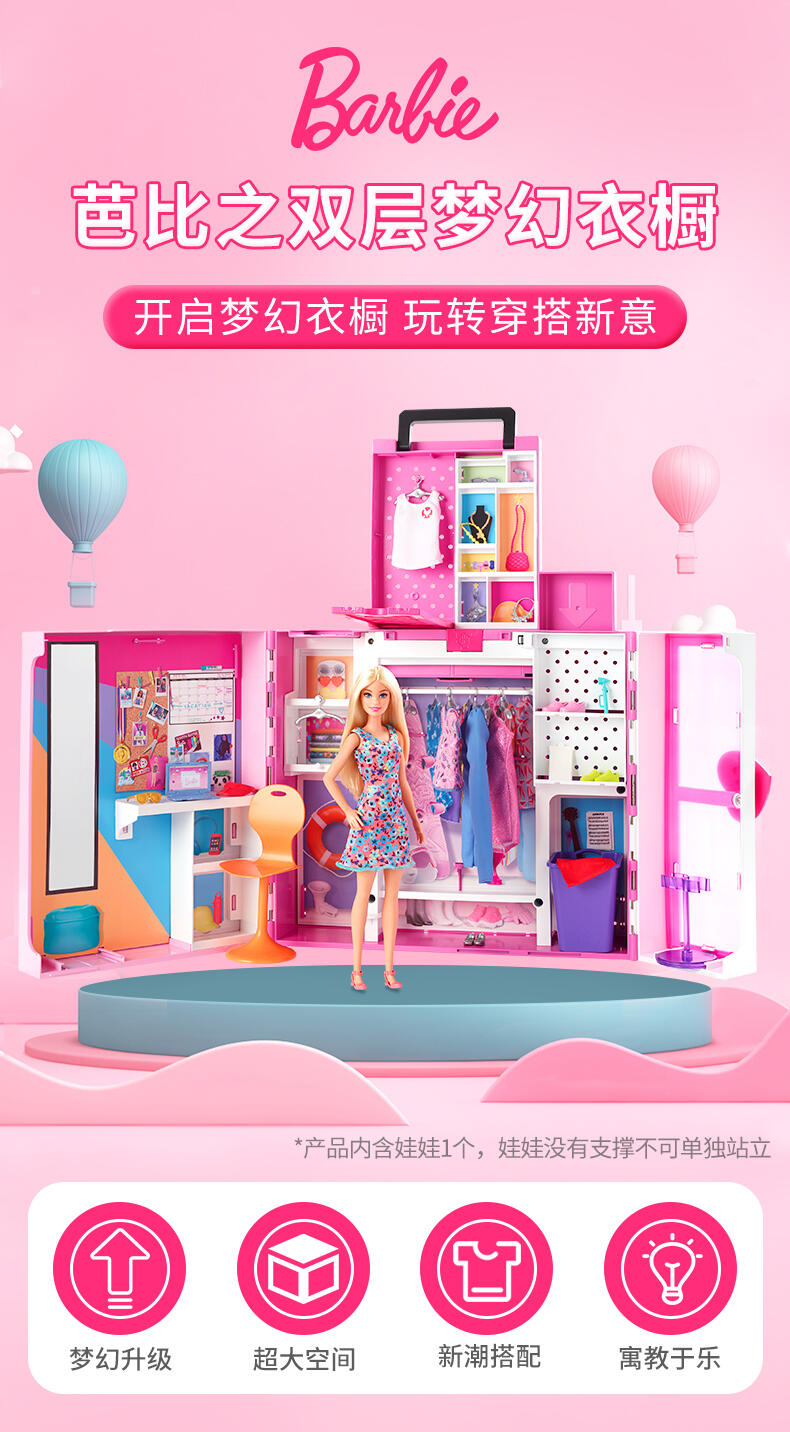 两层衣柜为衣橱拓展了更多的空间,粉红色衣柜可推拉门更好的利用空间,最右边增加了试衣镜,最左边增加了新潮系列的特征;包含四整套服装,涵盖不同时间不同场合;含30多个配件,可以为芭比搭配不同风格的衣服。 两层衣柜为衣橱拓展了更多的空间,粉红色衣柜可推拉门更好的利用空间,最右边增加了试衣镜,最左边增加了新潮系列的特征; 包含四整套服装,涵盖不同时间不同场合; 含30多个配件,可以为芭比搭配不同风格的衣服。