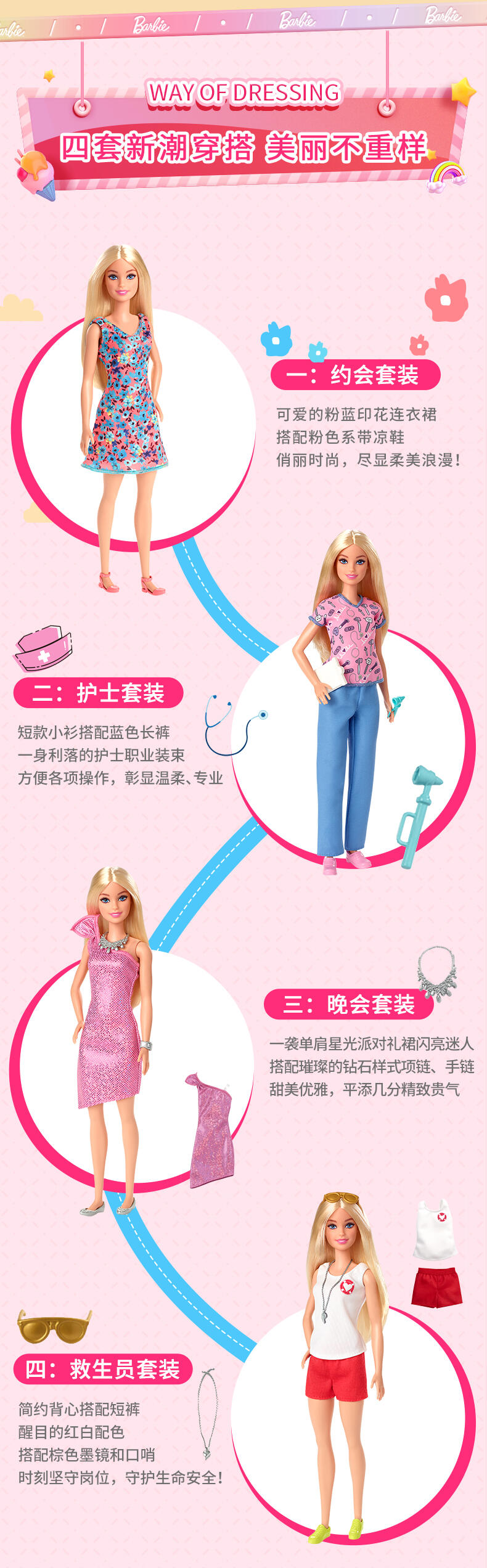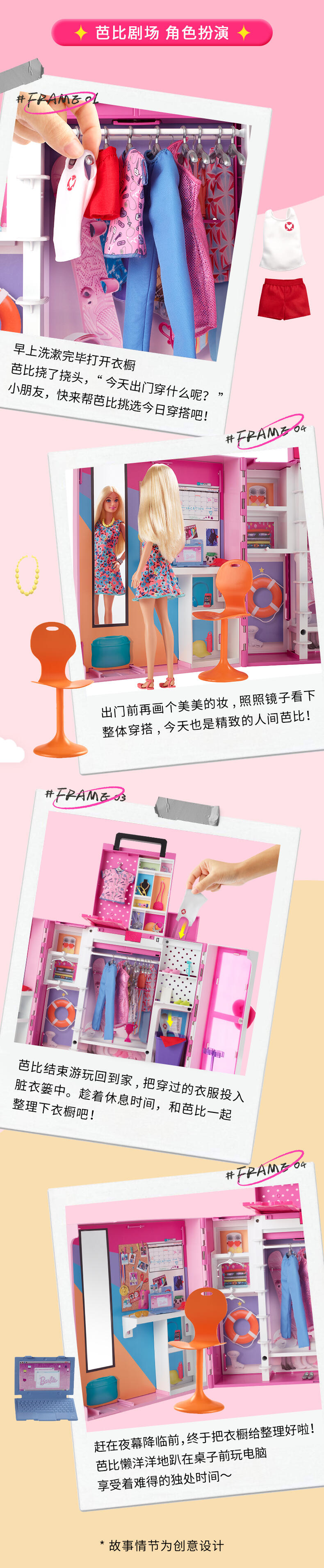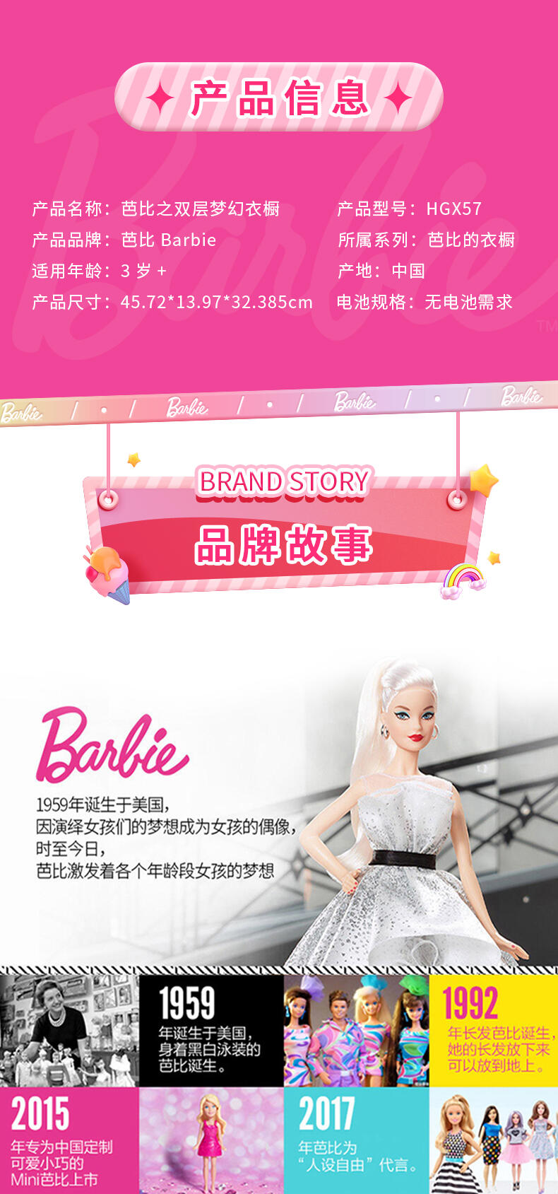 两层衣柜为衣橱拓展了更多的空间,粉红色衣柜可推拉门更好的利用空间,最右边增加了试衣镜,最左边增加了新潮系列的特征;包含四整套服装,涵盖不同时间不同场合;含30多个配件,可以为芭比搭配不同风格的衣服。 两层衣柜为衣橱拓展了更多的空间,粉红色衣柜可推拉门更好的利用空间,最右边增加了试衣镜,最左边增加了新潮系列的特征; 包含四整套服装,涵盖不同时间不同场合; 含30多个配件,可以为芭比搭配不同风格的衣服。