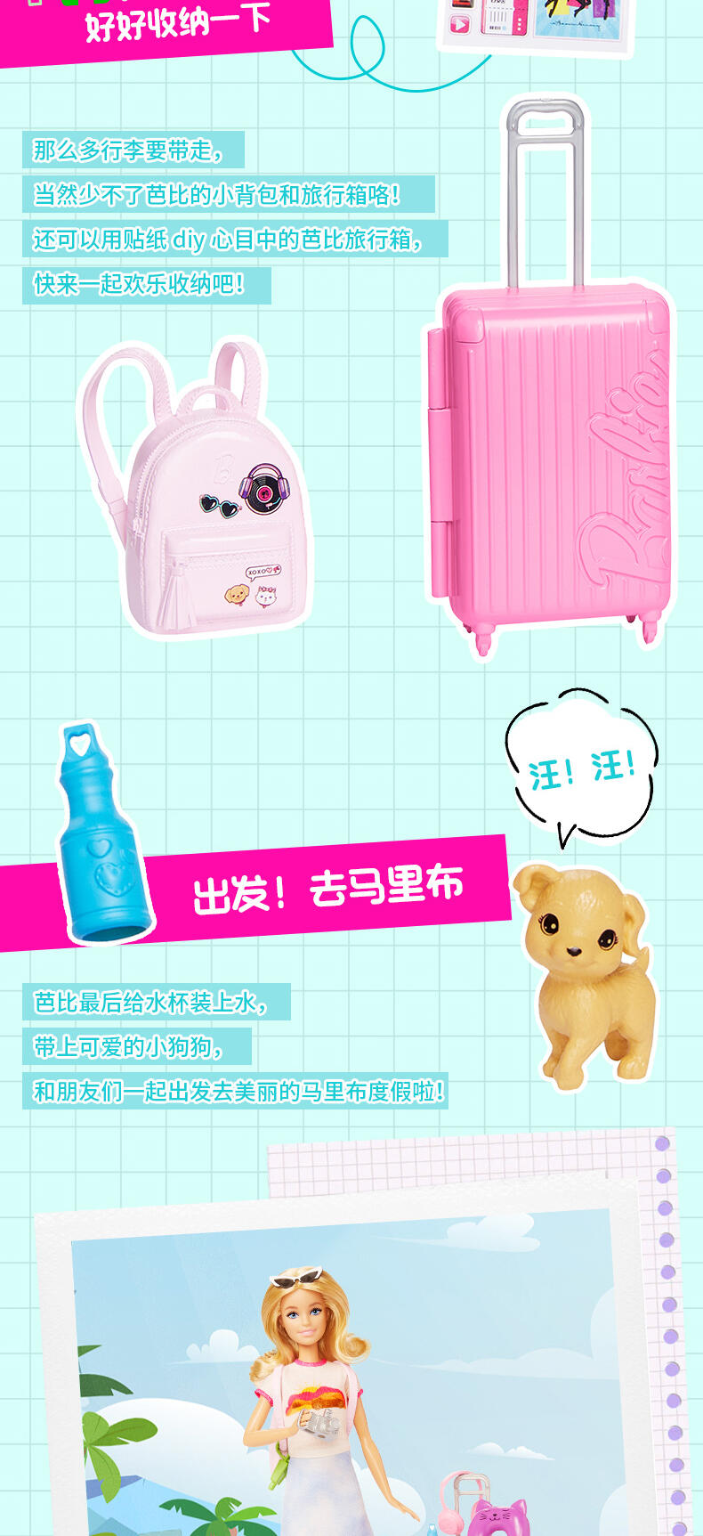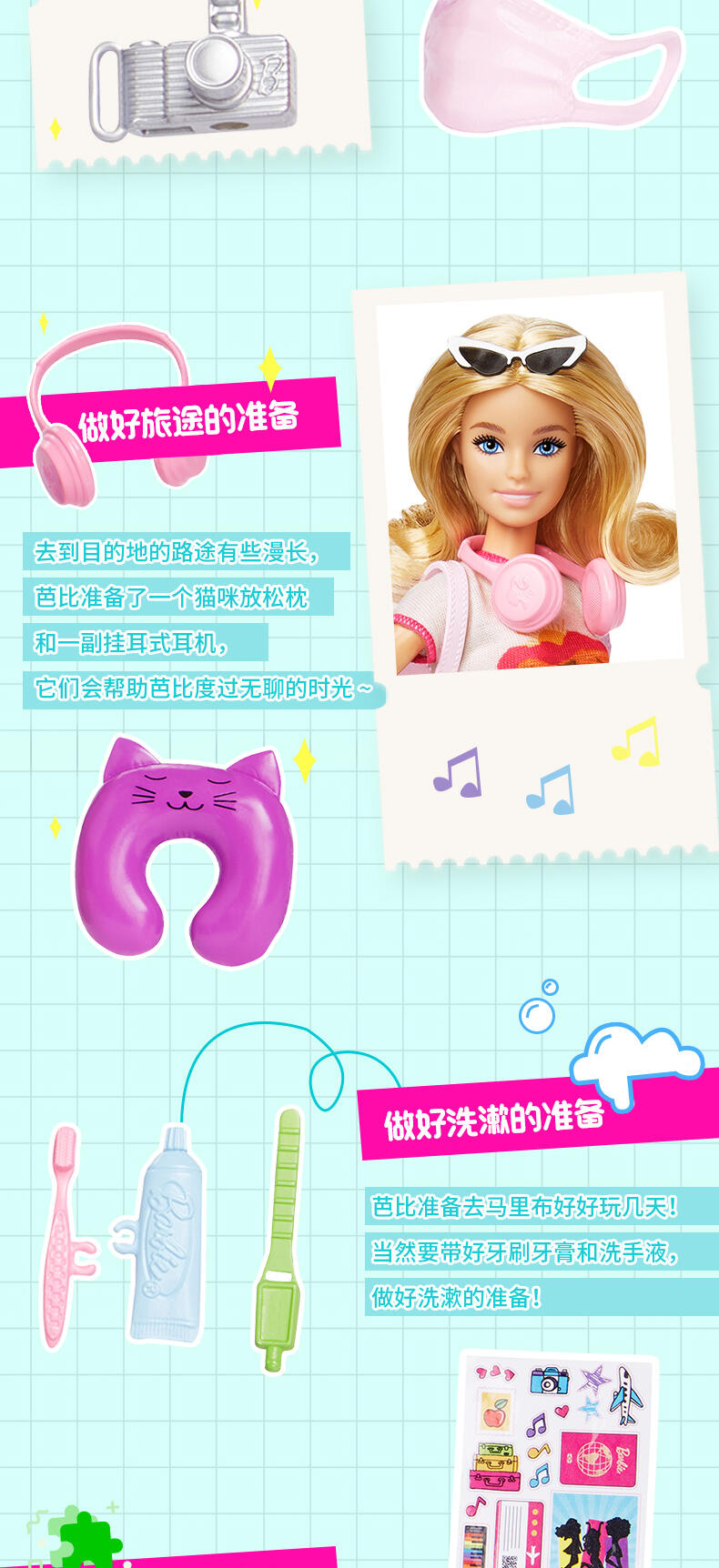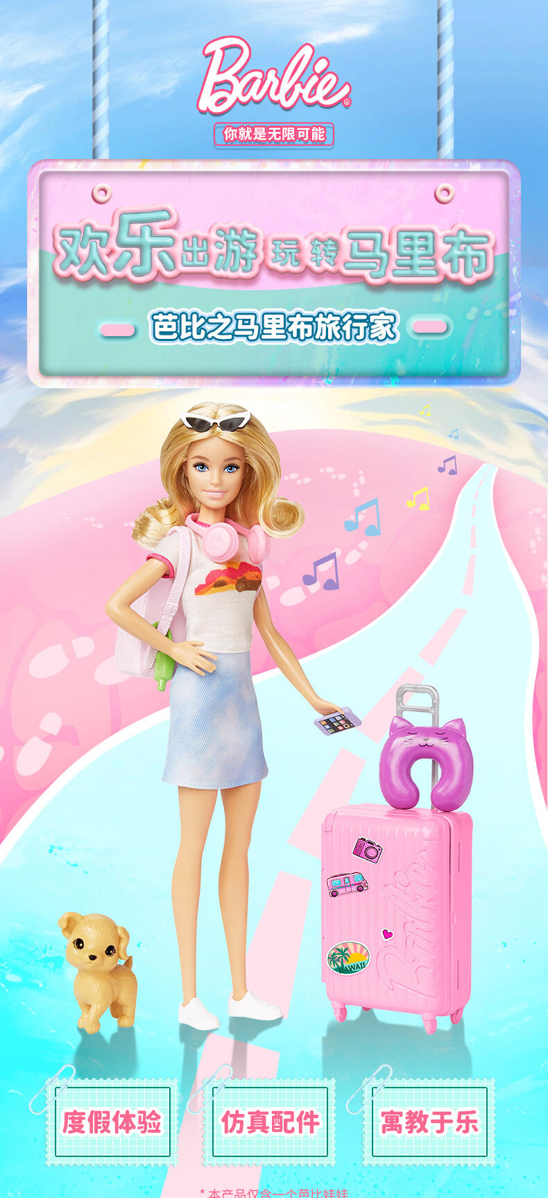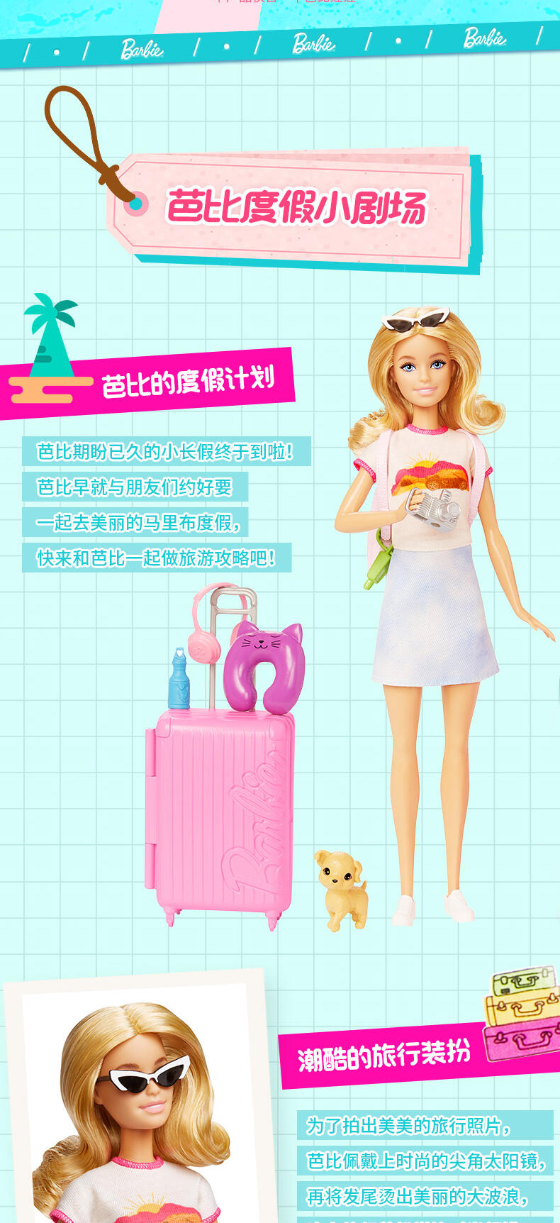 准备和芭比一起玩转马里布! 这次芭比穿着水洗牛仔裙和加州风格 加州沙漠风格衬衫 和 白色运动鞋;玩具包含 14个配件