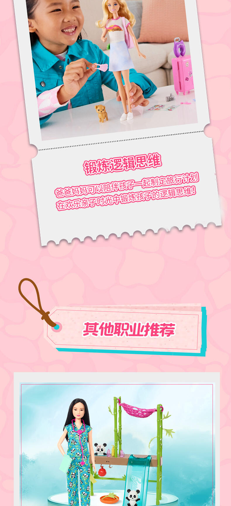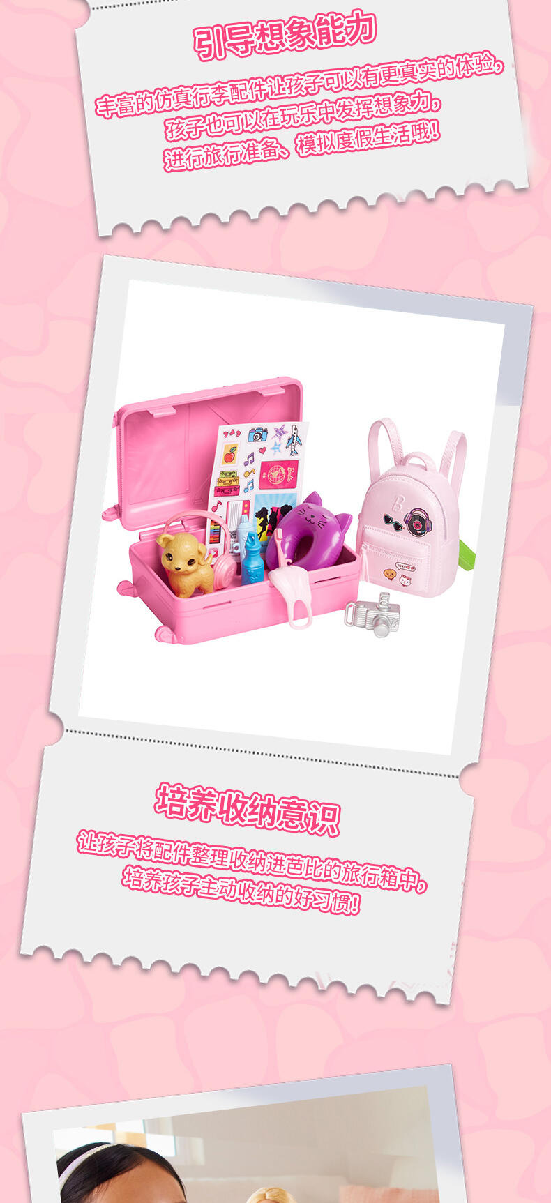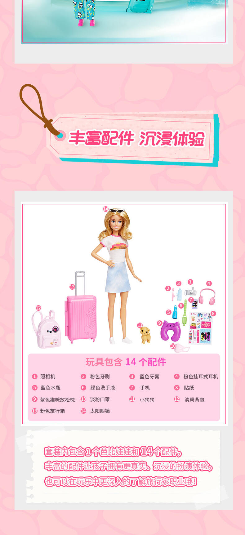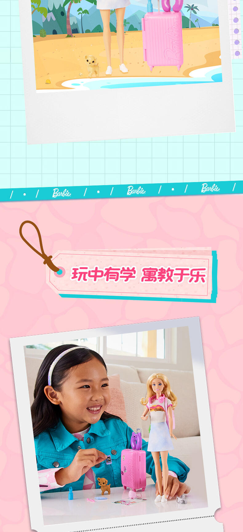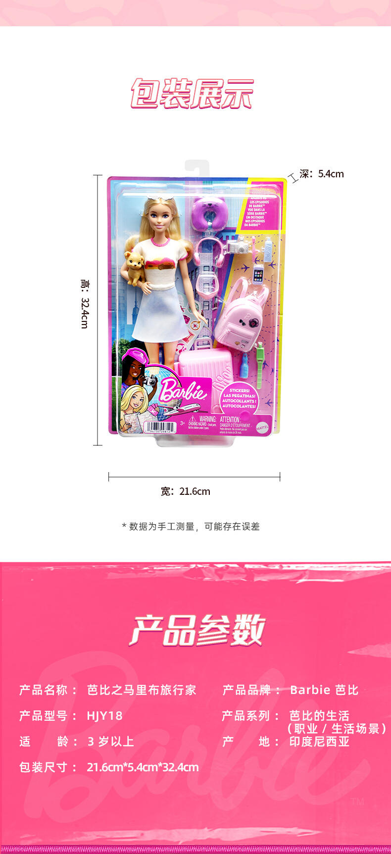 准备和芭比一起玩转马里布! 这次芭比穿着水洗牛仔裙和加州风格 加州沙漠风格衬衫 和 白色运动鞋;玩具包含 14个配件