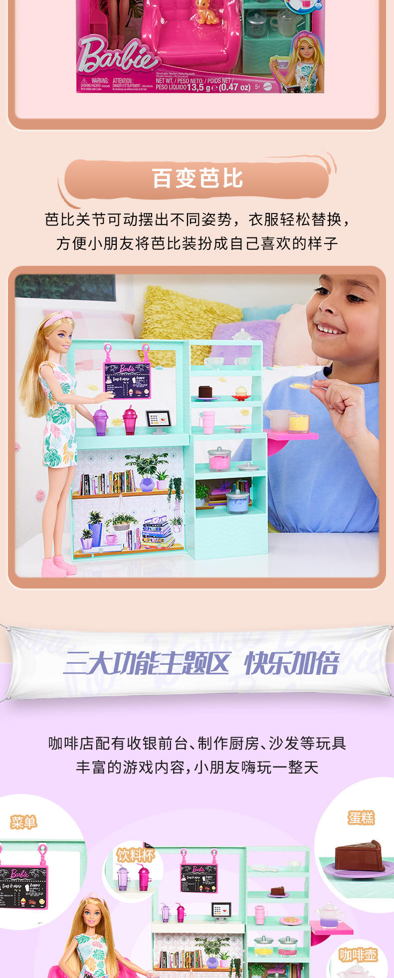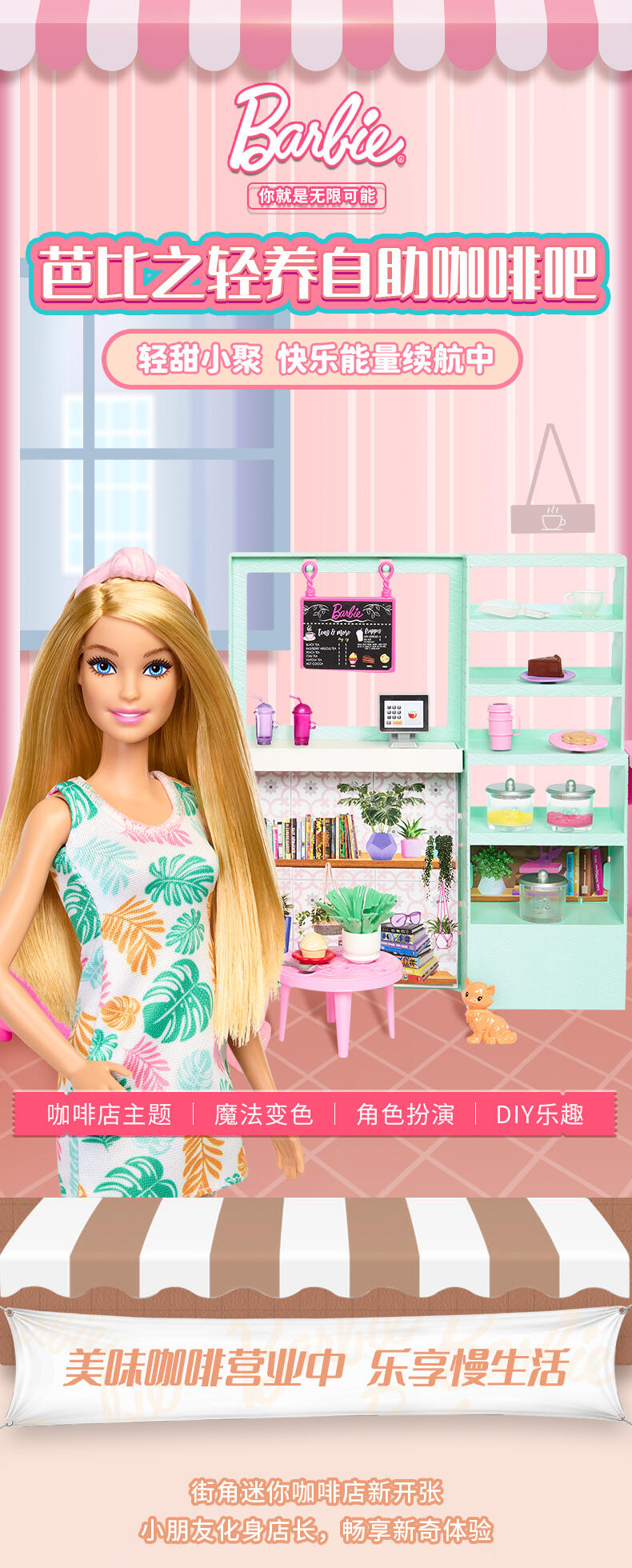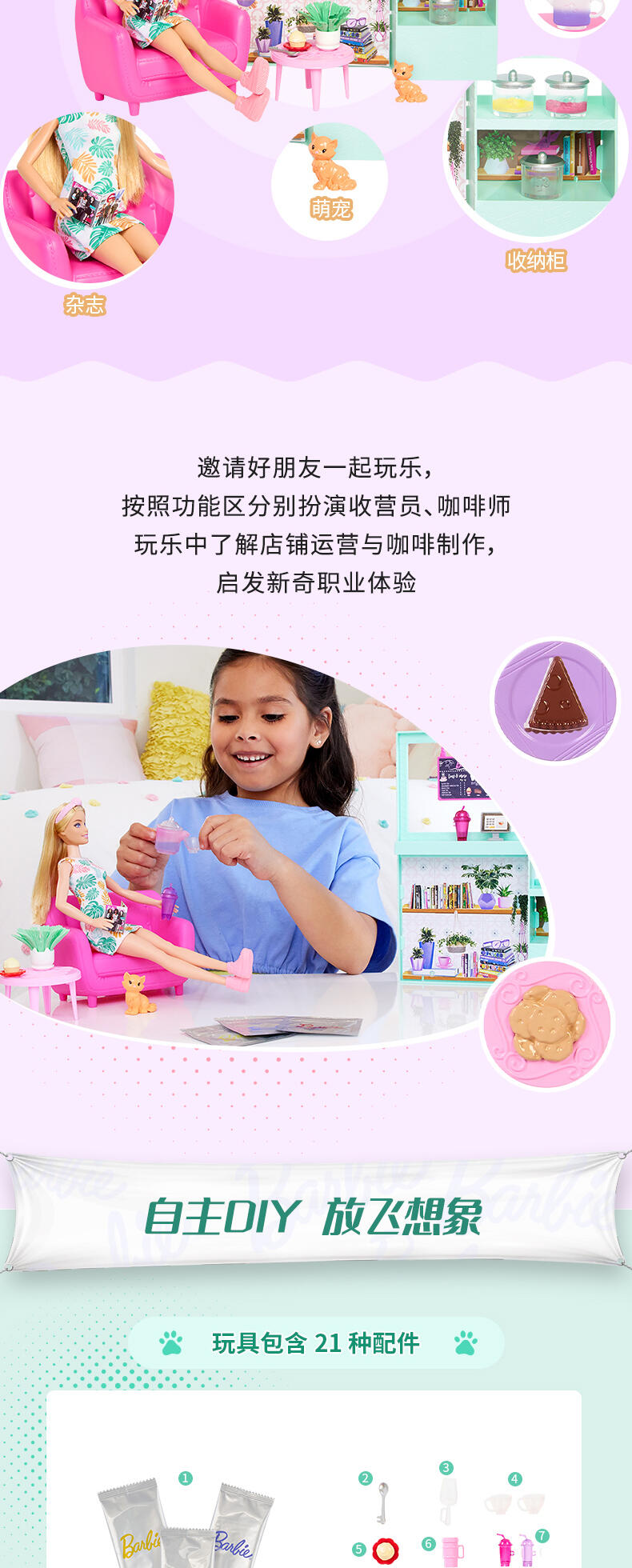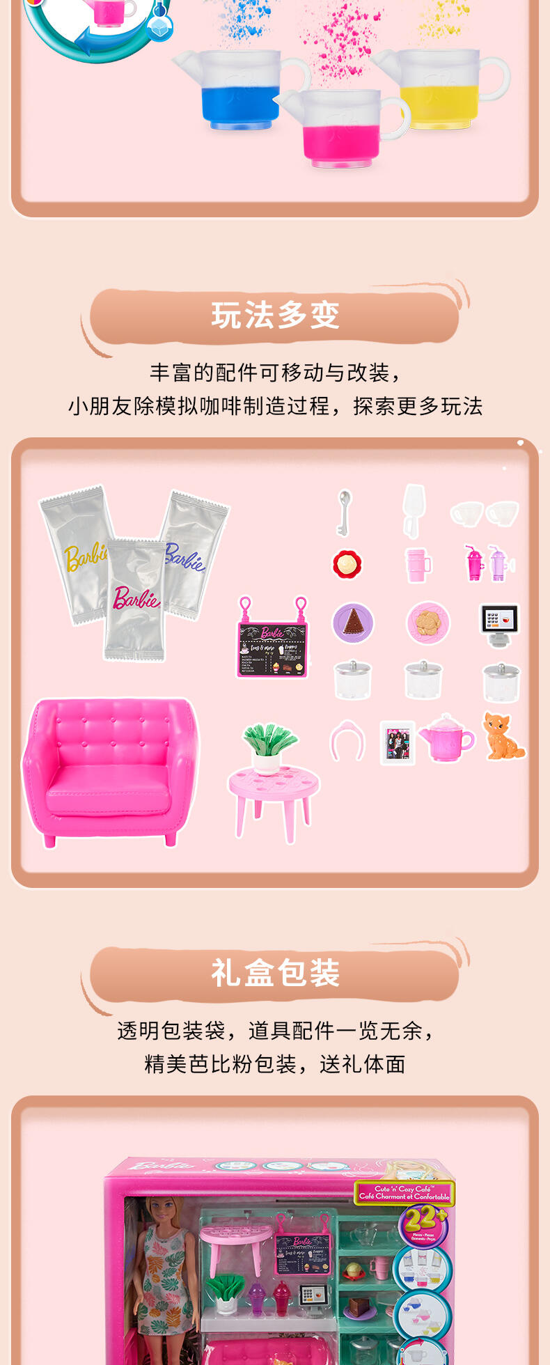 新轻养自助咖啡吧套装,包括娃娃、可溶解的滤纸和20+故事性配件。可实现制作和销售咖啡与茶水的游戏功能.茶水/咖啡具有变色功能:选择可溶解的滤纸颜色,并倒入茶壶内,加入水溶解,创造独一无二的饮品。混合和匹配颜色来创造不同类型的饮料。.神奇的感温变色功能:使用冰水时,茶壶的颜色会改变。.包括20+配件。1个茶壶,3罐变色纸,1个勺子,2个杯子,2个波霸奶茶杯,1盘饼干,1盘纸杯蛋糕,1盘蛋糕,1个绿植,1个蜜糖熊,1个收银机,1个宠物猫,1本书,1个沙发,1个边桌和1个发带