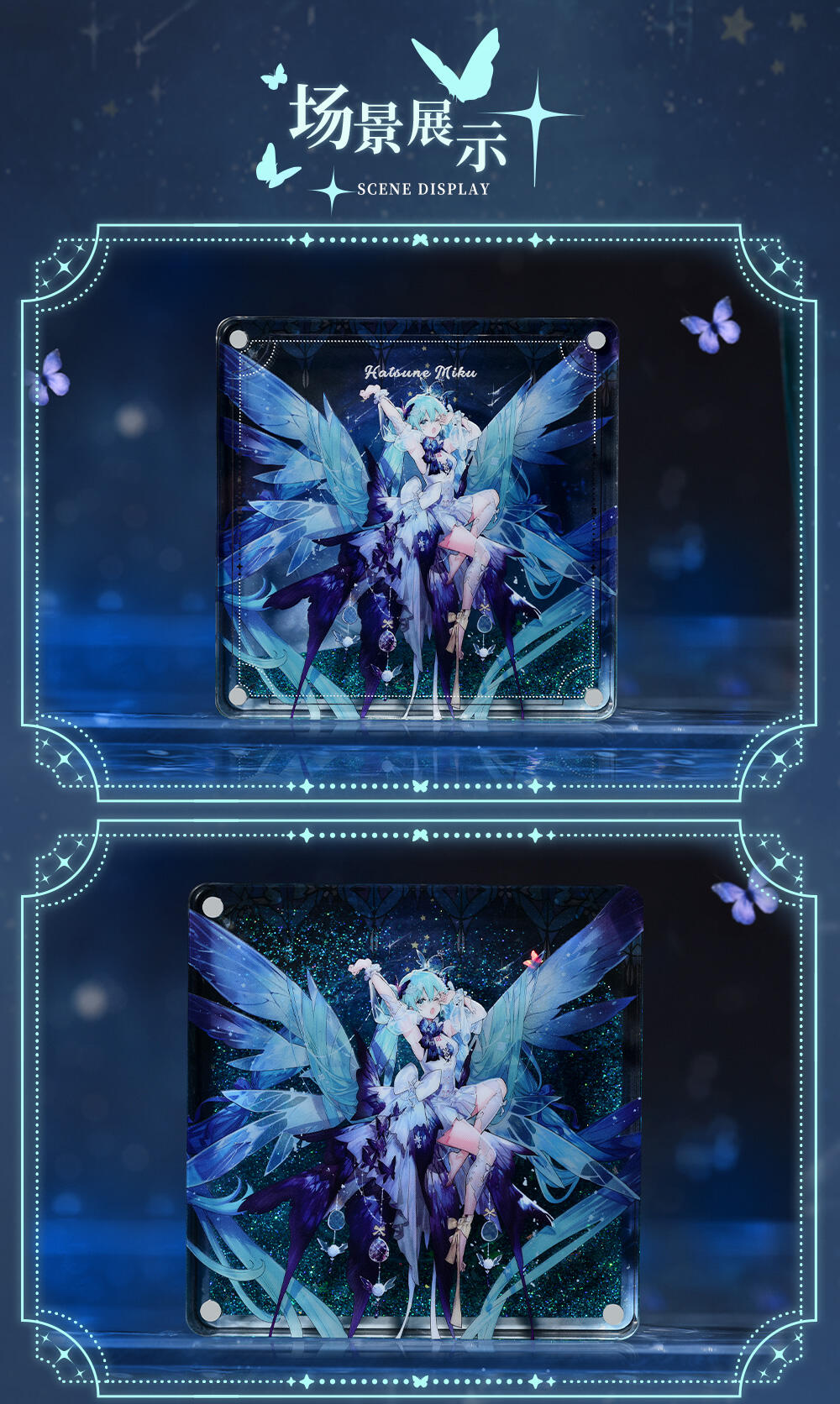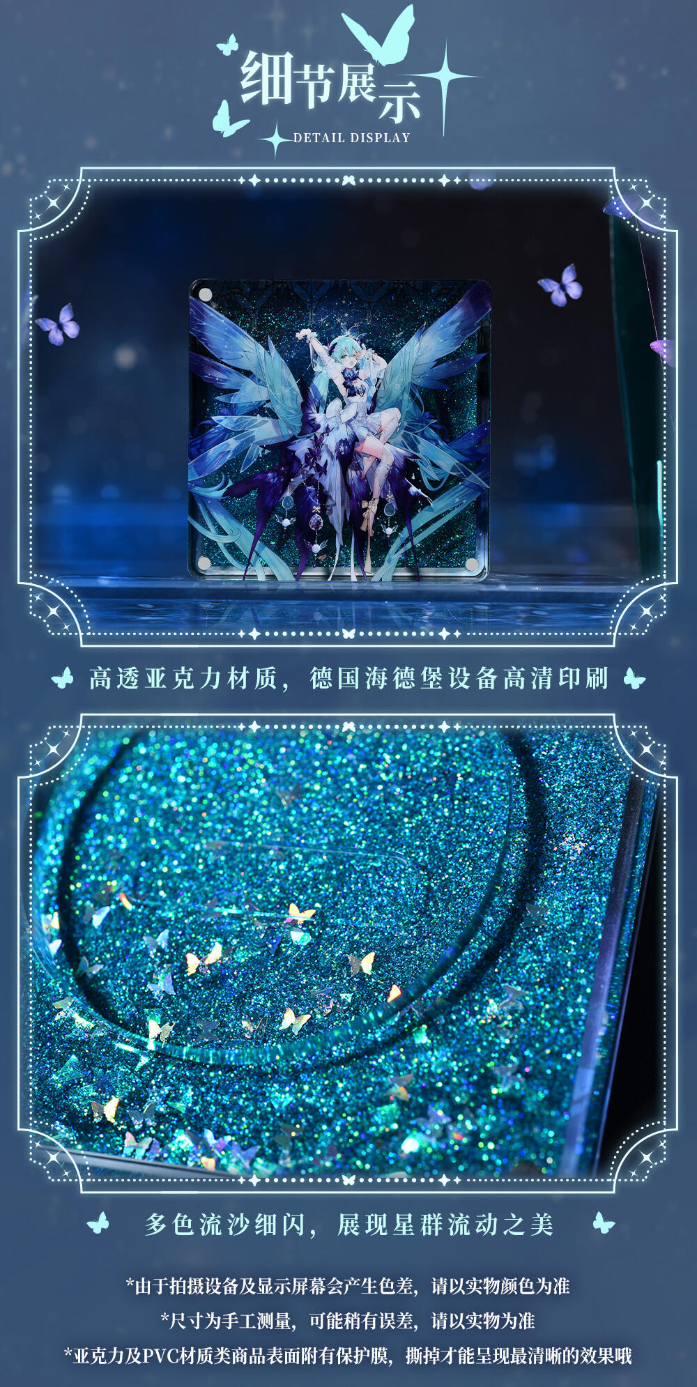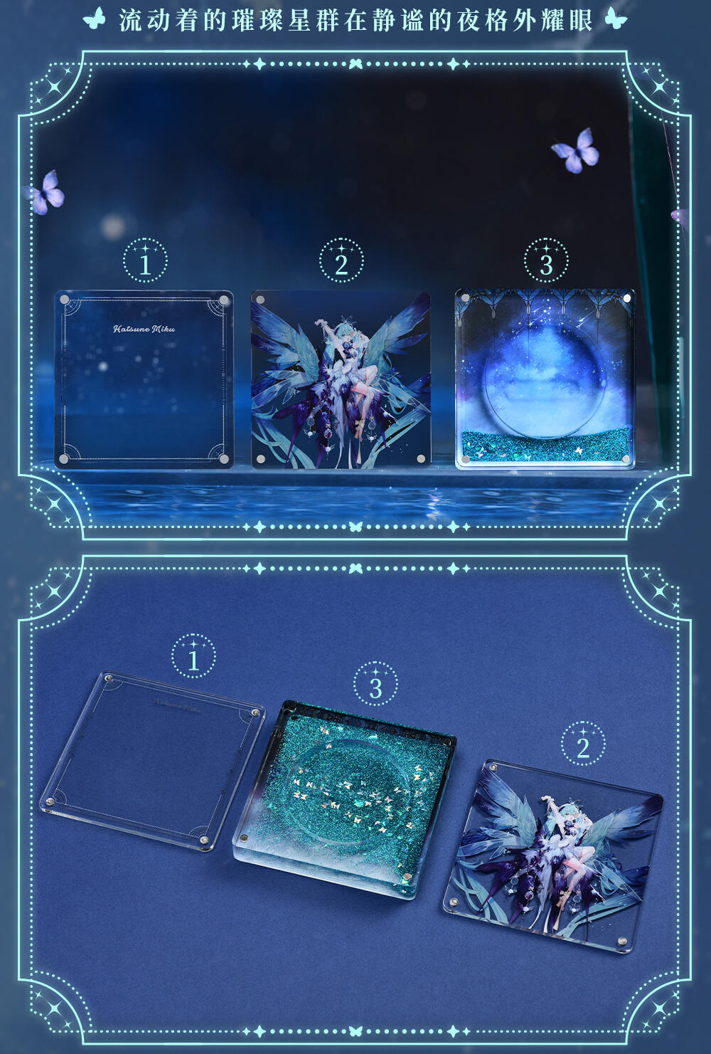高透亚克力材质,图案清晰,多色流沙细闪,展现星群流动之美。制作精美。刚刚苏醒的MIKU伸着懒腰打着哈欠的可爱模样。多个透层增加更多玩法,是流沙摆件更是徽章展示盒。