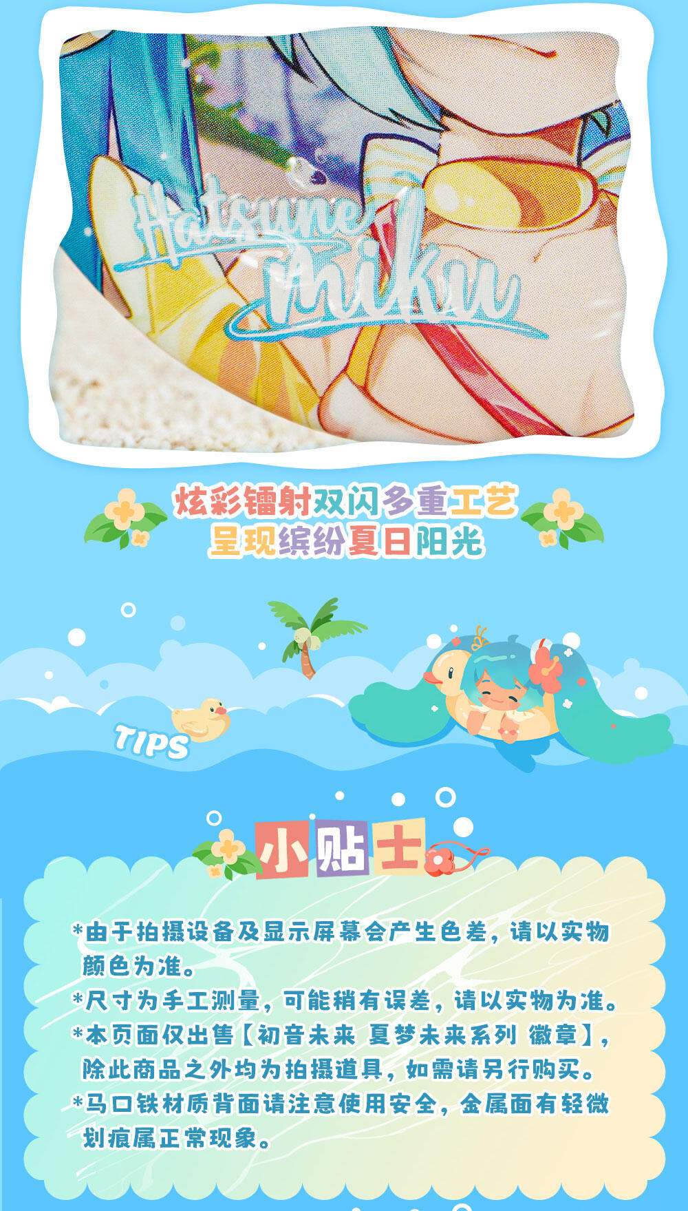 享受着灿烂夏日,元气MIKU治愈呈现。优质PET片印刷,色彩还原艳丽。优质马口铁,耐磨实用。
