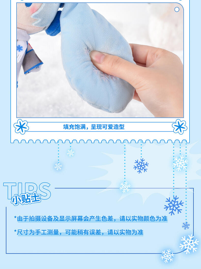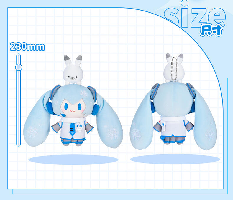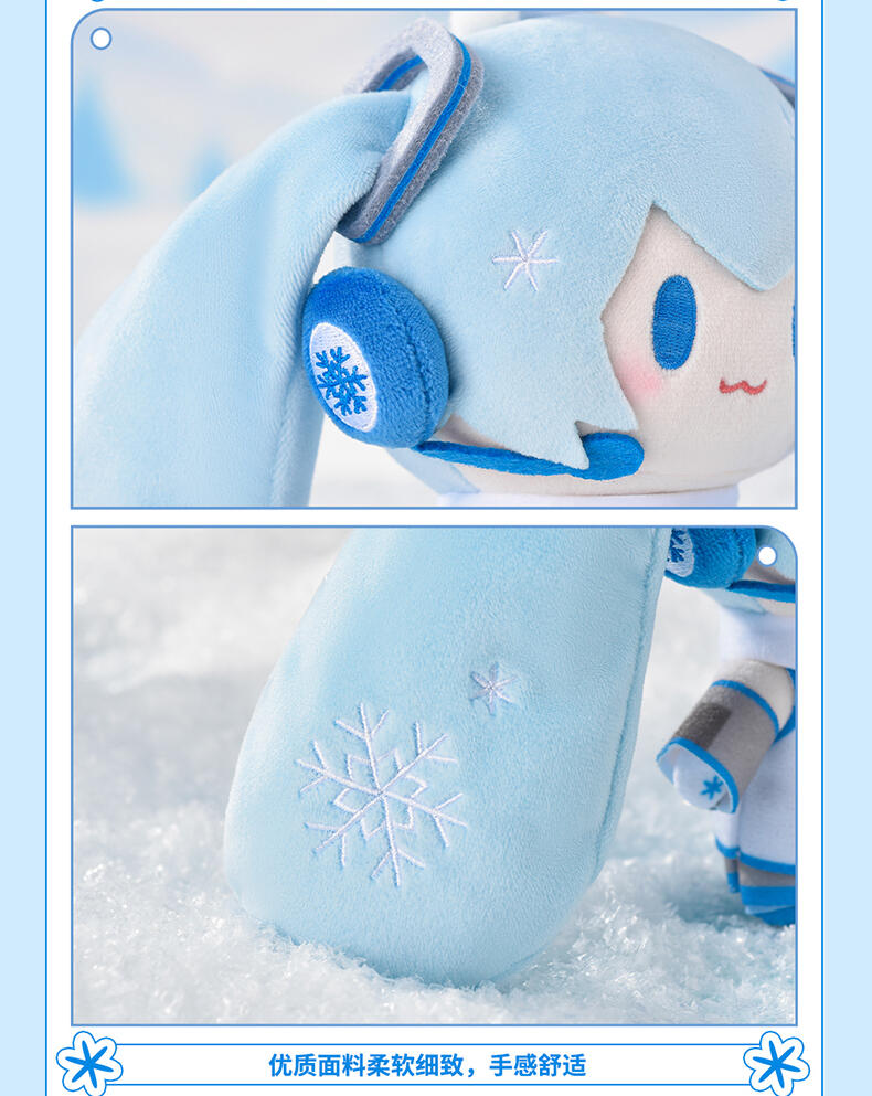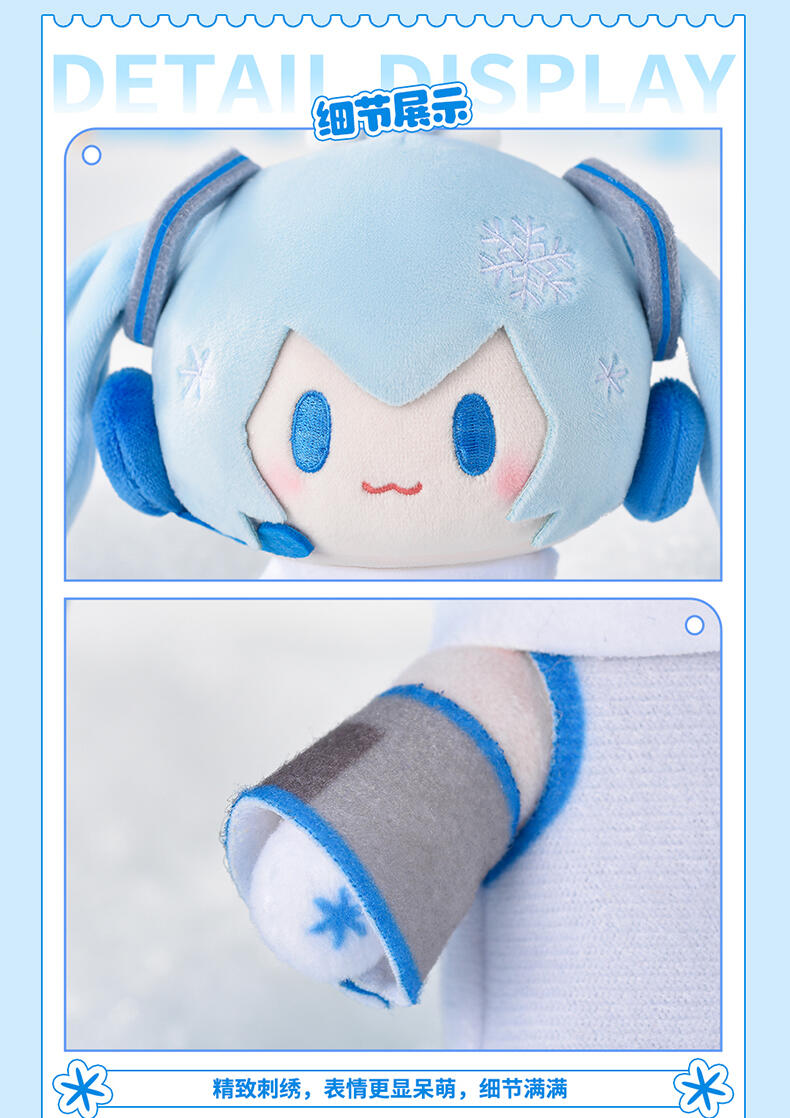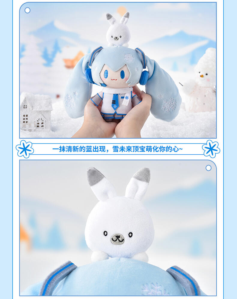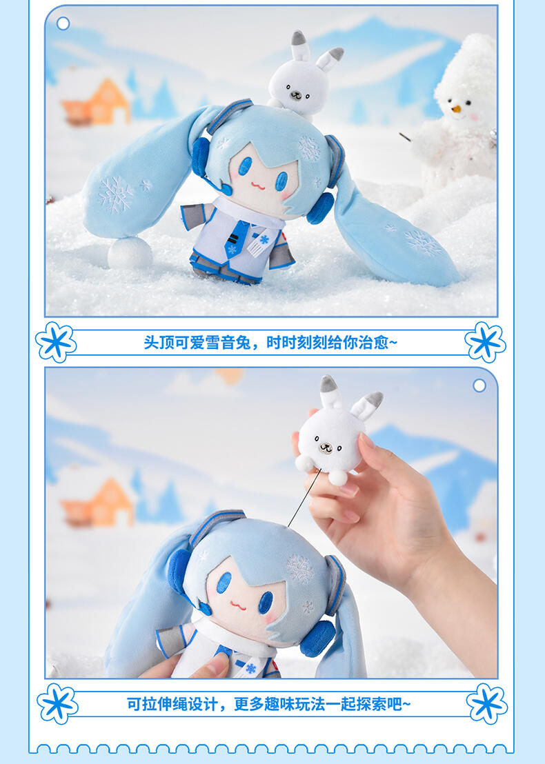 一抹清新的蓝出现。雪未来顶宝萌化你的心。头顶可爱雪音兔,时时刻刻给你治愈。可拉伸绳设计,精致刺绣,表情更显呆萌,细节满满。优质面料柔软细致,手感舒适,填充饱满。
