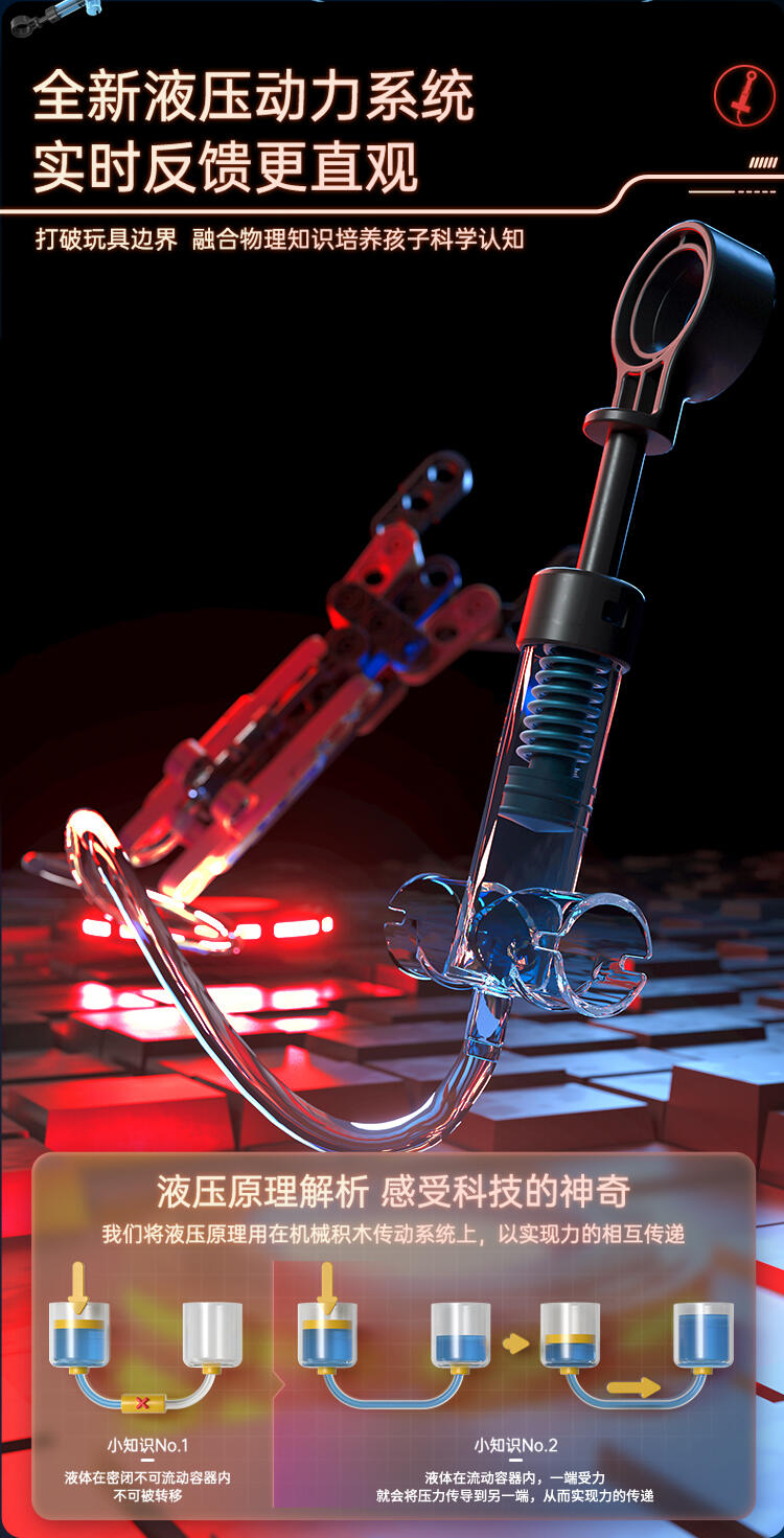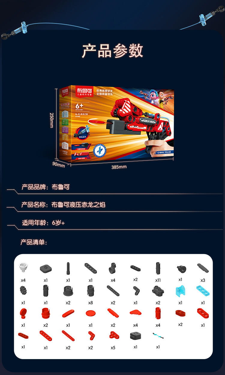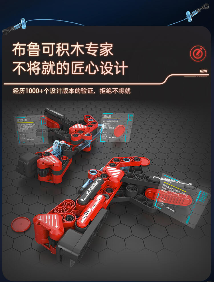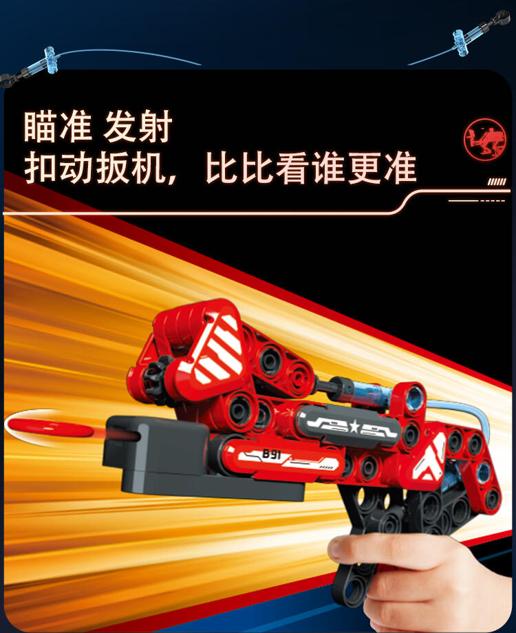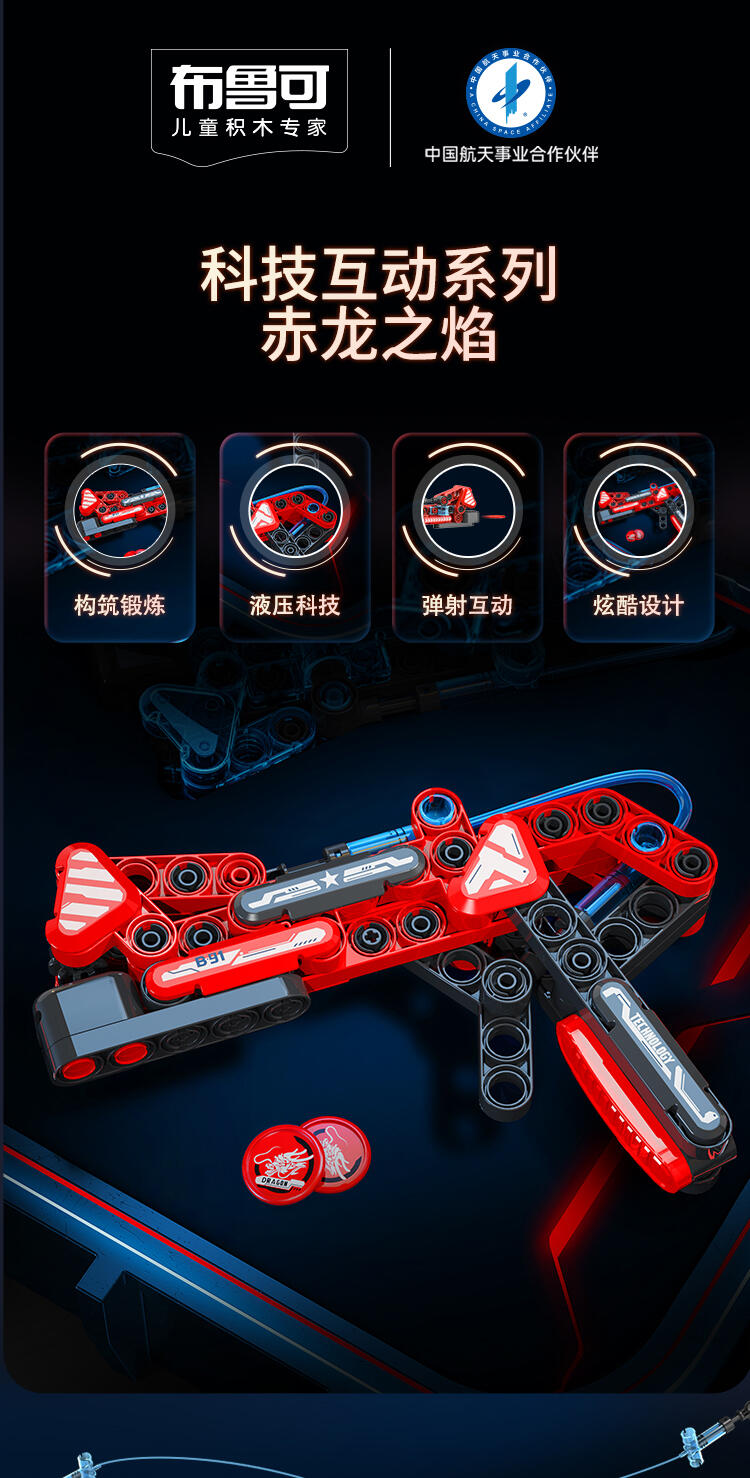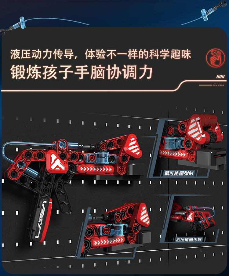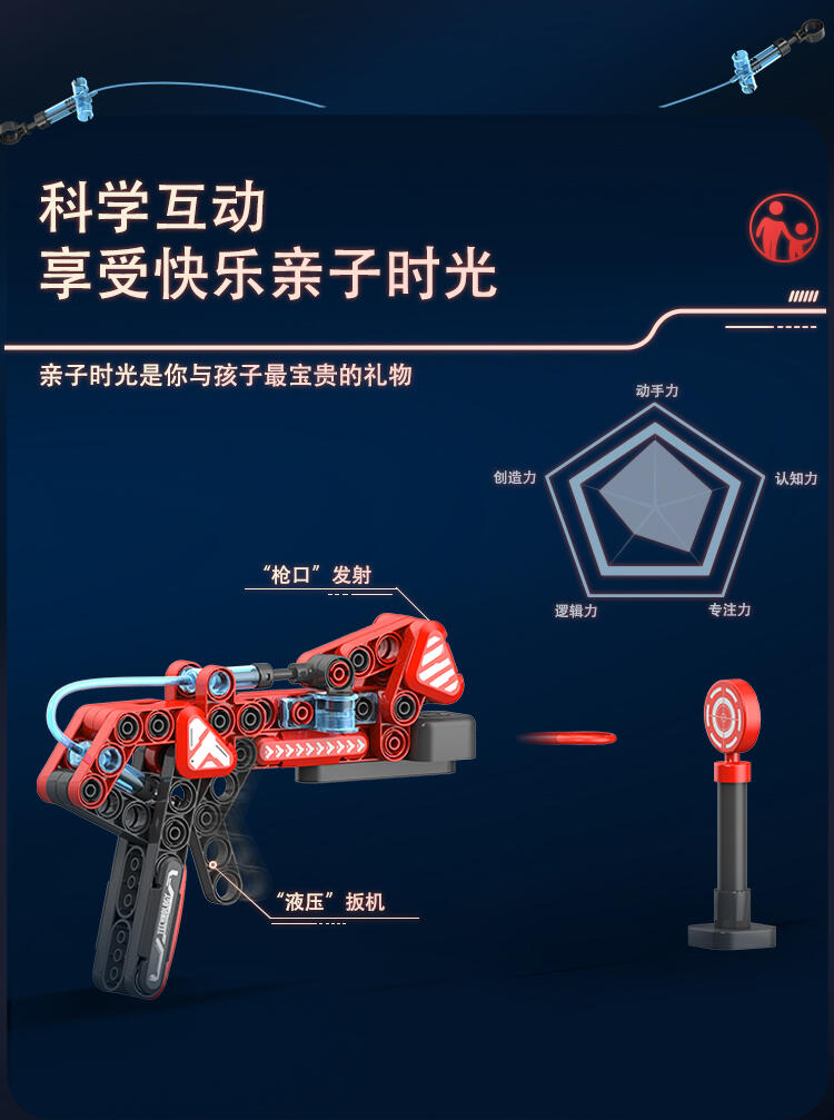 采用液压原理控制的一款玩具枪,同时也是通过积木拼装起来的一款玩具枪(非整体);造型多变,可随心改变枪的外观;独特的圆盘子弹,避免对儿童的伤害;物理原理,让孩子边学习边娱乐