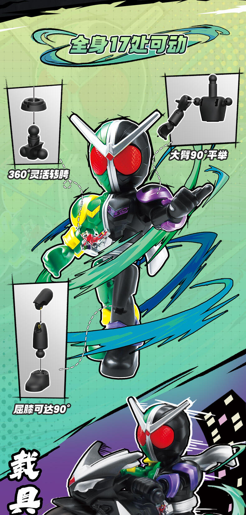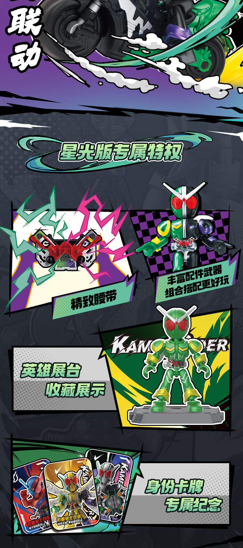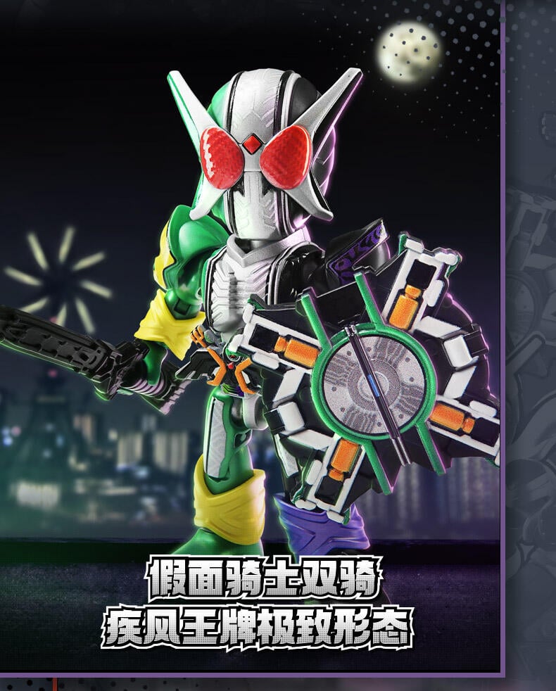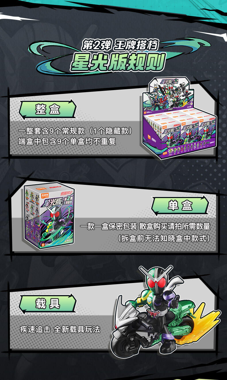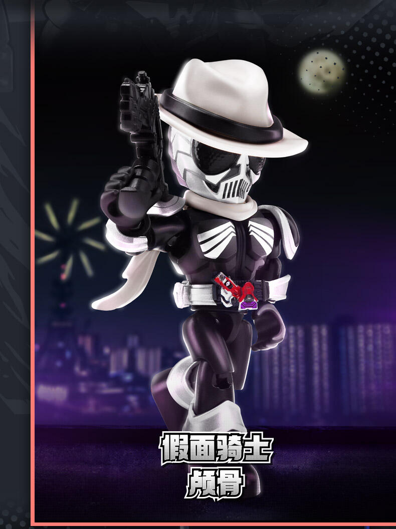 1、假面骑士IP 2、盲盒属性 3、收藏属性 4、积木人体系,多处关节可动 5、概率获得隐藏款