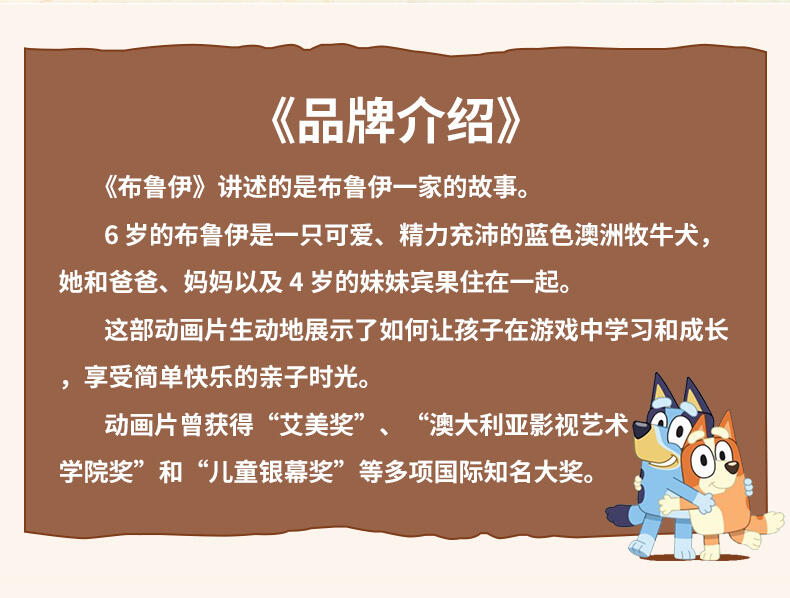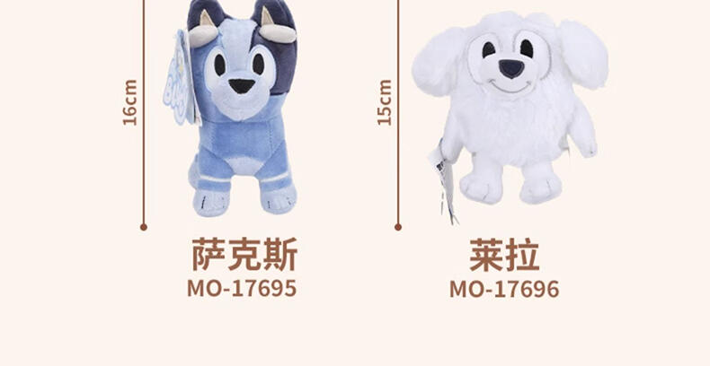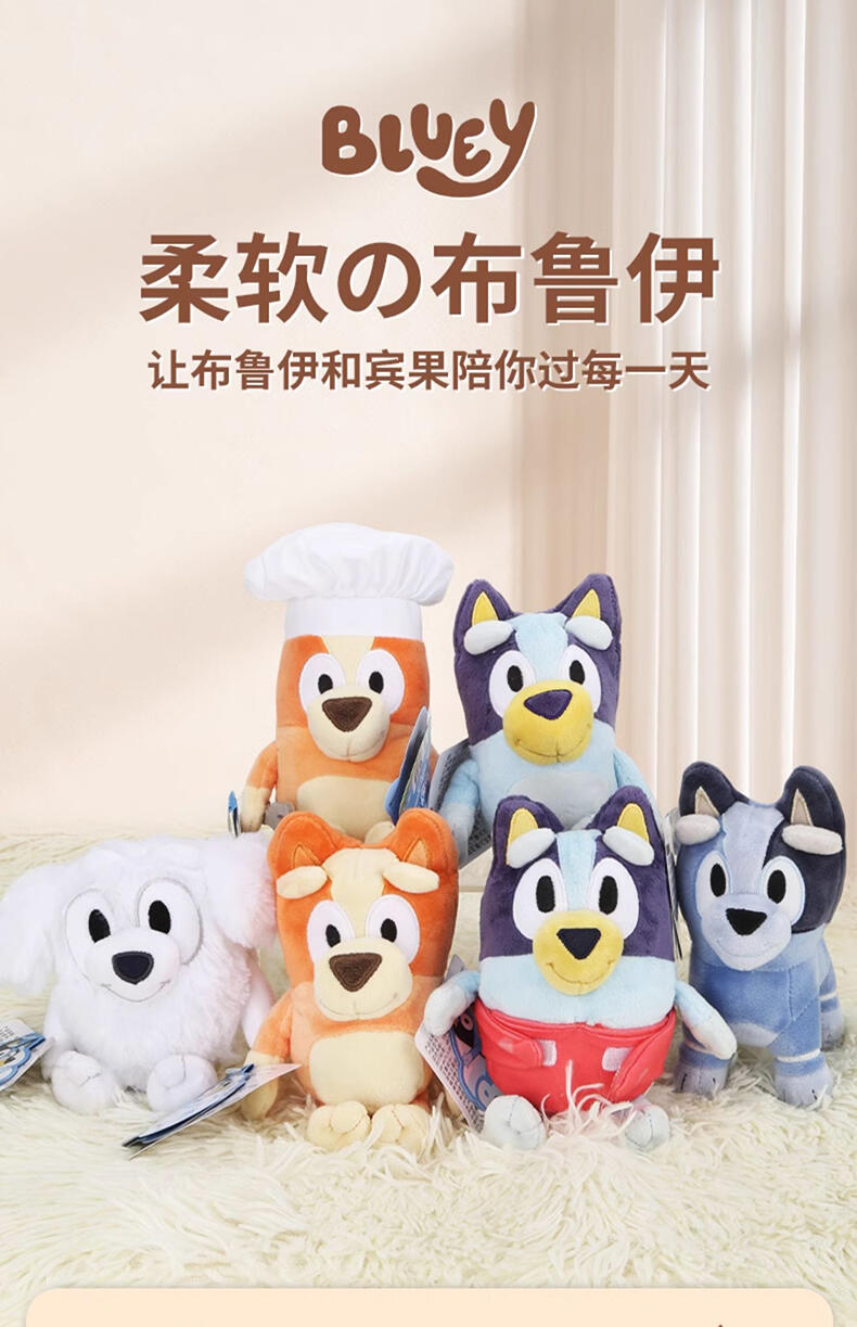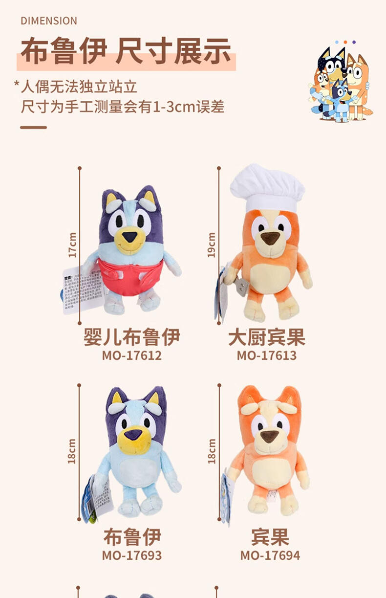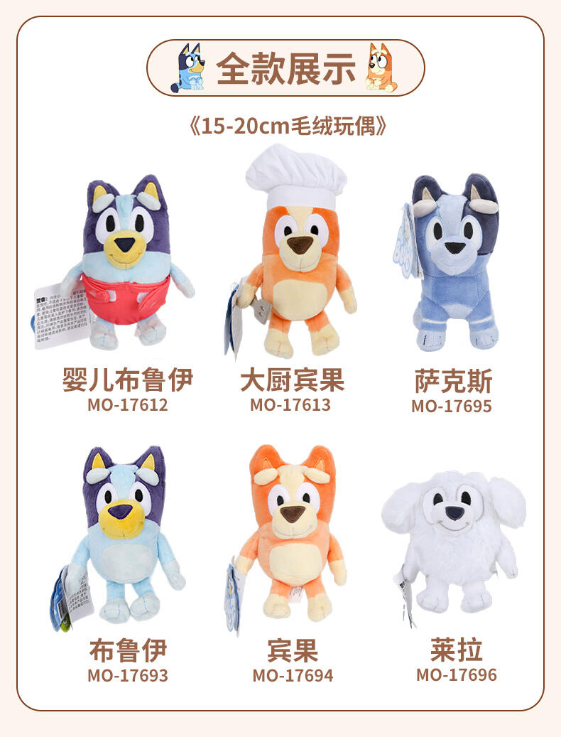 玩偶高度18cm~25cm,共有6款角色毛绒玩偶可供收集, 本次带来布鲁伊和宾果的新形象,还有两位好朋友!