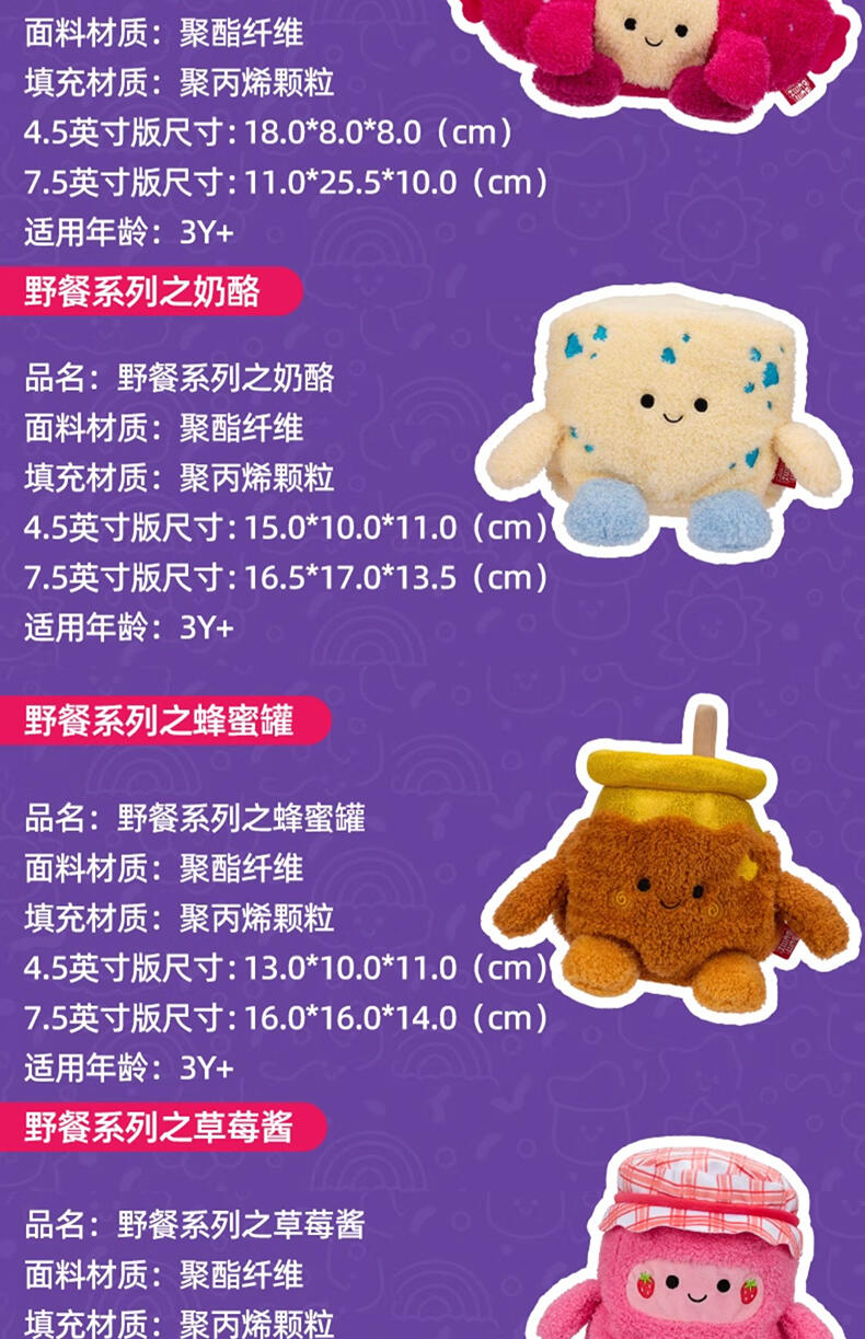 我是柔软的棒棒仔:各种超可爱毛绒;底部装有颗粒豆,有手感,有一定重量适合陈列嬉戏玩耍。我有美式潮流的个性:古怪奇特的拟人化设计,每个角色都是独特的个性,追逐流行文化。 我有很多主题和人物,请收藏我:主题系列毛绒,保证设计的丰富性和新鲜感,整合不同面料质地,具有很强的收藏属性。有植物、动物、食物、家居、生活方式等不同趣味款式。