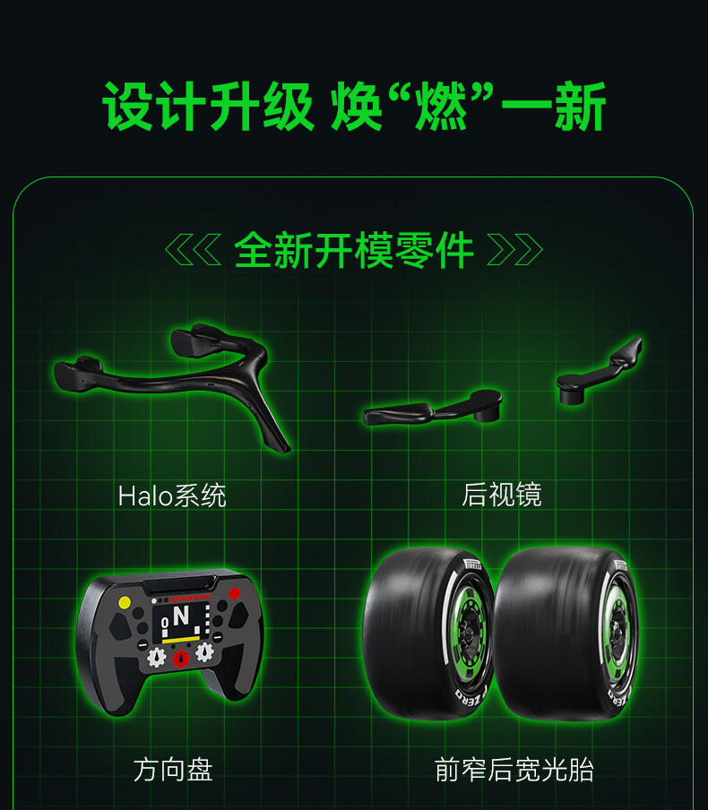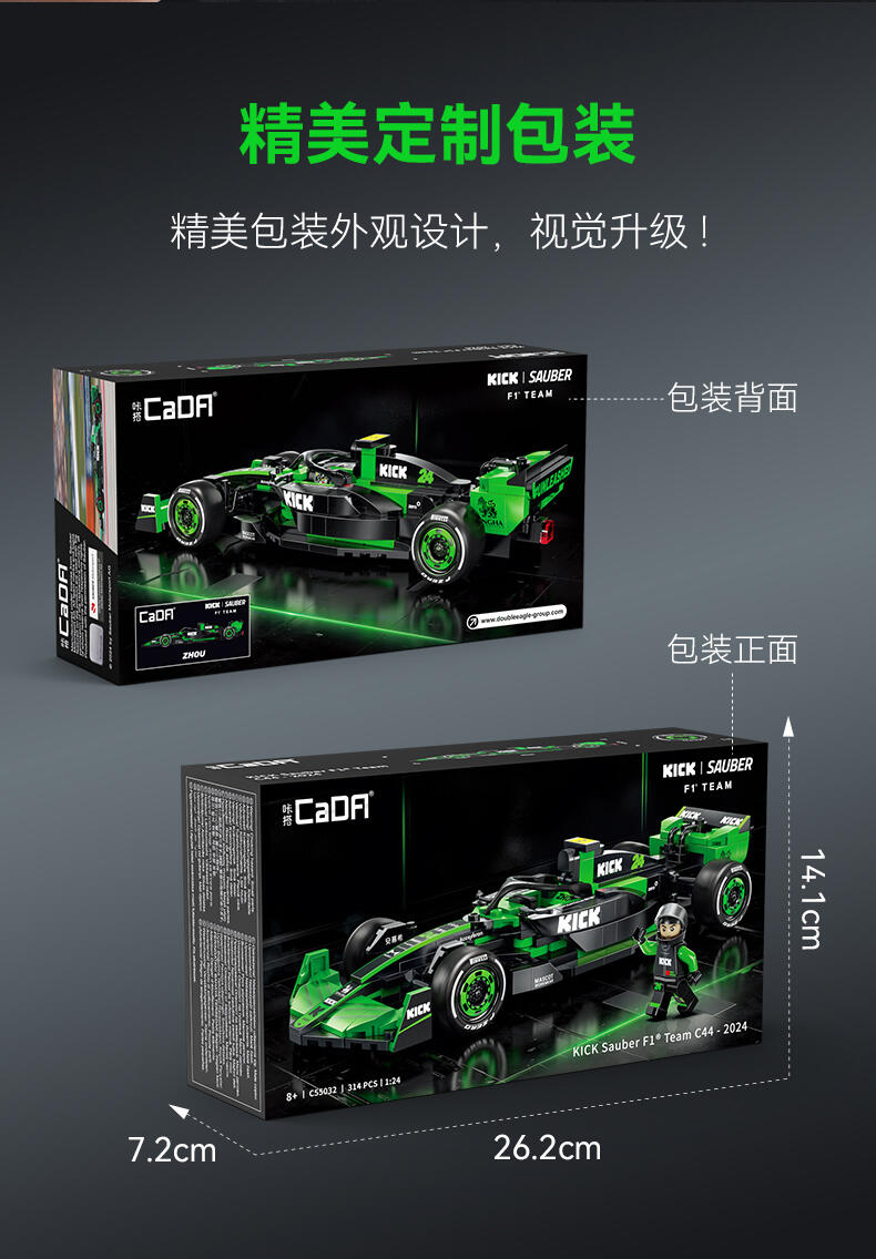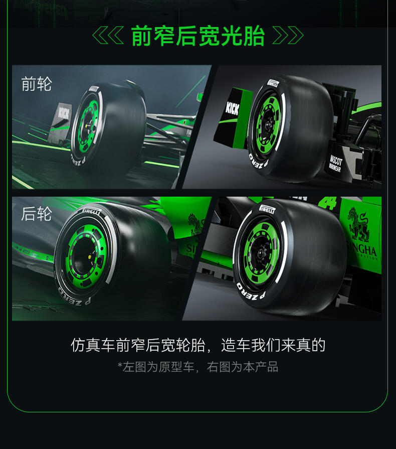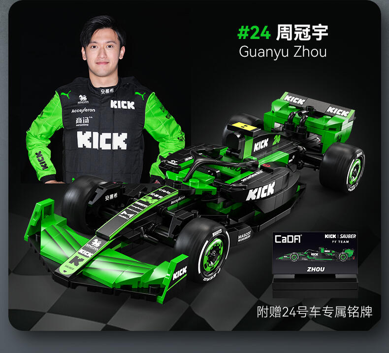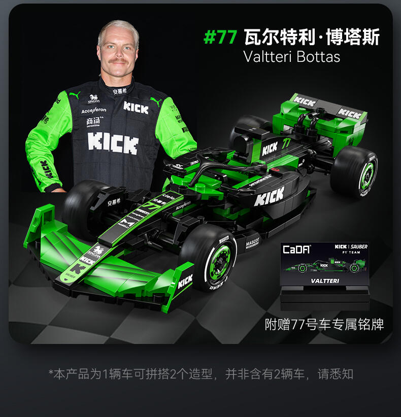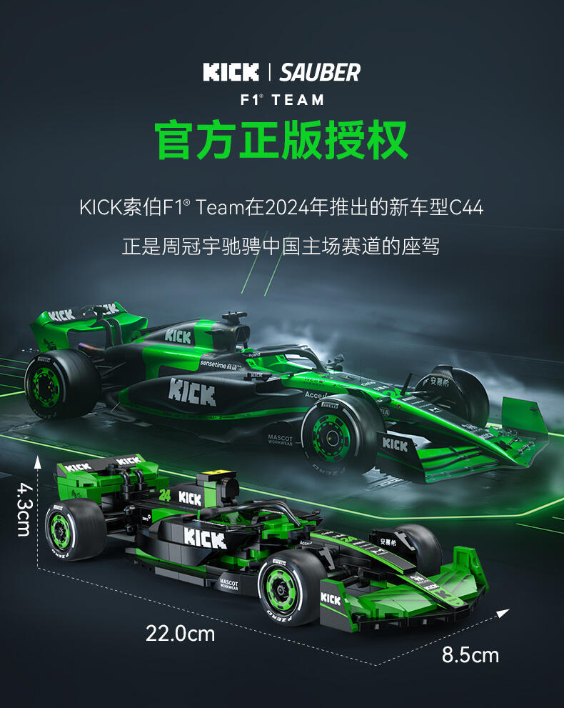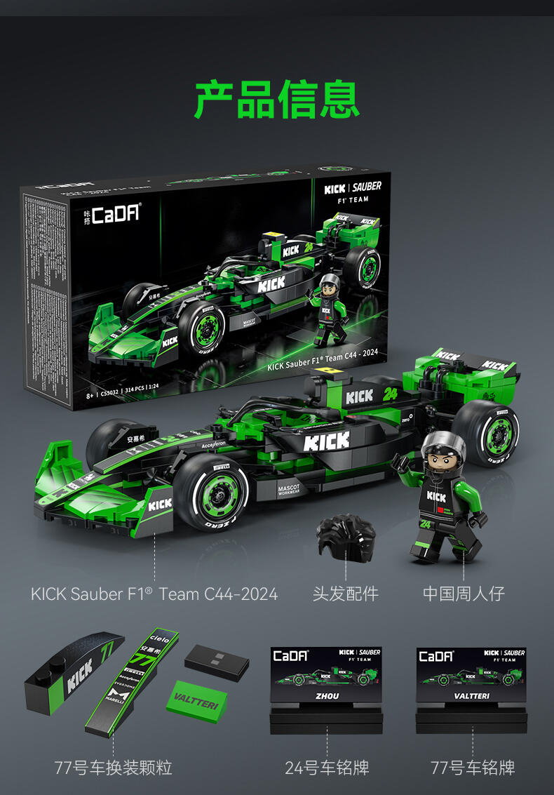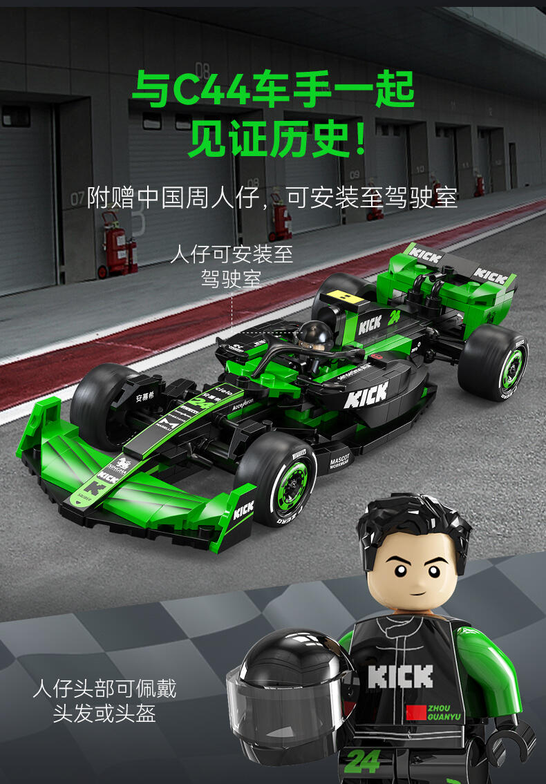 1、索伯"2024款F1赛车C44"正版授权,中国F1赛车手周冠宇24号专属座驾,积木还原精准比例为1:24; 2、两套车身涂装:周冠宇的24号车及博塔斯的77号车,车身涂装,满足不同粉丝群体及增加产品收藏意义; 3、车辆细节突出,赛车前翼/方向盘/防滚架/驾驶舱/尾翼等细节还原,车身上多处车队赞助商logo,均高清移印还原,外观夺目炫酷; 4、极致追求外观还原效果的开模件(方向盘、后视镜,人字拖)及前窄后宽的光头胎 ,进一步还原真车效果;