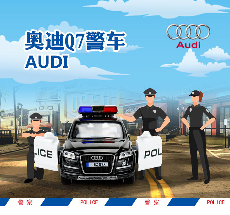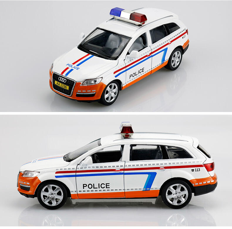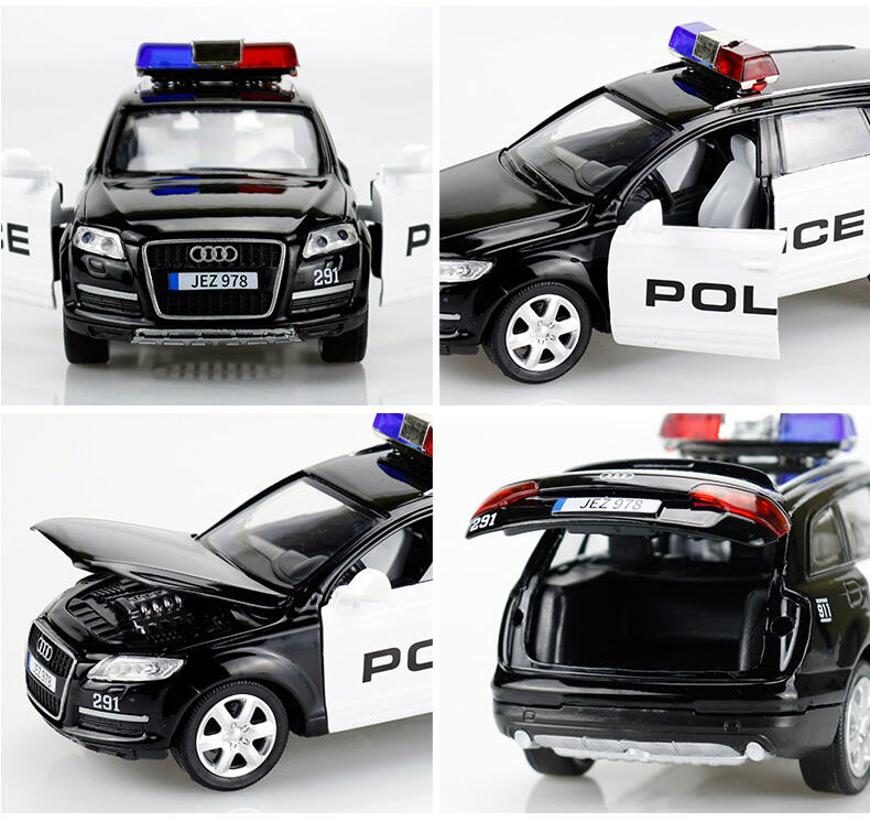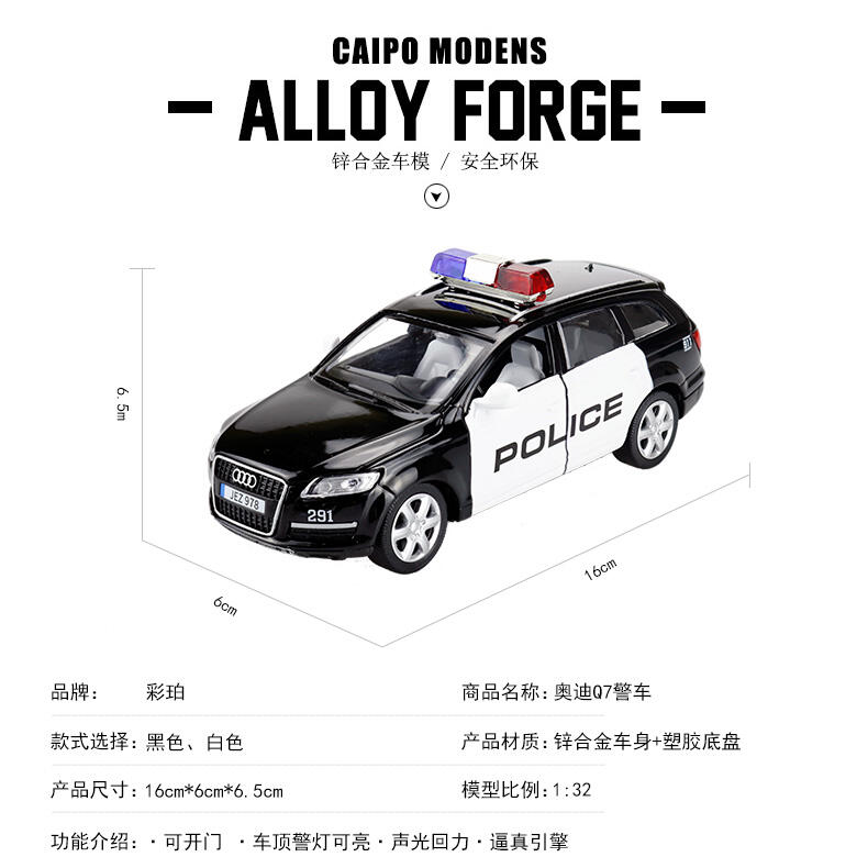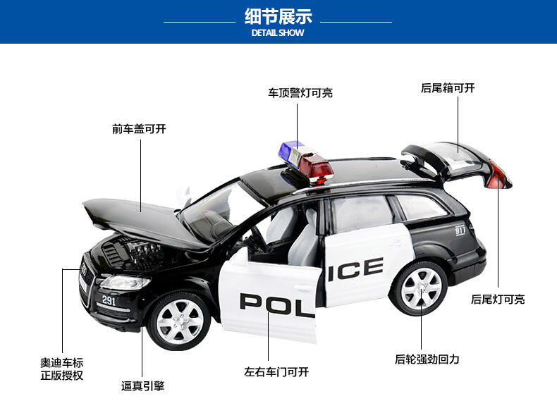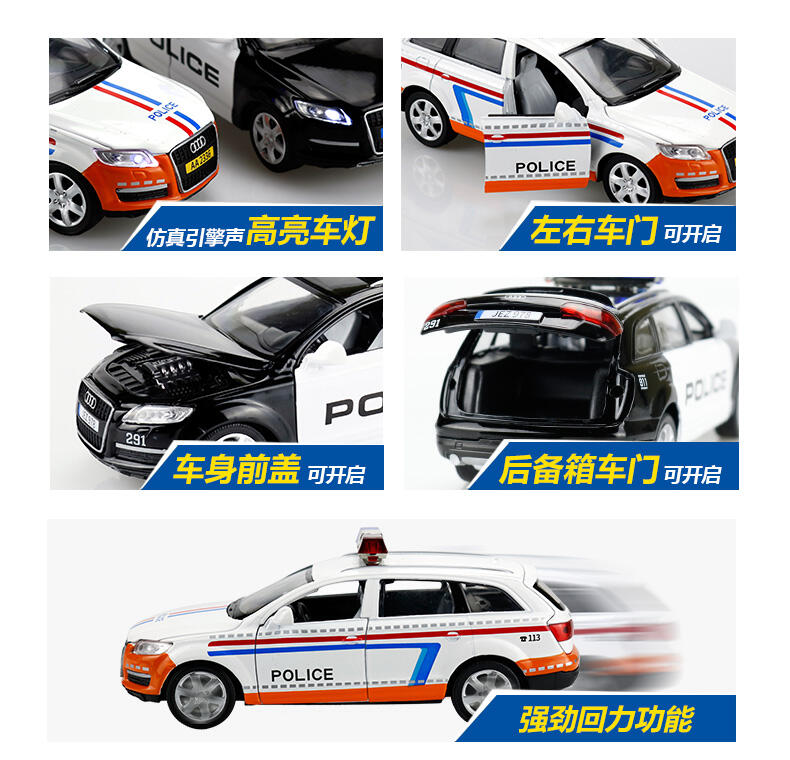 逼真警灯和警车声,逼真高亮车头车尾灯光,逼真引擎声,强劲回力功能,可自由开启车门,采用进口环保油漆,锌合金材料。