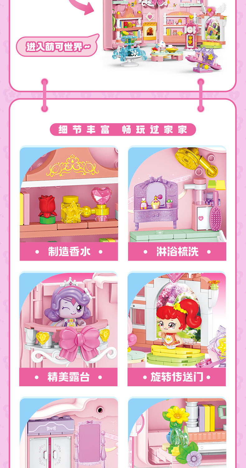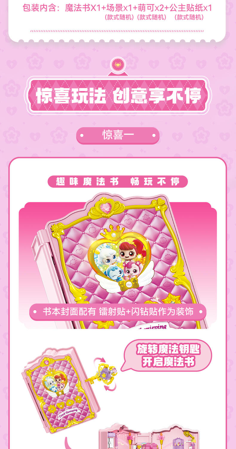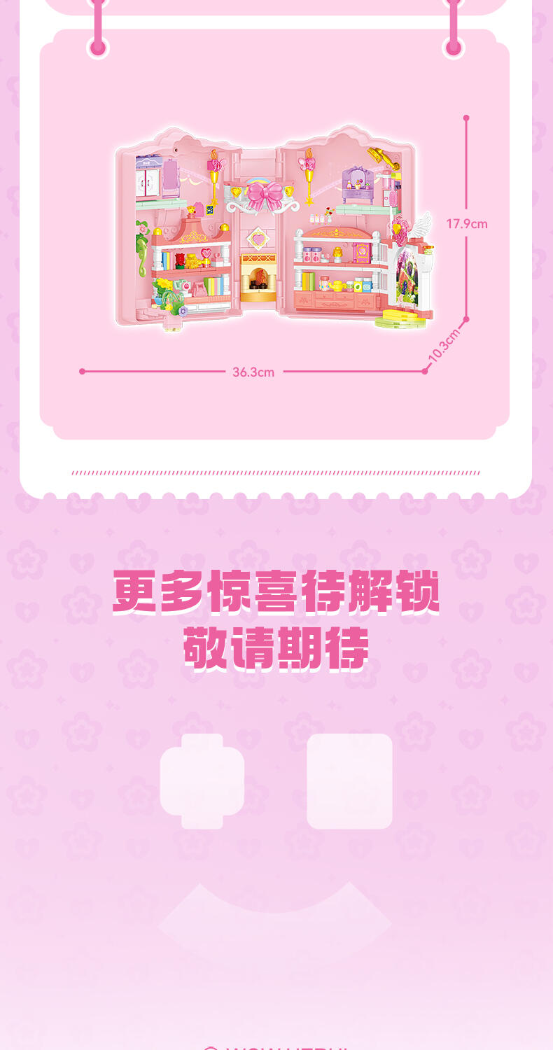 1、书本可开合把玩,得到花圃、传送门、露台和洗浴间等空间。 2、配置的柜子、书本等可开合,茶歇用品和户外设备较丰富,供小朋友模拟过家家。
