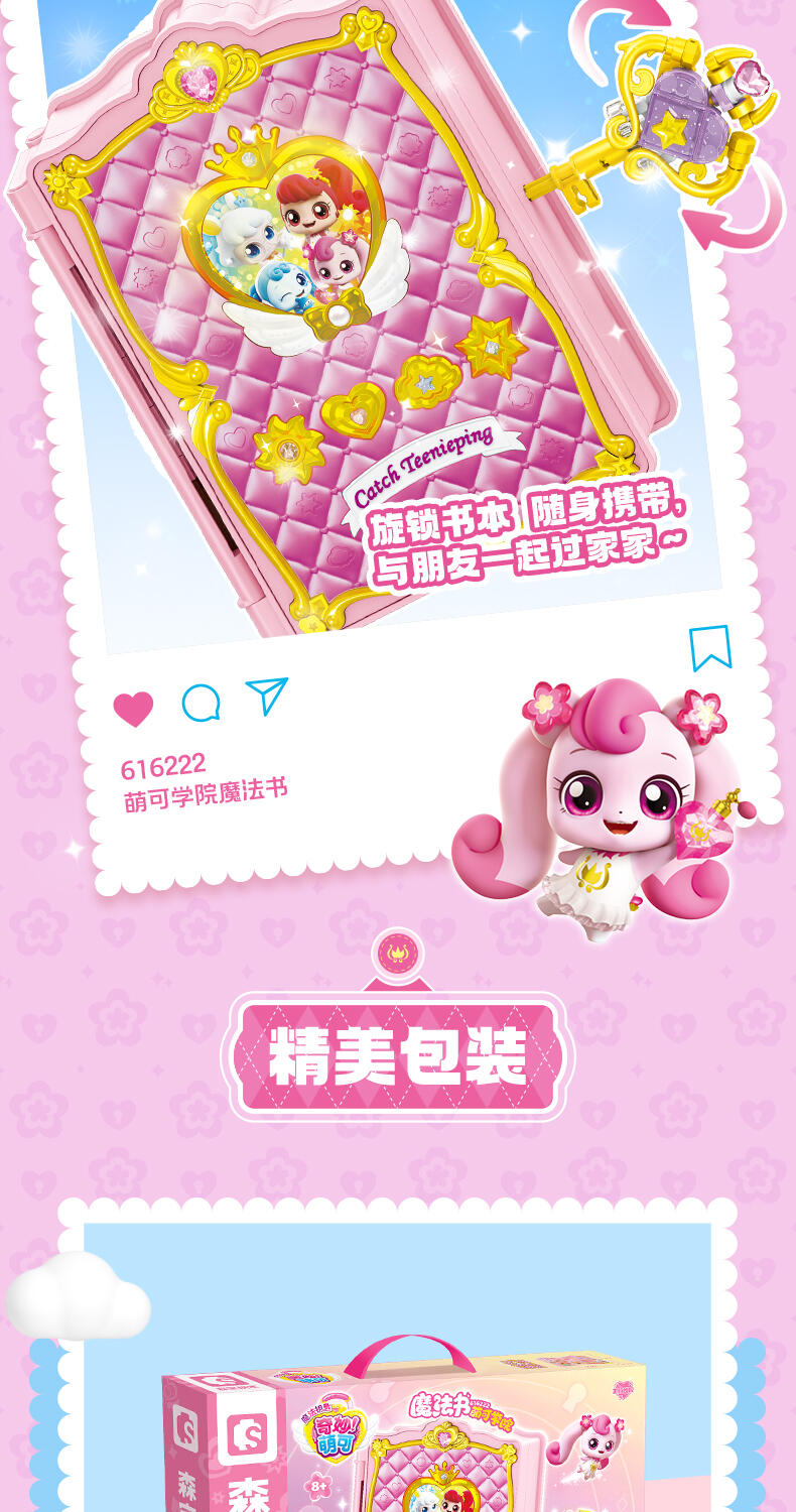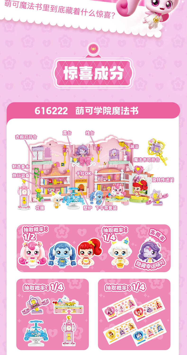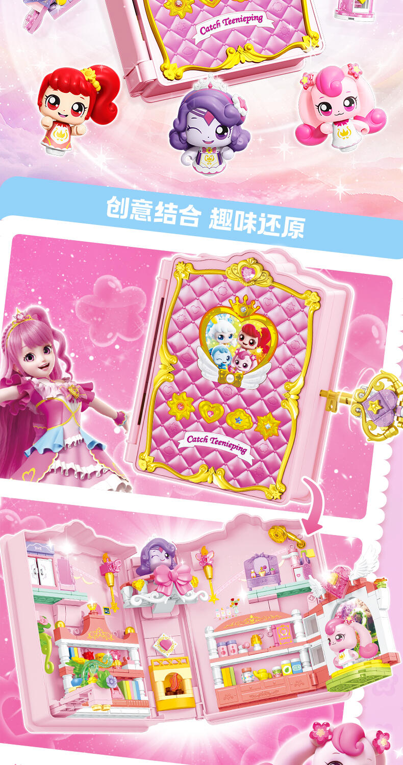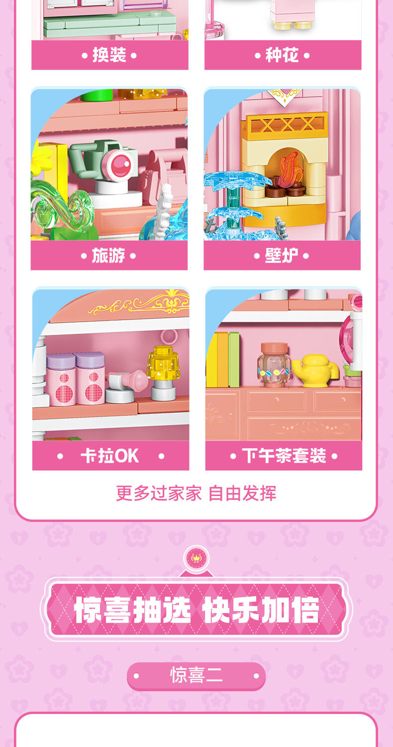 1、书本可开合把玩,得到花圃、传送门、露台和洗浴间等空间。 2、配置的柜子、书本等可开合,茶歇用品和户外设备较丰富,供小朋友模拟过家家。
