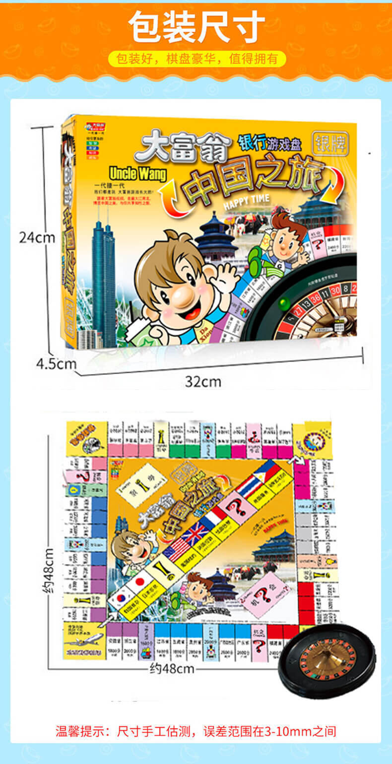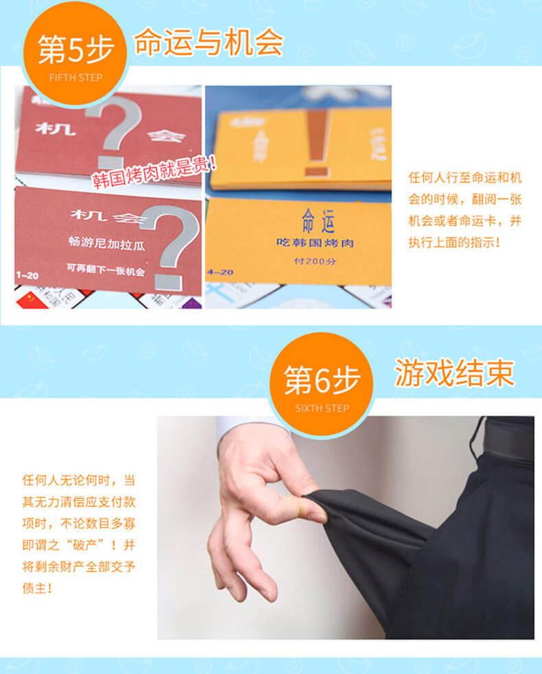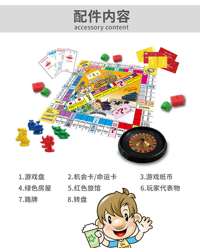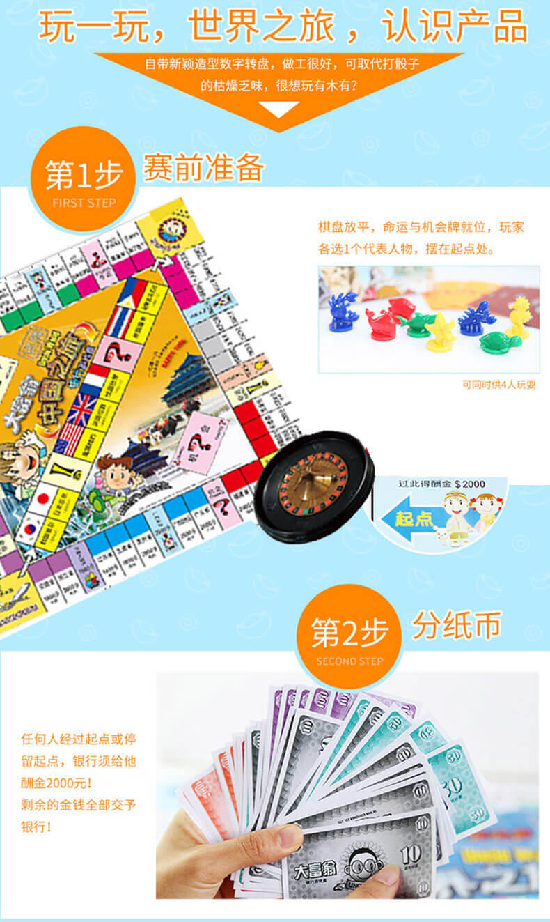 玩法介绍:赛前准备,分纸币,转动转盘(开始时,玩家把代表物放在起点上然后转盘或掷骰子决定顺序,点数多者先行。轮流转盘或掷骰子,每到一处,按该点的规定执行。),购置房产,命运与机会,破产。