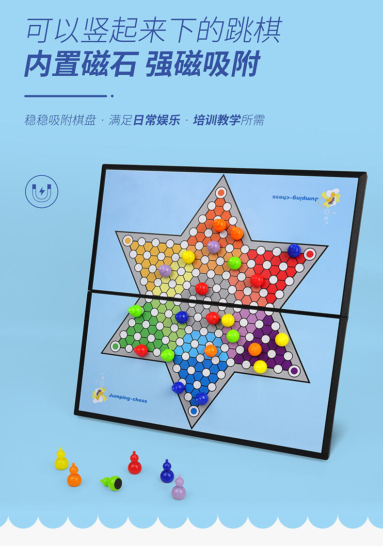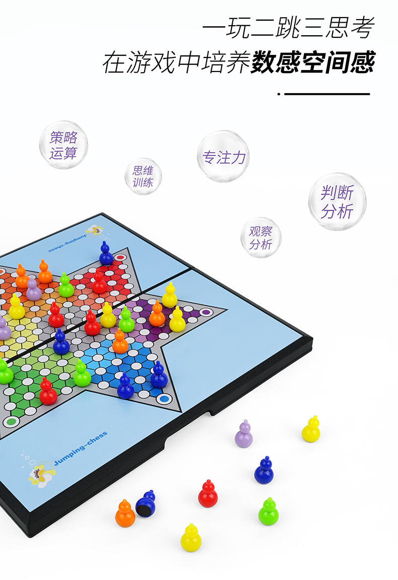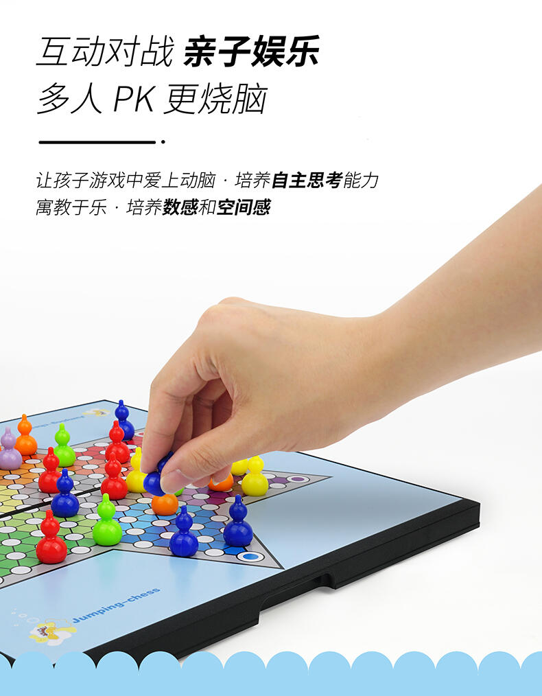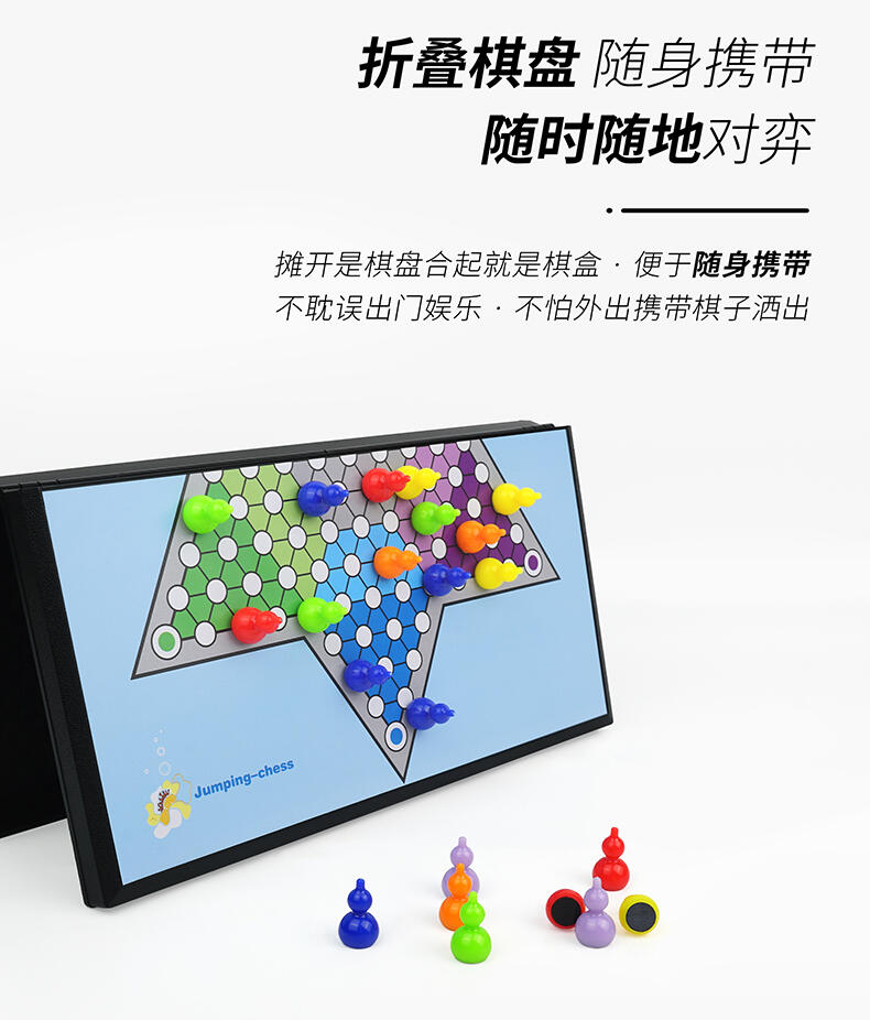 可折叠棋盘,方便收纳和携带。跳棋,妙趣横生,它的互动性可以给人带来很多的欢乐时光,朋友聚会、家庭休闲、亲子游戏等都可以一起玩。