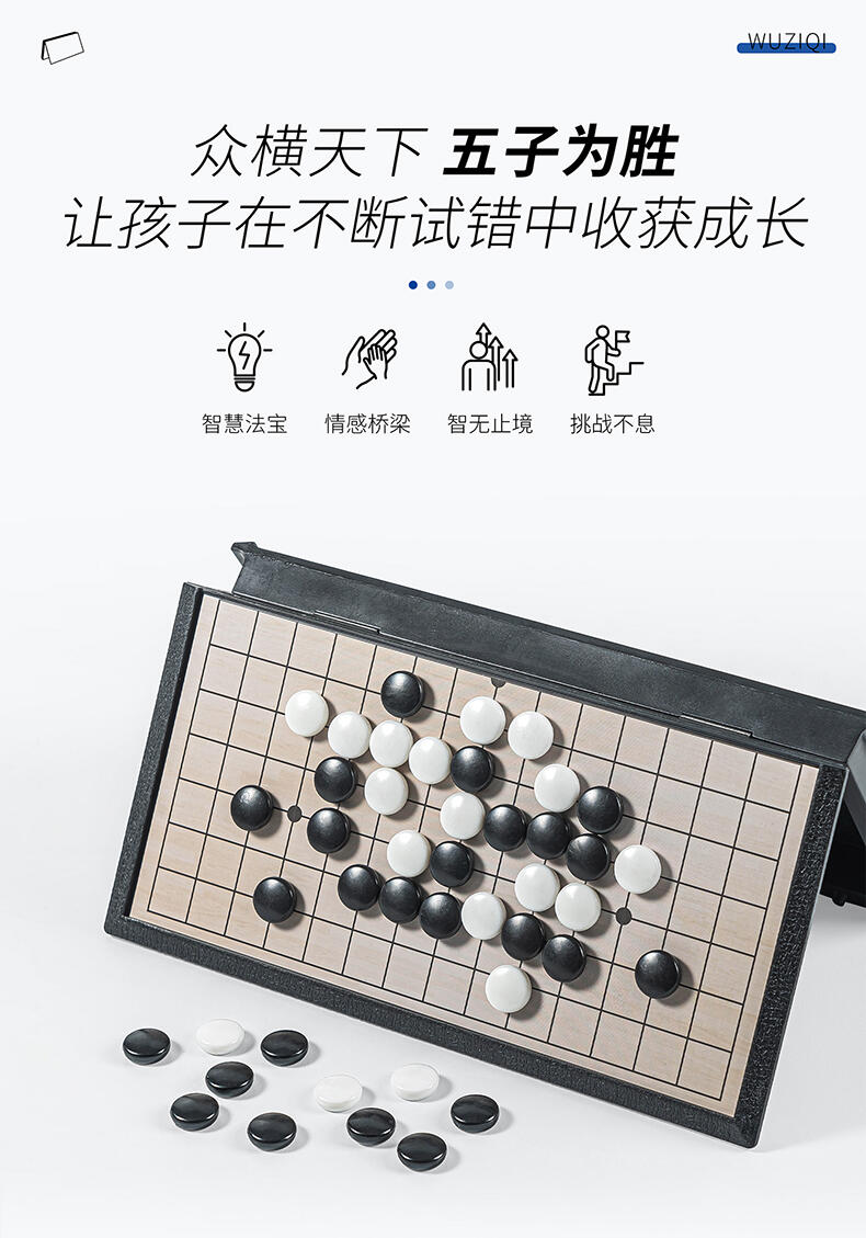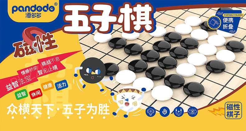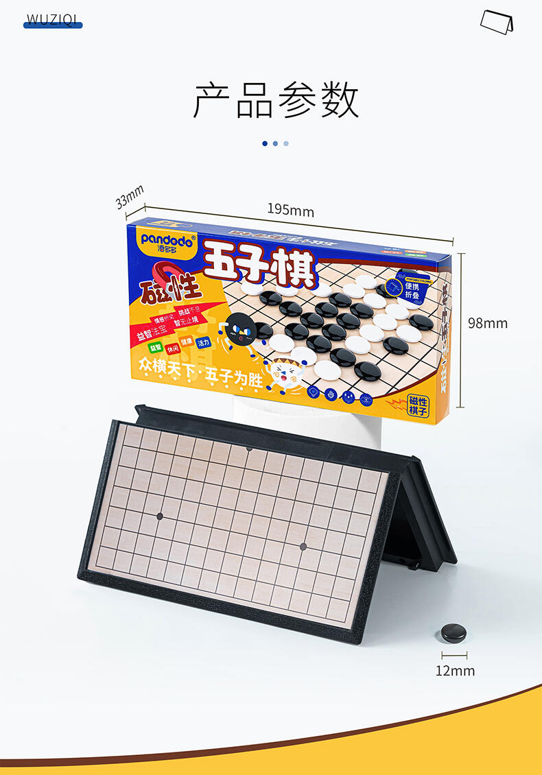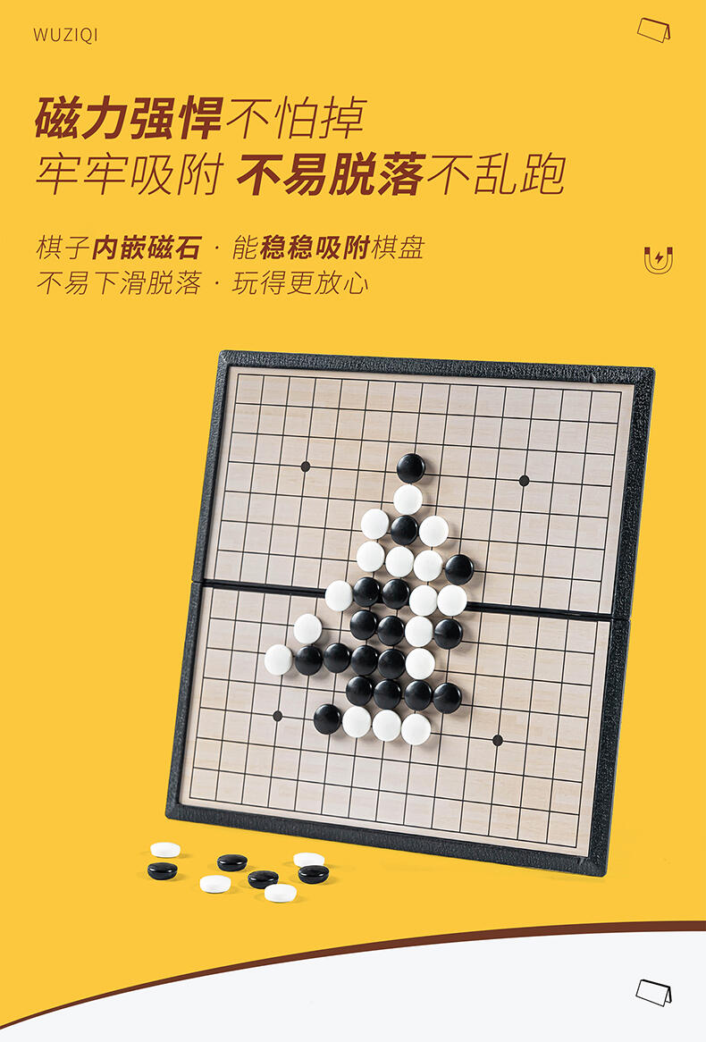 五子棋可培养孩子的观察分析、逻辑思维等能力,心智全面发展。折叠棋盘、内含收纳盒、磁性棋子、环保材质、方便携带。