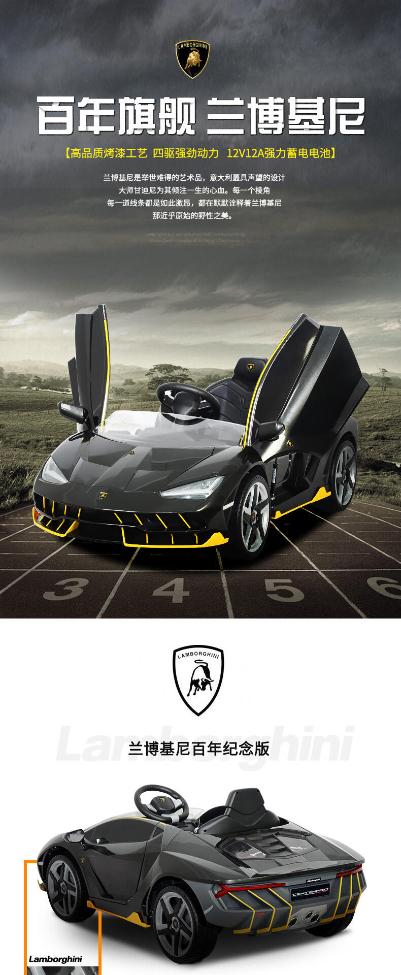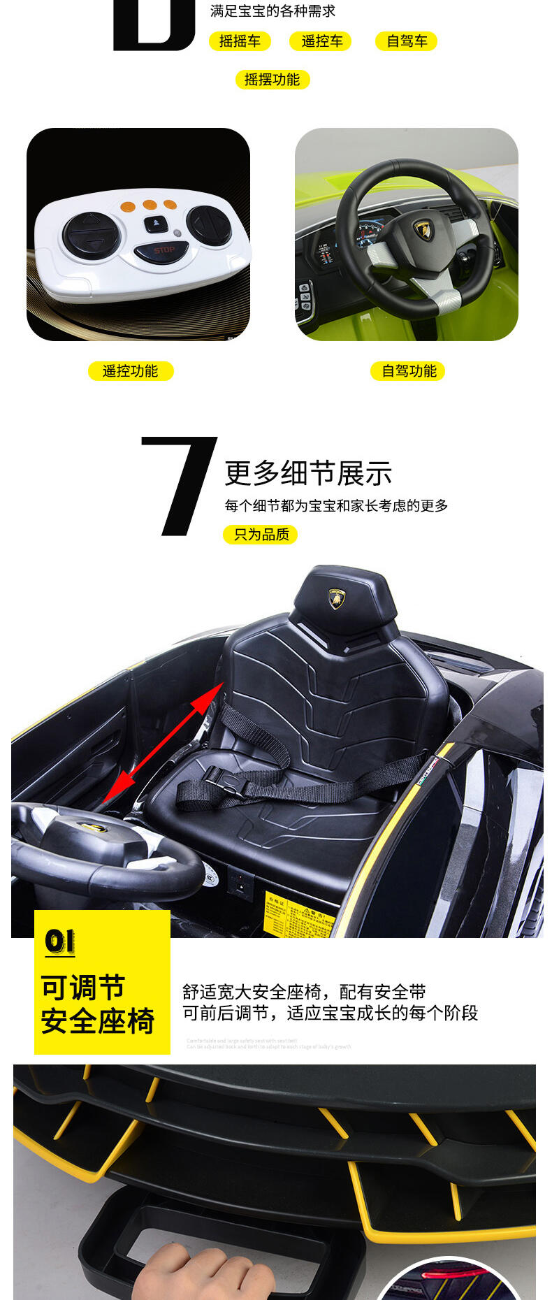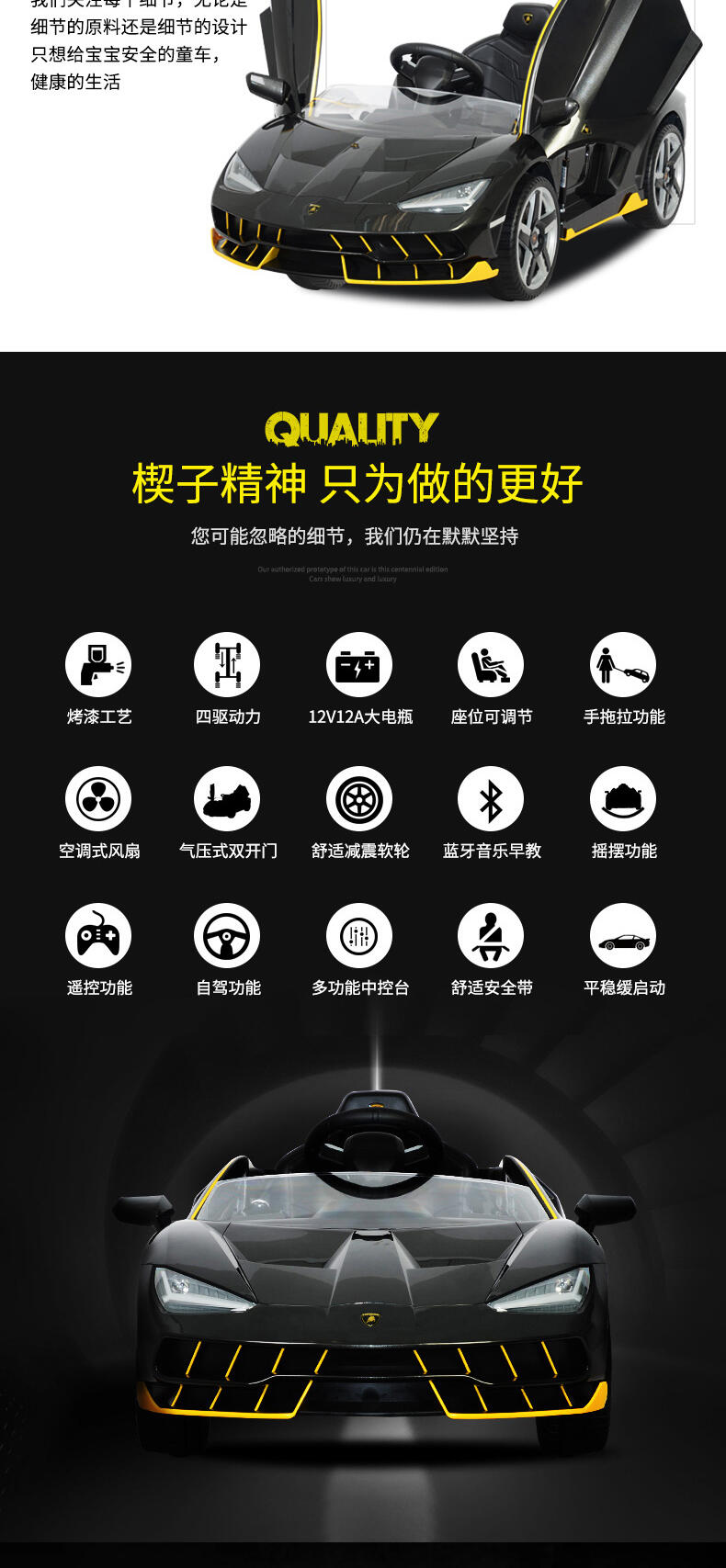 真车原车型复刻,霸气帅气延续。车身高品质烤漆工艺。两驱强劲动力,持续续航。加大12V12AH大电瓶。免充气舒适减震软轮,气压助力式自动双开门。可调节安全座椅。