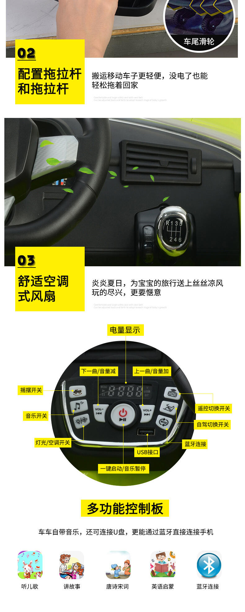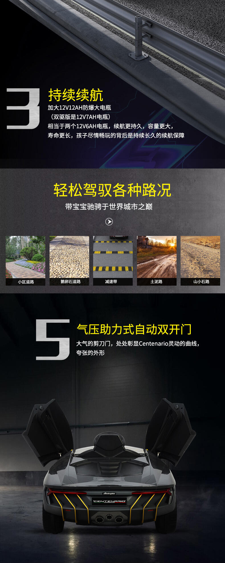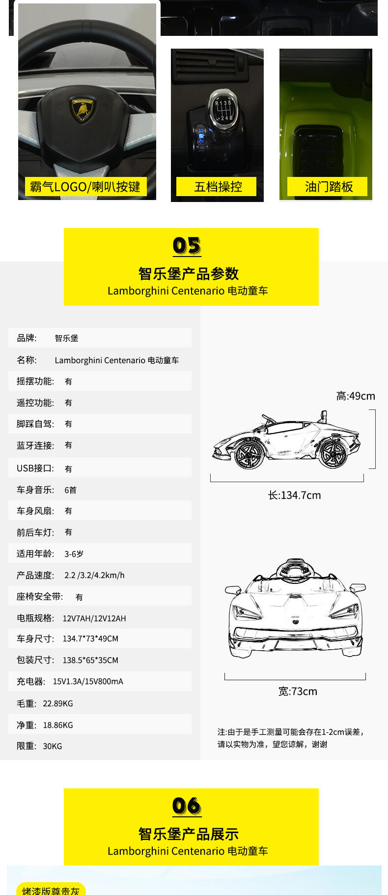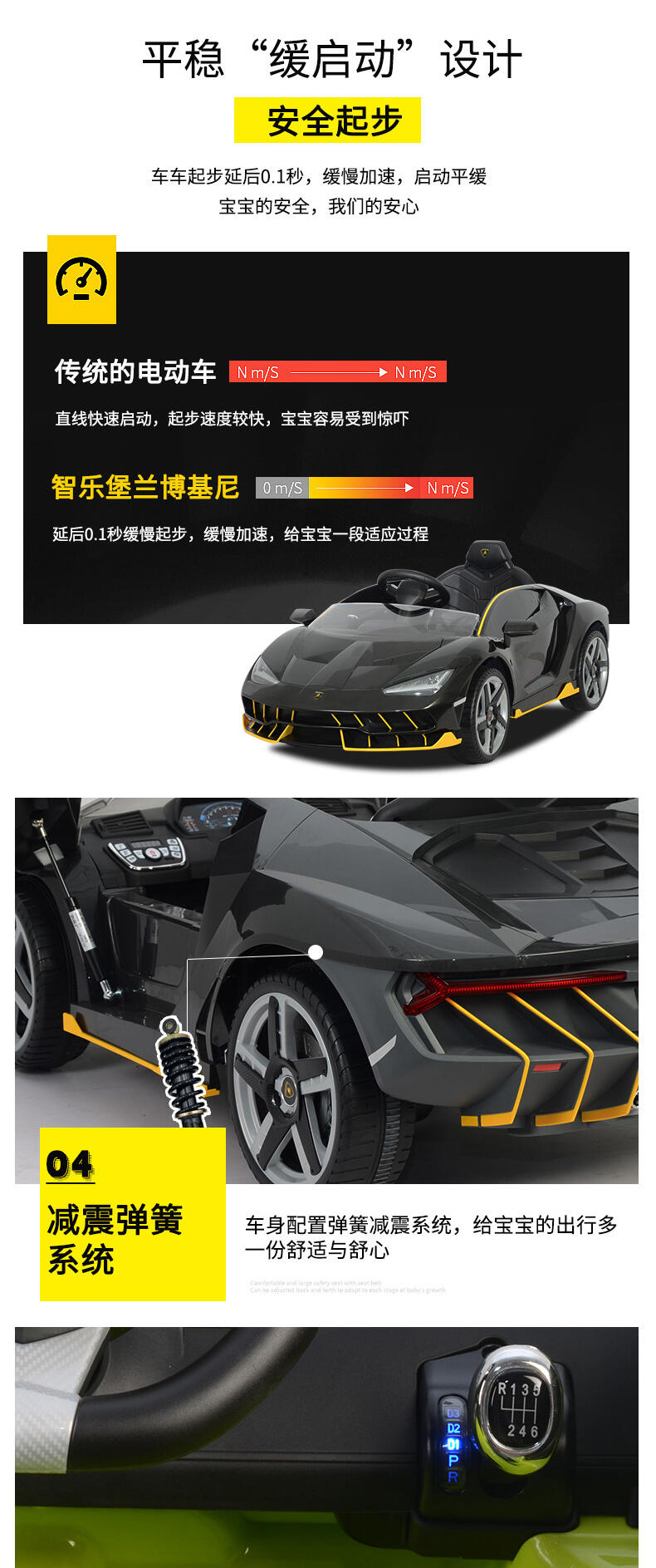 真车原车型复刻,霸气帅气延续。车身高品质烤漆工艺。两驱强劲动力,持续续航。加大12V12AH大电瓶。免充气舒适减震软轮,气压助力式自动双开门。可调节安全座椅。