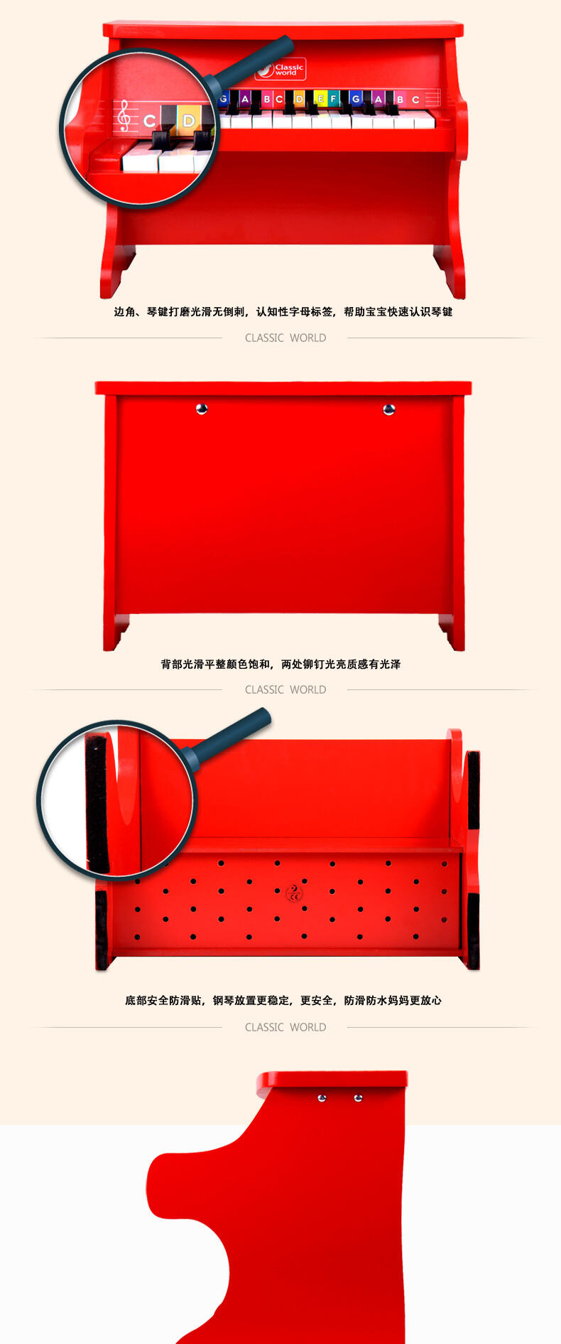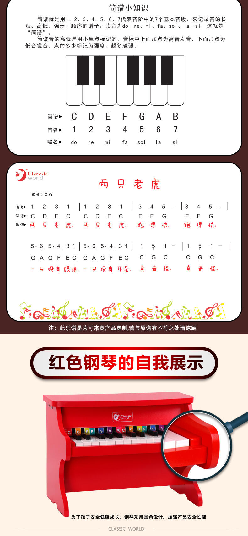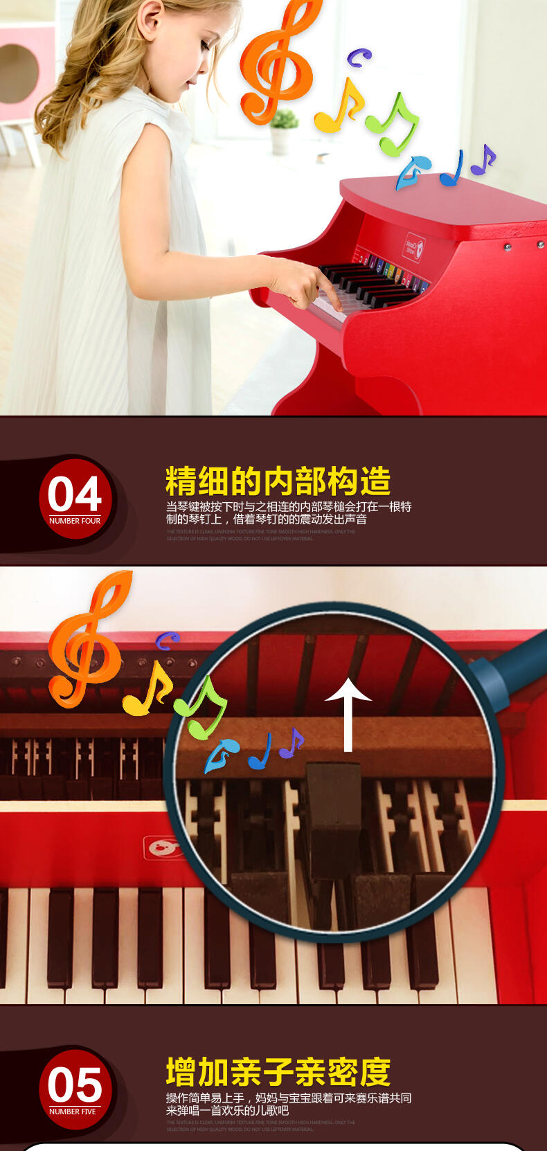 ①、25键独立琴键设置,媲美成人钢琴的逐级触感,匹配宝宝手指间距的独立琴键,仿真机械钢琴,音质悦耳逼真,内附速成琴谱,培养基础音阶乐感。 ②、造型美观,配色高级,绚丽红色,颜值担当,琴键无毛刺,弹奏流畅护手,为宝宝的音乐梦量身打造。 ③、极致选材,多道工序匠心打磨而成,抗潮抗热,坚固结实,环保水性漆,安全健康,欧美标准,匠心品质。
