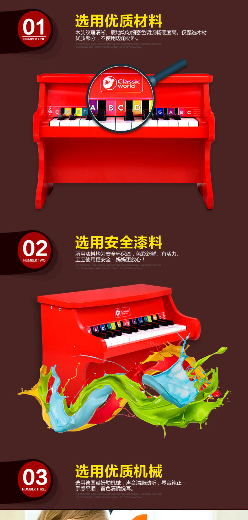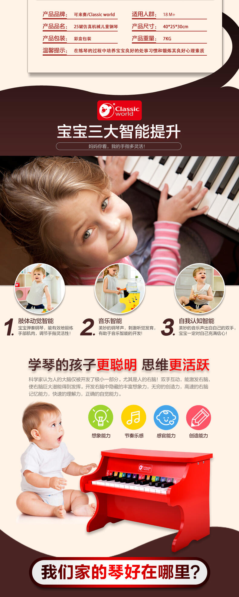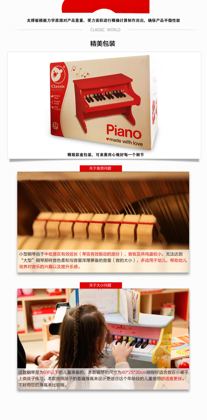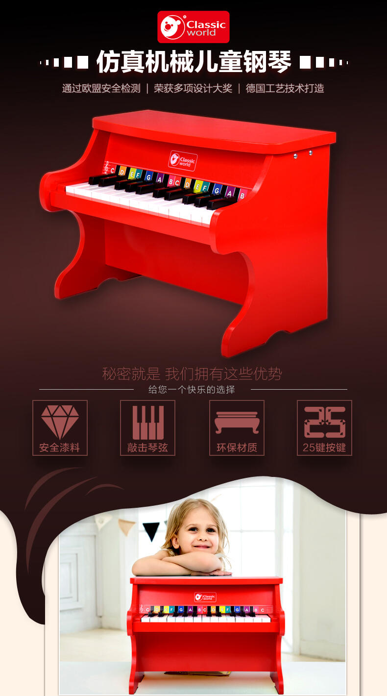 ①、25键独立琴键设置,媲美成人钢琴的逐级触感,匹配宝宝手指间距的独立琴键,仿真机械钢琴,音质悦耳逼真,内附速成琴谱,培养基础音阶乐感。 ②、造型美观,配色高级,绚丽红色,颜值担当,琴键无毛刺,弹奏流畅护手,为宝宝的音乐梦量身打造。 ③、极致选材,多道工序匠心打磨而成,抗潮抗热,坚固结实,环保水性漆,安全健康,欧美标准,匠心品质。