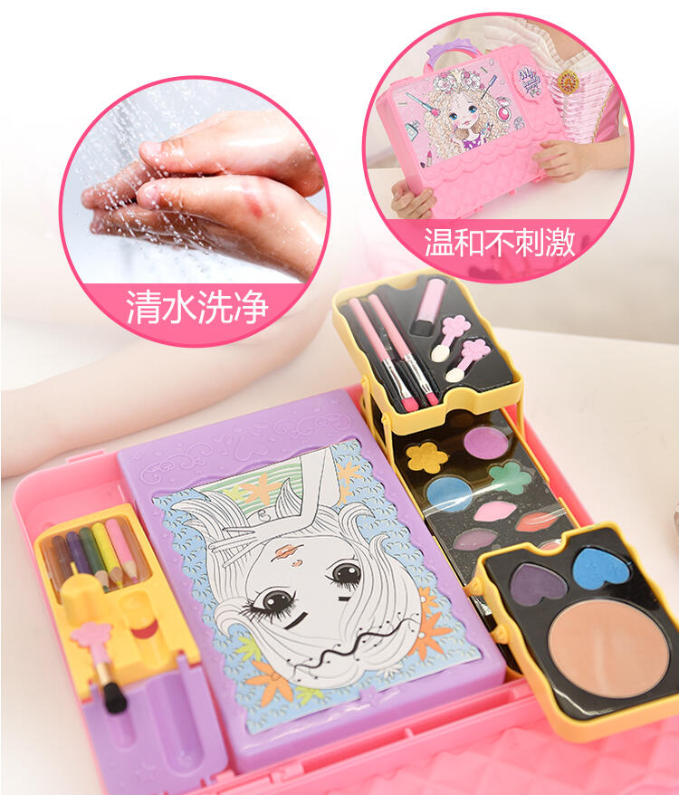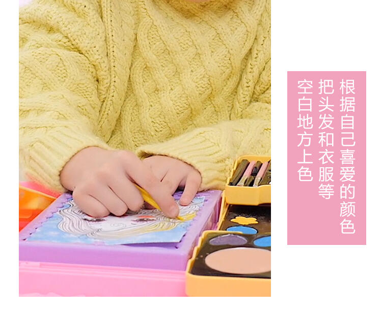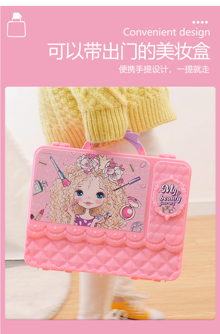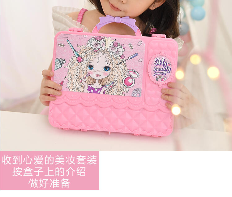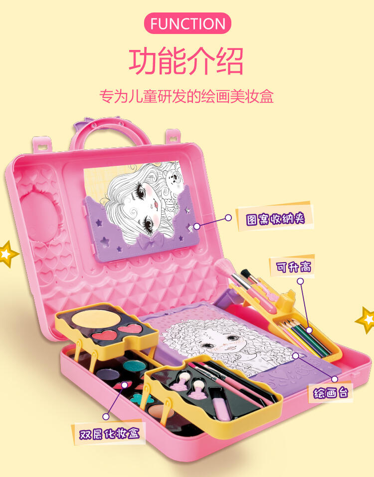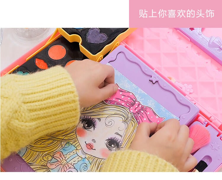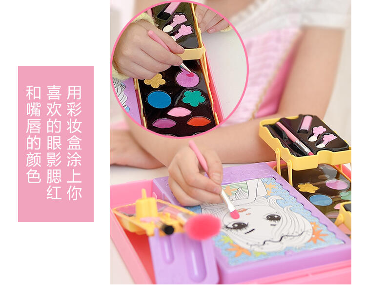 个性化设计 时尚精美,多功能美妆箱不仅仅是玩具,更是一套素质提升工具,简单三步,美妆小达人养成记,初学阶段给绘画上妆,演练阶段给娃娃妆扮,娴熟阶段给自己化妆,儿童配方,不刺激易水洗,严苛安全检测,确保宝宝使用安全。独立双层化妆盒设计,内容丰富,教学玩具,易清水,颜料、材质:塑胶、纸
