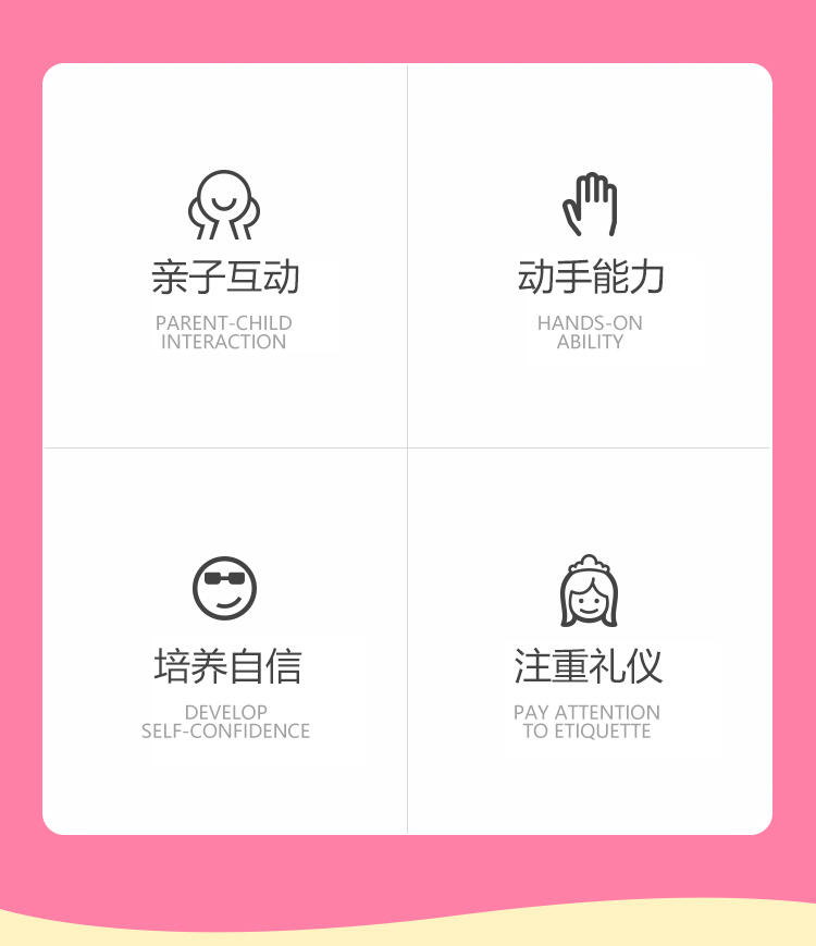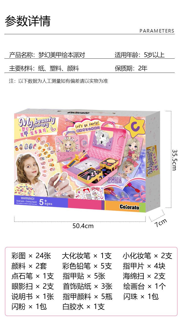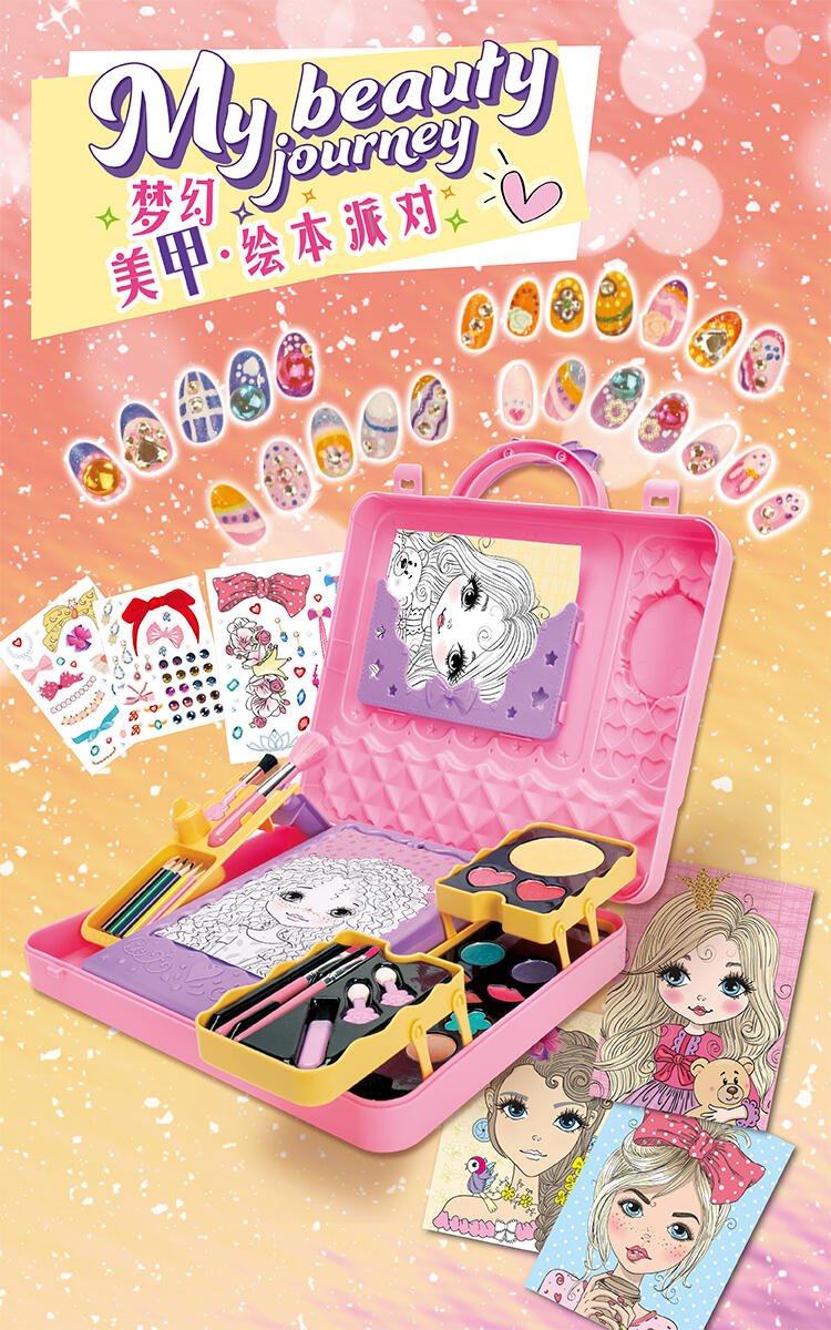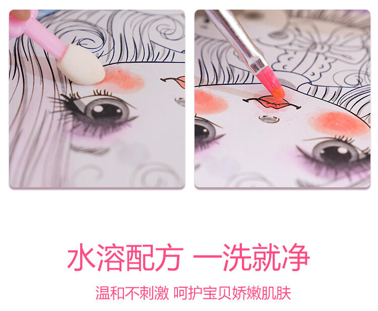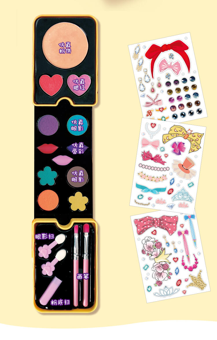 个性化设计 时尚精美,多功能美妆箱不仅仅是玩具,更是一套素质提升工具,简单三步,美妆小达人养成记,初学阶段给绘画上妆,演练阶段给娃娃妆扮,娴熟阶段给自己化妆,儿童配方,不刺激易水洗,严苛安全检测,确保宝宝使用安全。独立双层化妆盒设计,内容丰富,教学玩具,易清水,颜料、材质:塑胶、纸