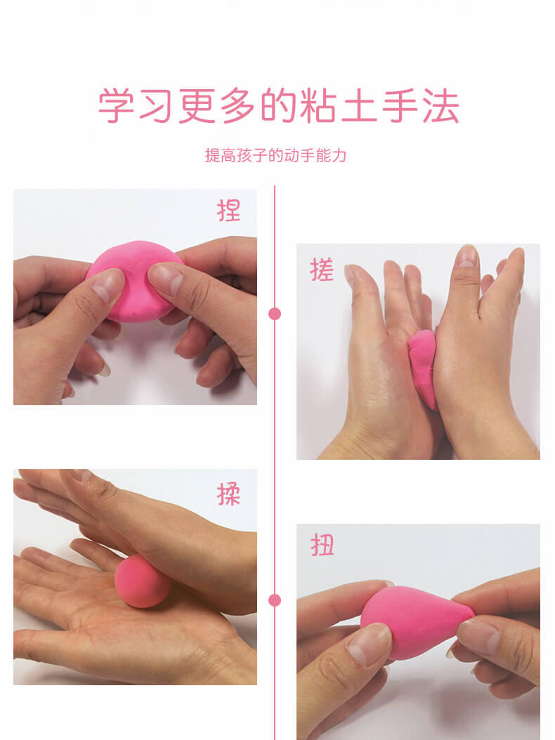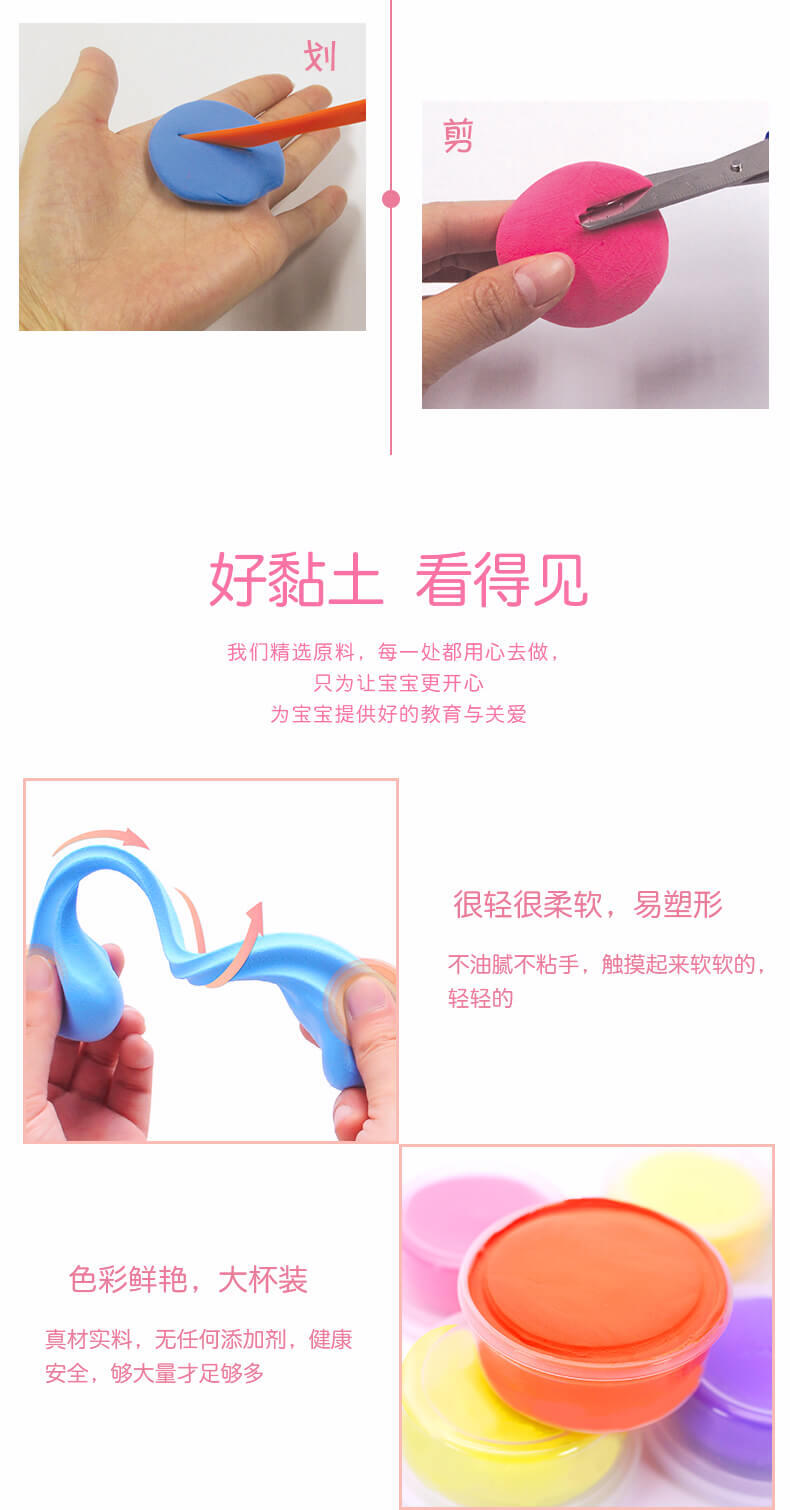 丰富的色彩,多样的玩法,发挥想象力。提高孩子的动手能力,我们精选原料,用心去做,只为让宝宝更开心,为宝宝提供好的教育与关爱。我们的粘土很轻很柔软,易塑型。