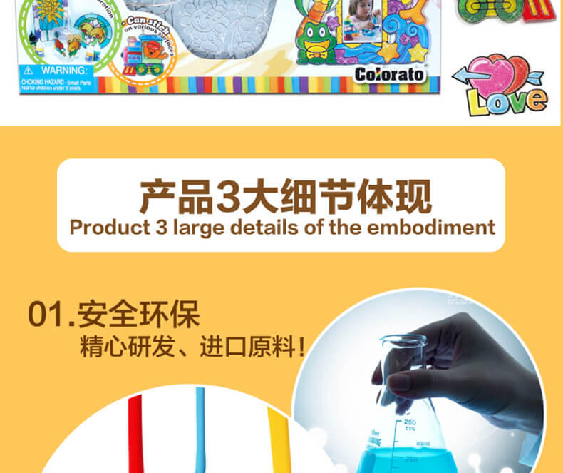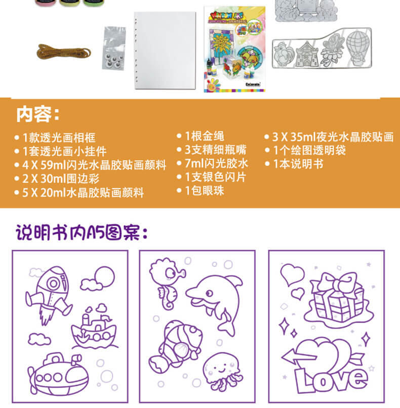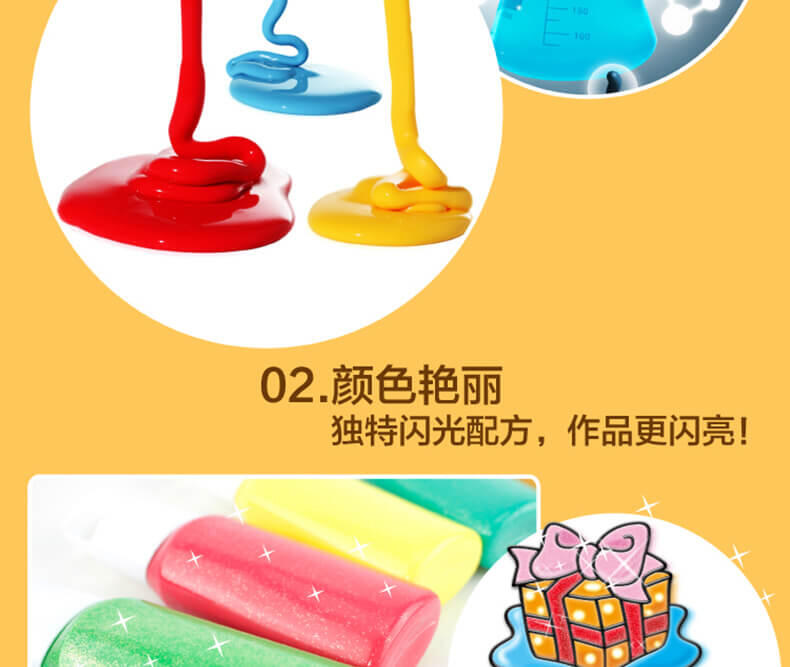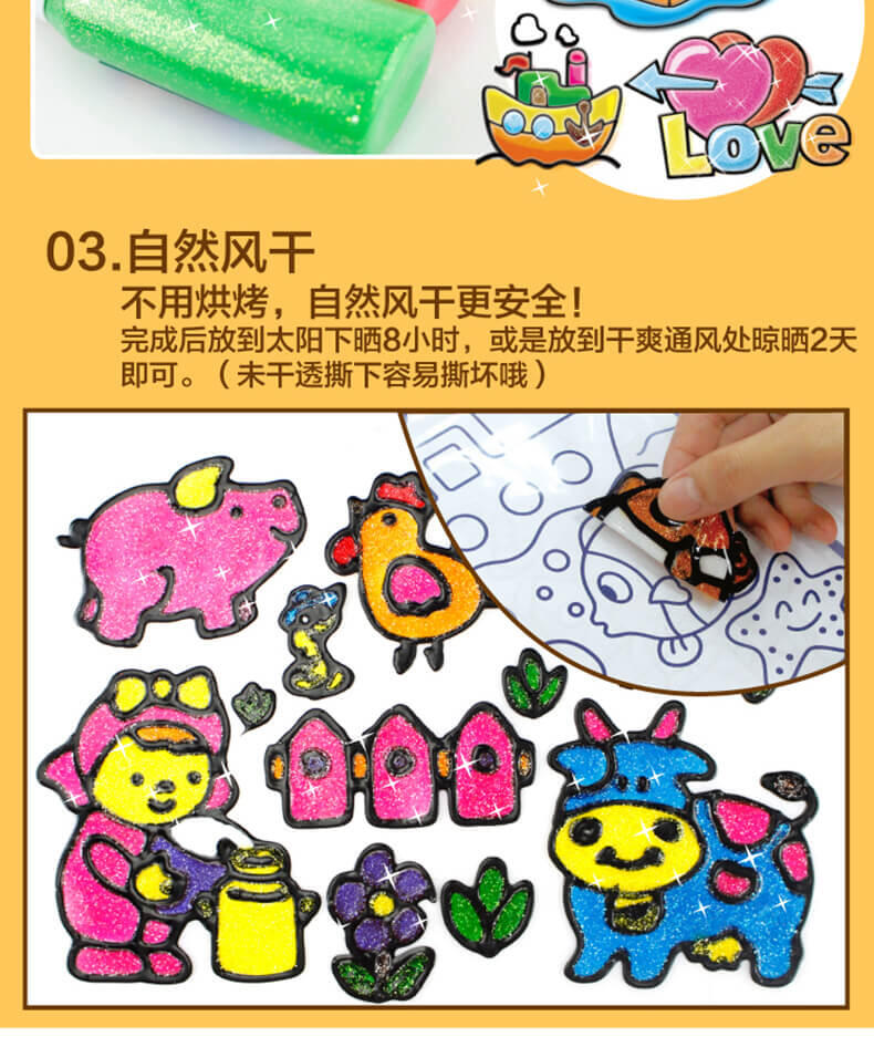在玩乐中学习,锻炼孩子动手能力,色彩认知,精细动作。颜色艳丽,闪光配方,让作品更闪亮。自然风干,完成后放到太阳下晒8个小时,或是放到干爽通风出晾晒2天即可。