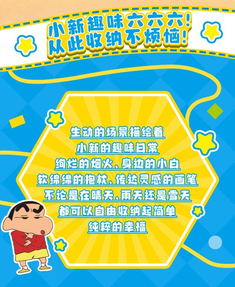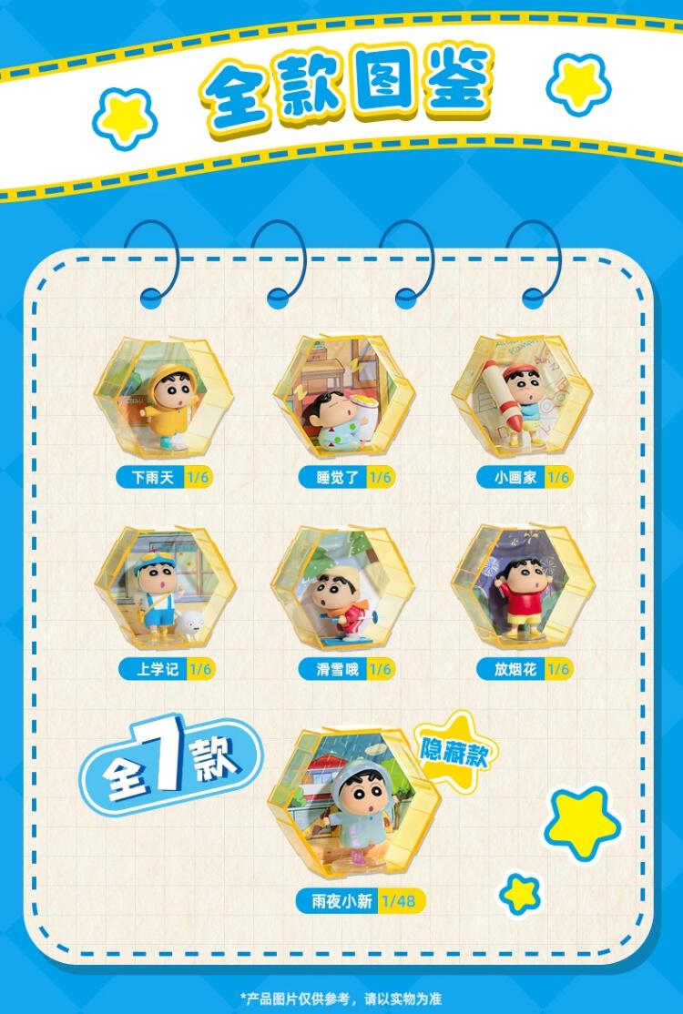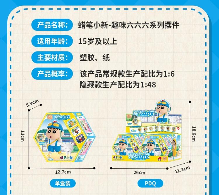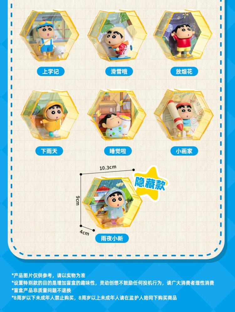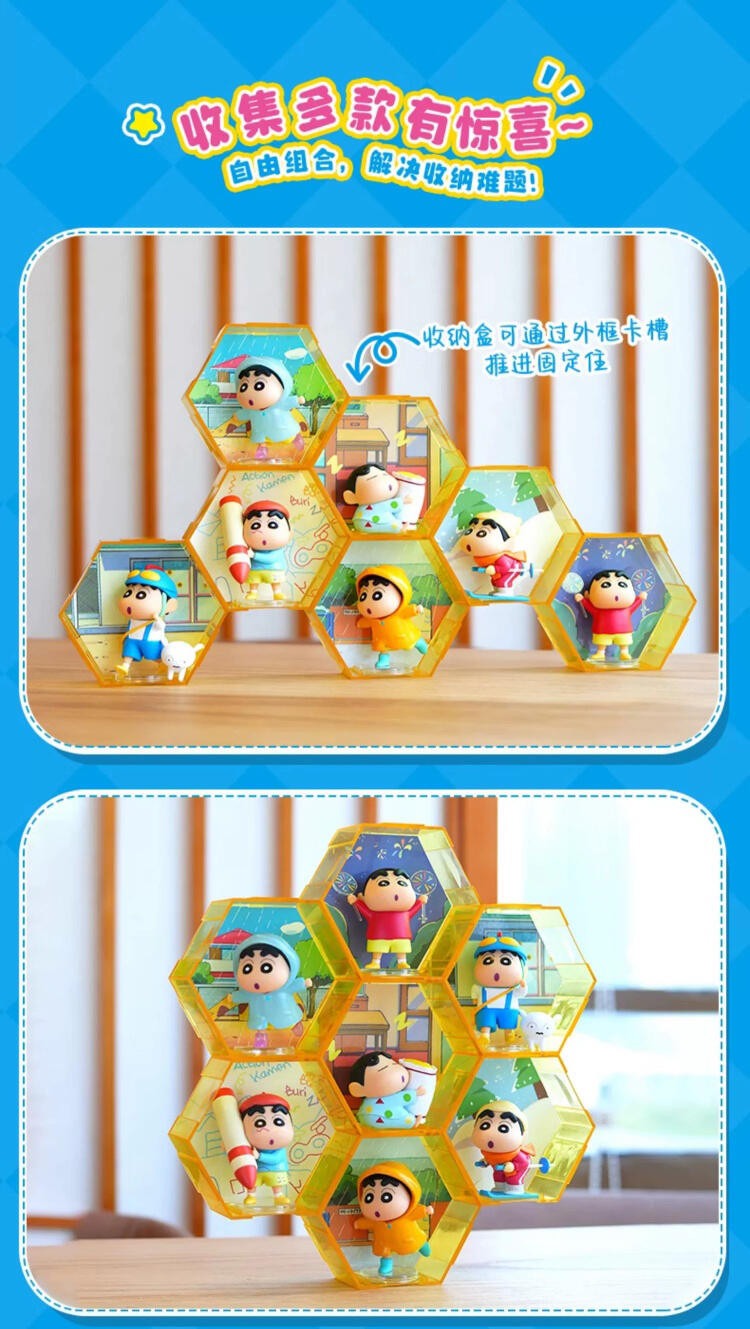 1、创意设计:每款小新盲盒摆件配套一个六边形收纳盒+背景 2、人气IP:蜡笔小新经典名场面+生动讨喜造型,忠实粉丝的必备收藏品。 3、收纳自由:配套收纳盒,解决盲盒收纳难题,便于展示和欣赏 4、美观大方:模块化设计可以节省空间,大大提升屋内摆放美感