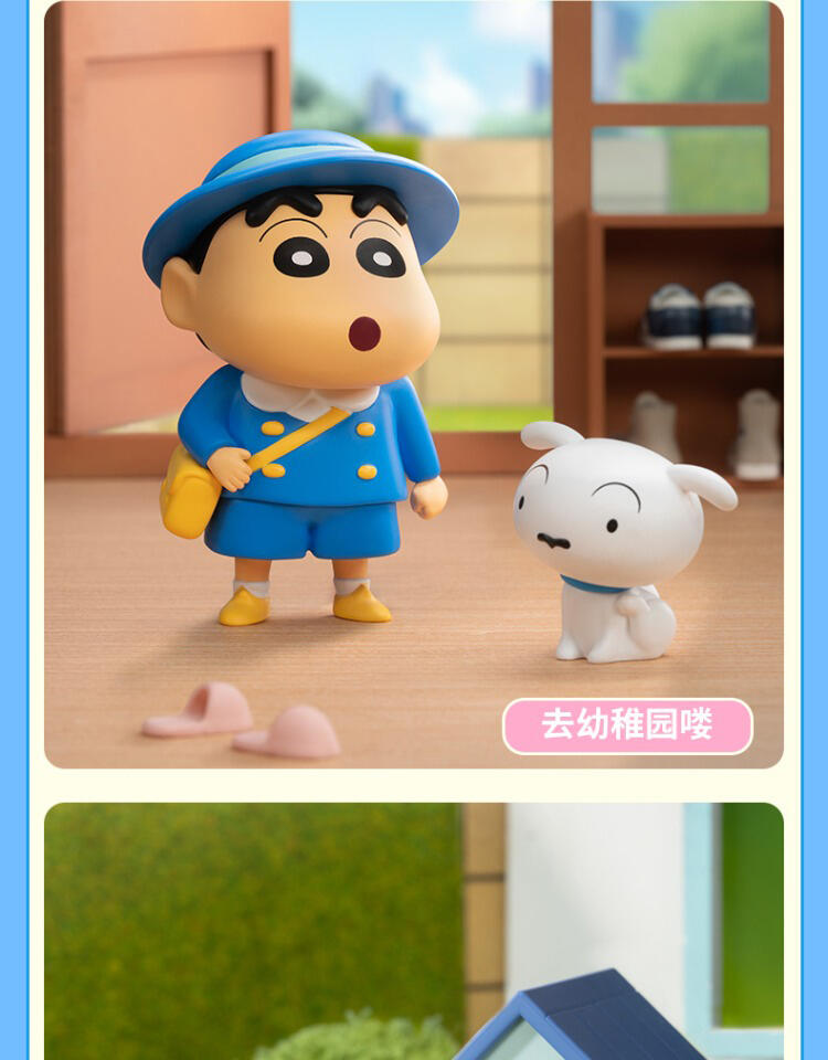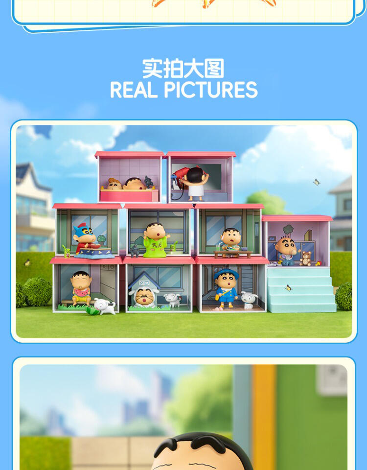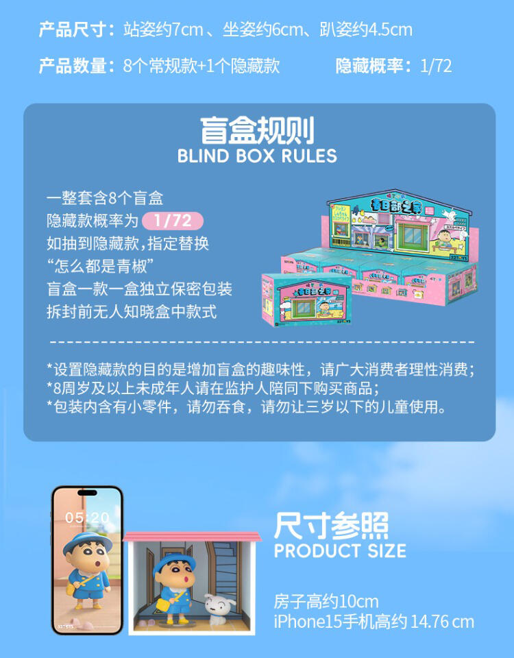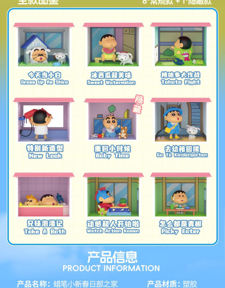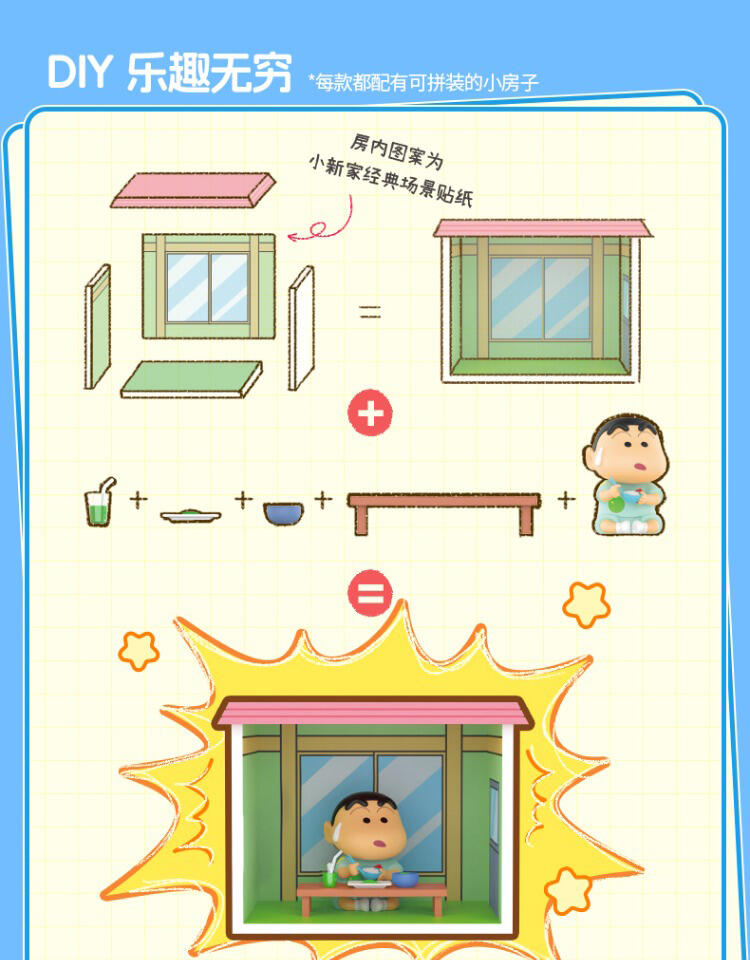 设计背景:以小新在家里的各种造型为基础,结合了一些经典形象,而且每款都配备了一个拼装的小房子; 产品亮点:特别新造型中的镜子为镜面贴纸,可以反射。怎么都是青椒里的饮料为透明件。每一款的小房子内侧的图案均为附送的贴纸,可以自己DIY,里面也附送了贴纸的说明书