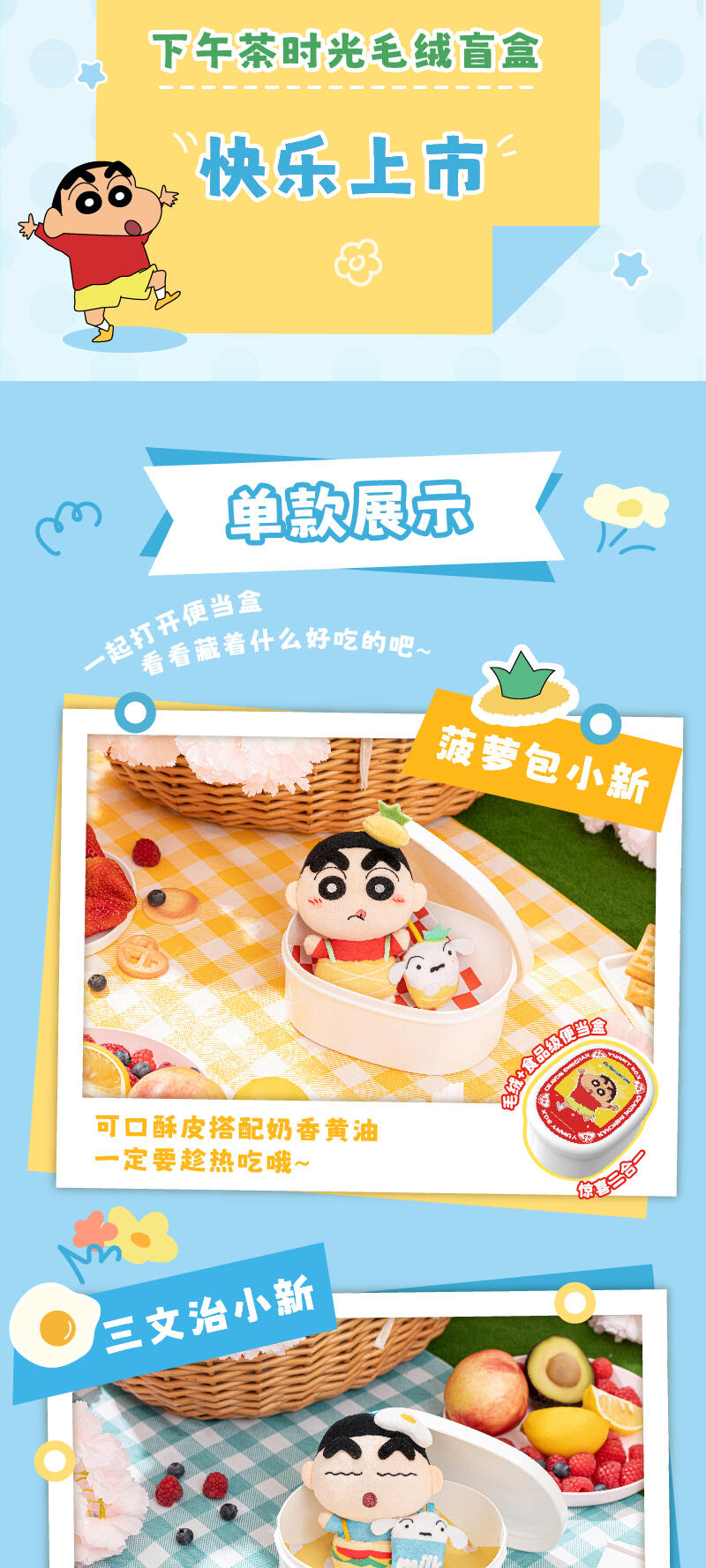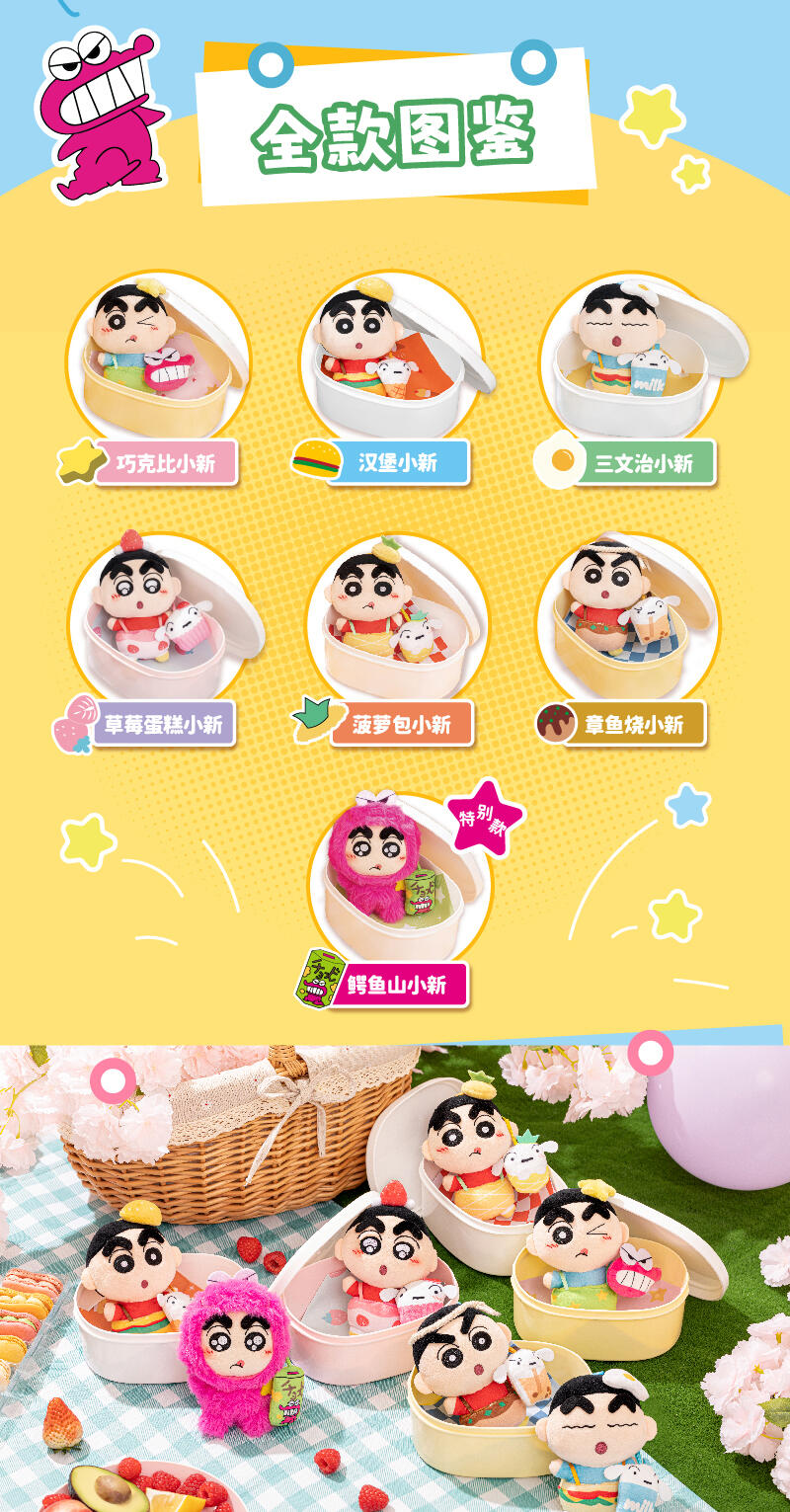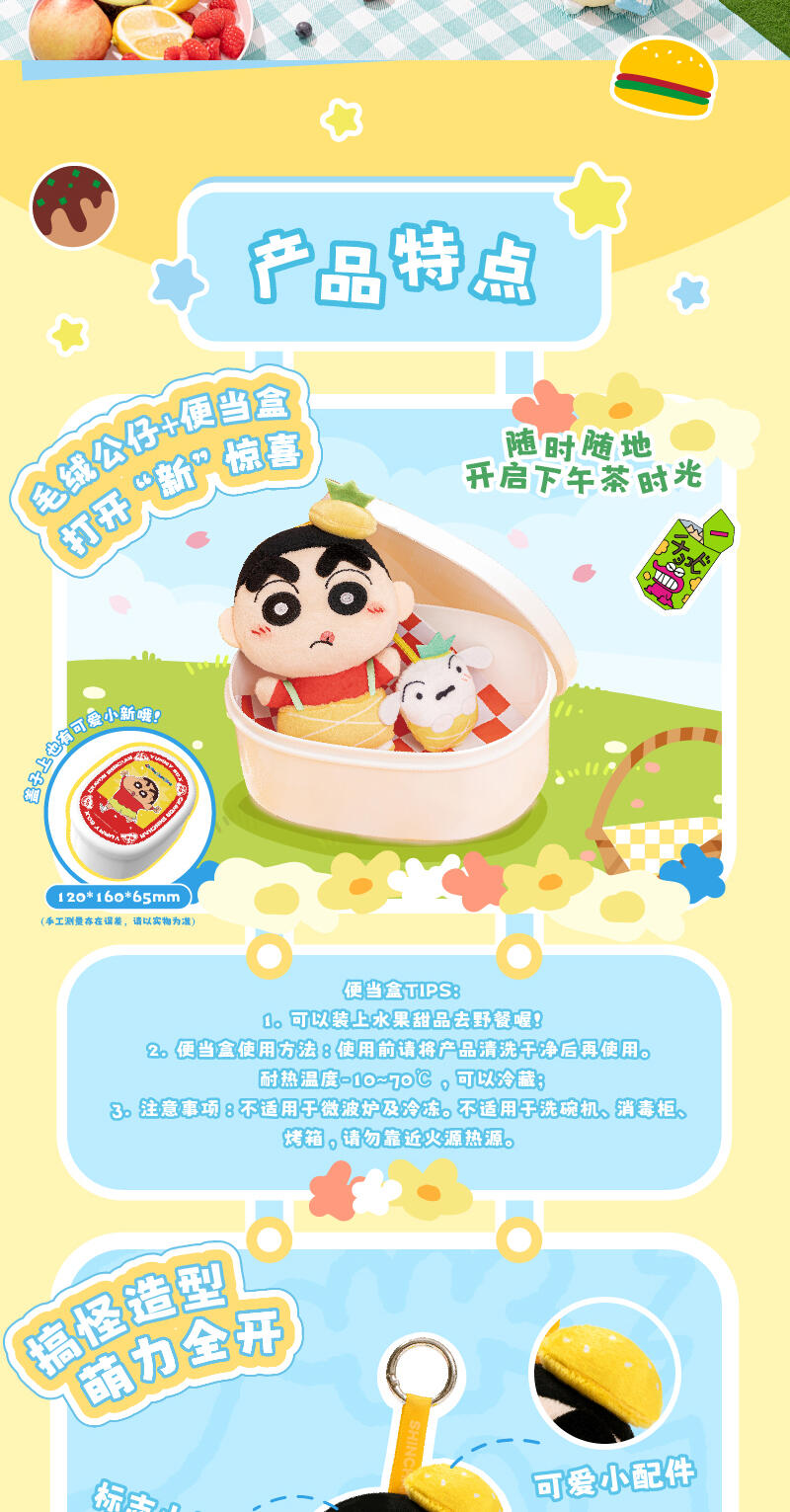 1.可爱Q萌的便当盒设计,蜡笔小新与美味点心结合的创意设计,第一无二的创想盲盒! 2.表情丰富的新酱与甜点小白,结合柔软小兔毛材质,手感舒适 3.