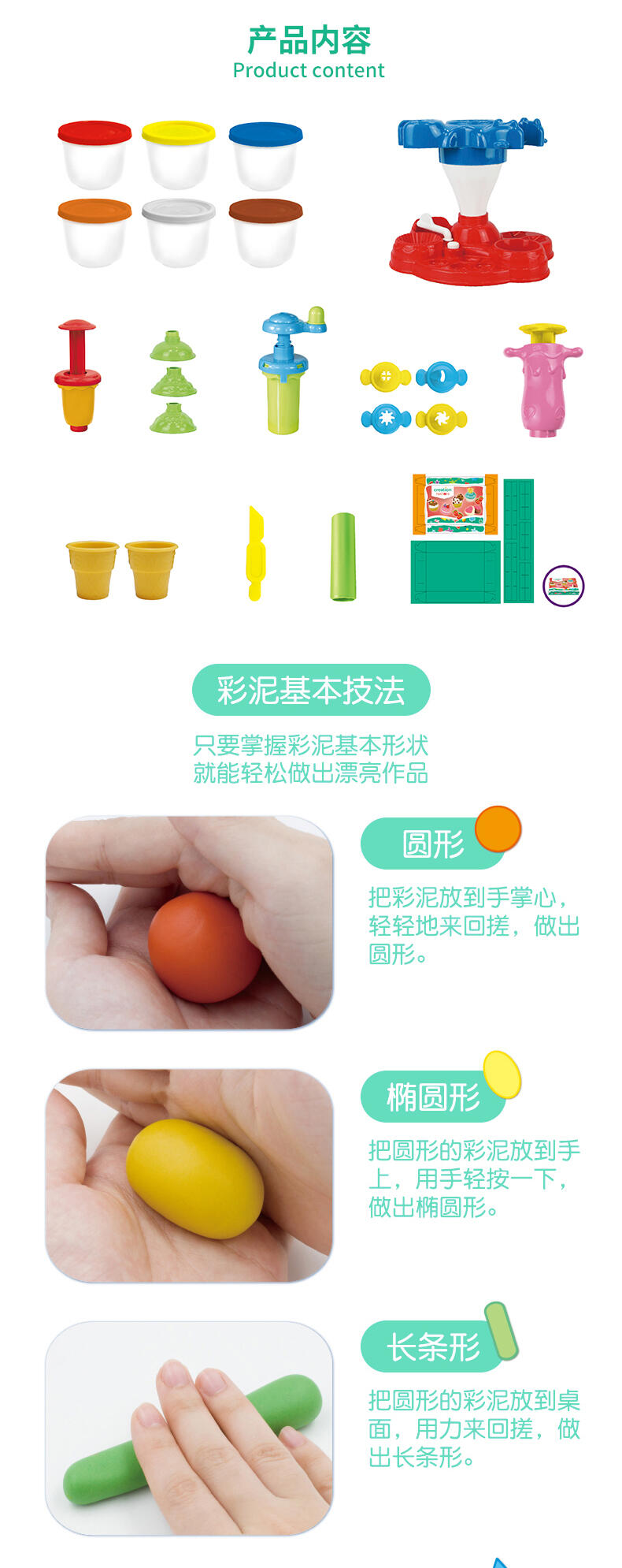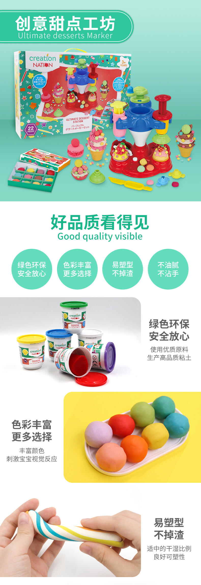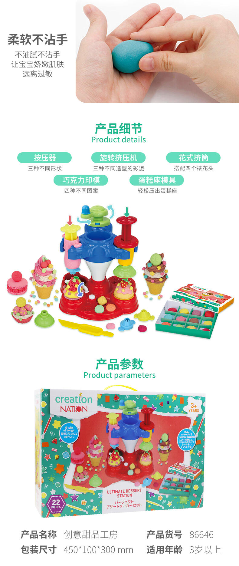 实现孩子拥有一个甜品工坊的梦想吧。甜品工作坊轻松3步制作甜美彩泥小蛋糕。一按、一挤、一旋,彩泥小蛋糕就完成了!而且还有丰富实用的彩泥颜色和充足的彩泥量,多种多样的工具。本套产品工具多种多样,挤压工具就含有旋转式和挤压式。工作坊主题更是设计巧妙,有多个可互动机关。更大地延长了孩子探索工具时的乐趣