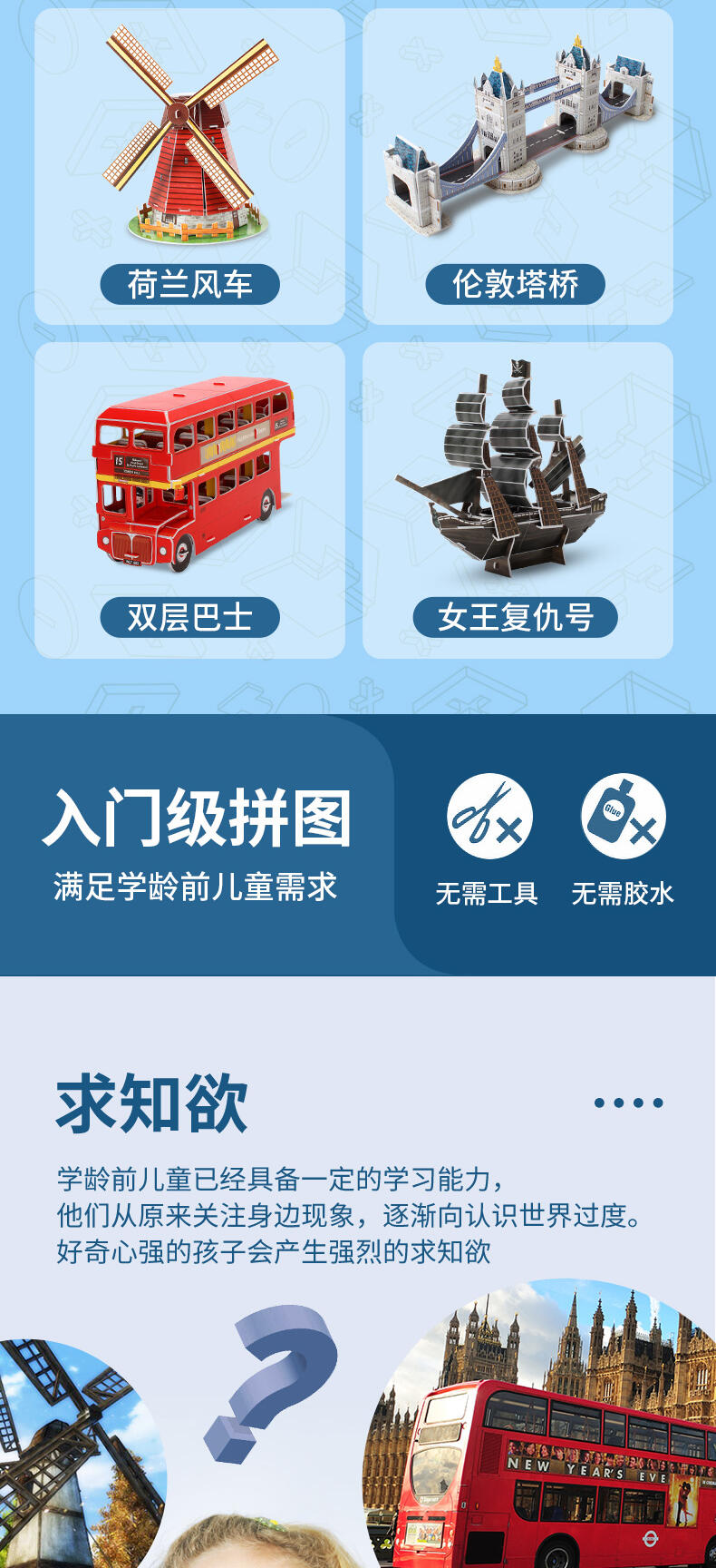 1.入门级难度,适合孩子DIY手作拼装能力的锻炼;