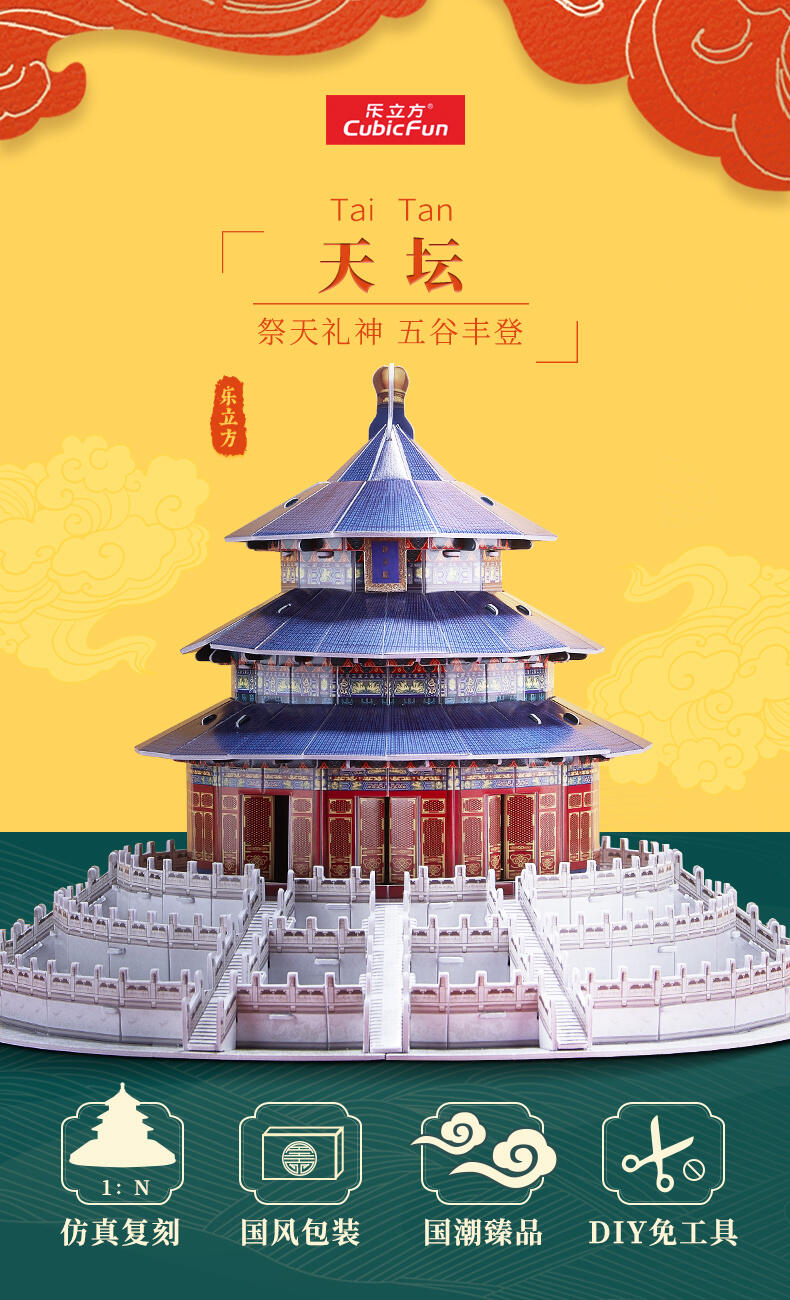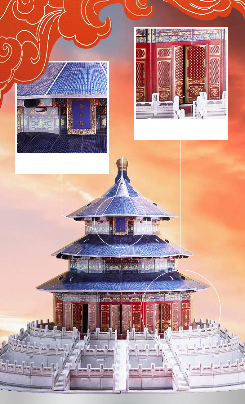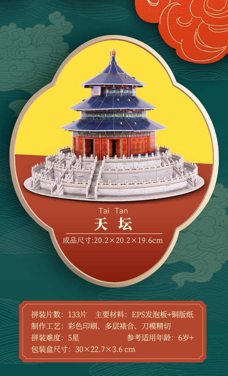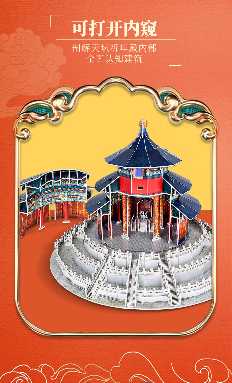 天坛——祭天礼神 五谷丰登 建筑背景:明永乐十八年(1420年)始建,明、清两代帝王每年祭天和祈祷五谷丰收的场所。古代中国人宇宙观的集中体现,王权天赐的象征。 1.可打开内窥 剖解天坛祈年殿内部 全面认知建筑 2.国风情怀纪念 祥云与国红的主题搭配 宜收藏 宜馈礼