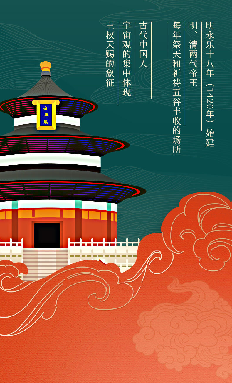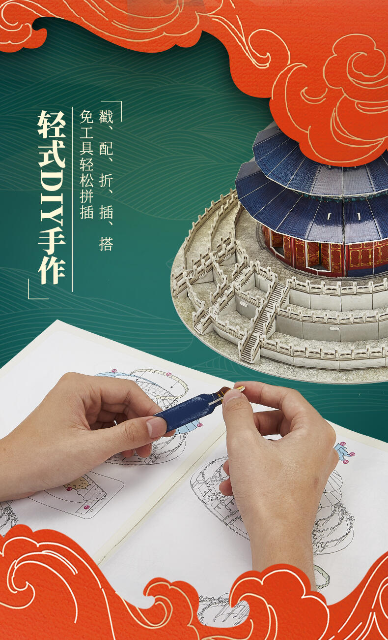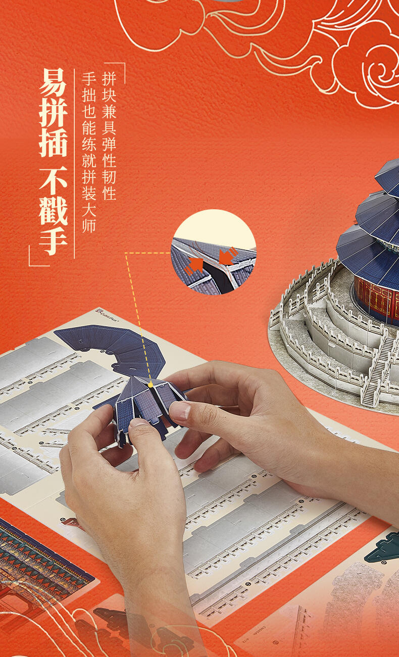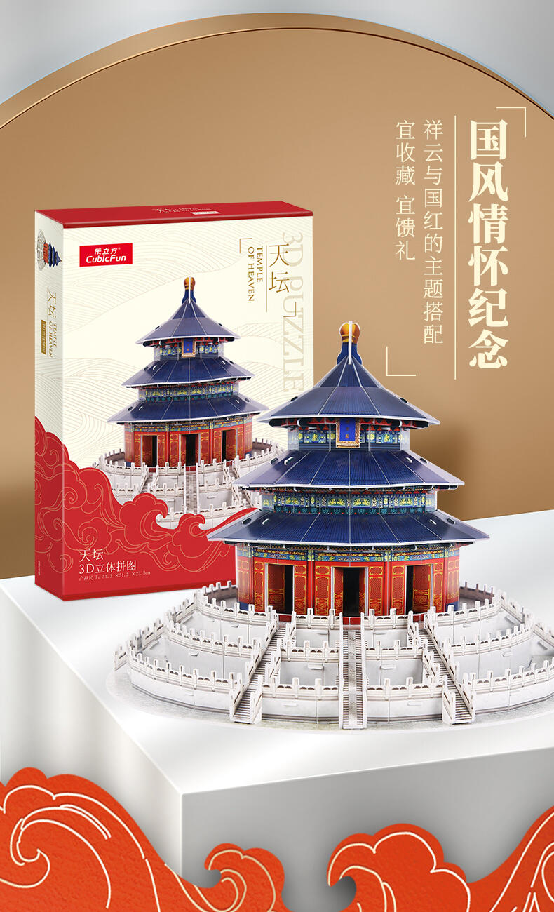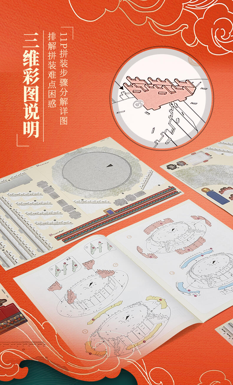 天坛——祭天礼神 五谷丰登 建筑背景:明永乐十八年(1420年)始建,明、清两代帝王每年祭天和祈祷五谷丰收的场所。古代中国人宇宙观的集中体现,王权天赐的象征。 1.可打开内窥 剖解天坛祈年殿内部 全面认知建筑 2.国风情怀纪念 祥云与国红的主题搭配 宜收藏 宜馈礼
