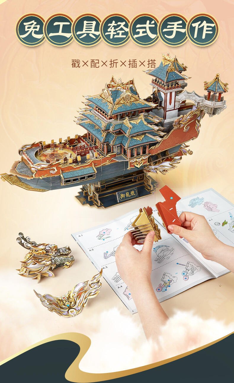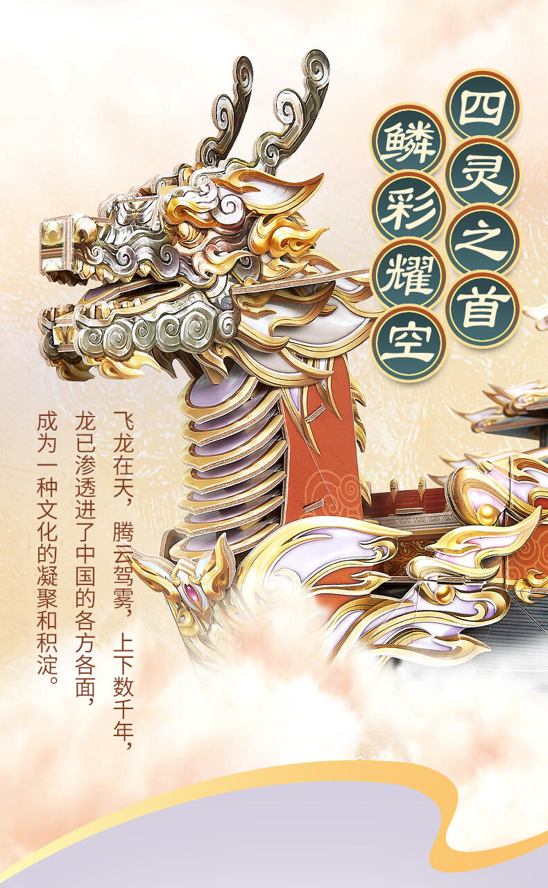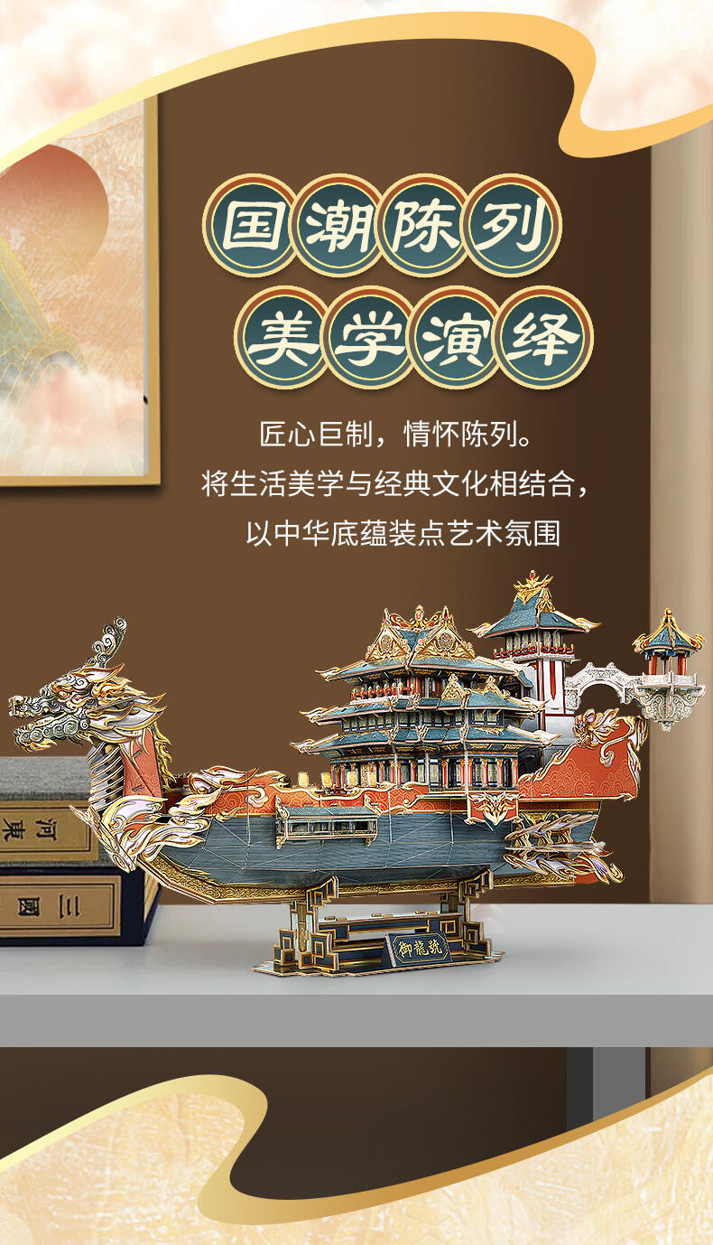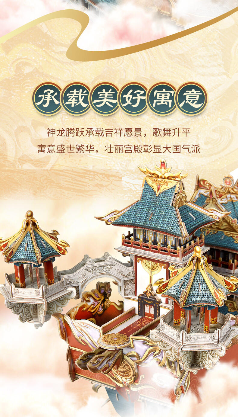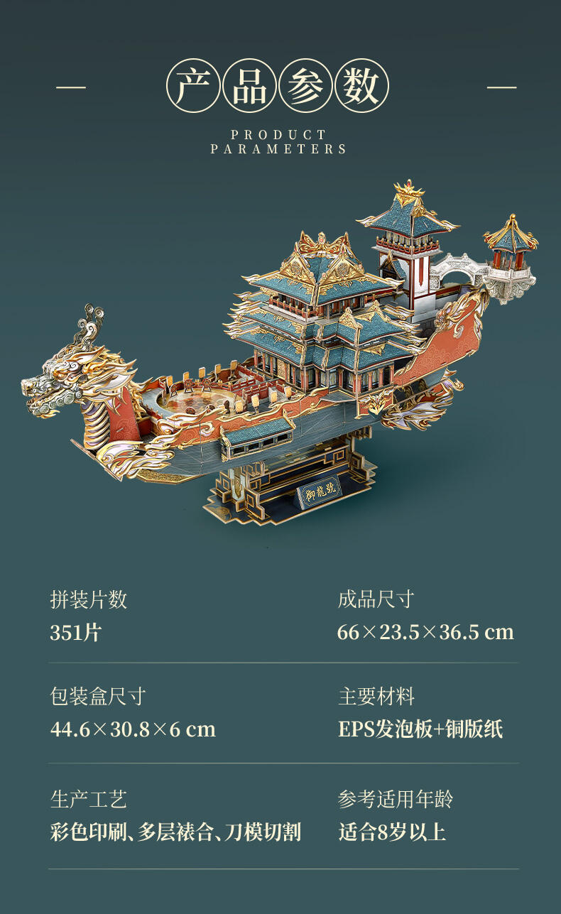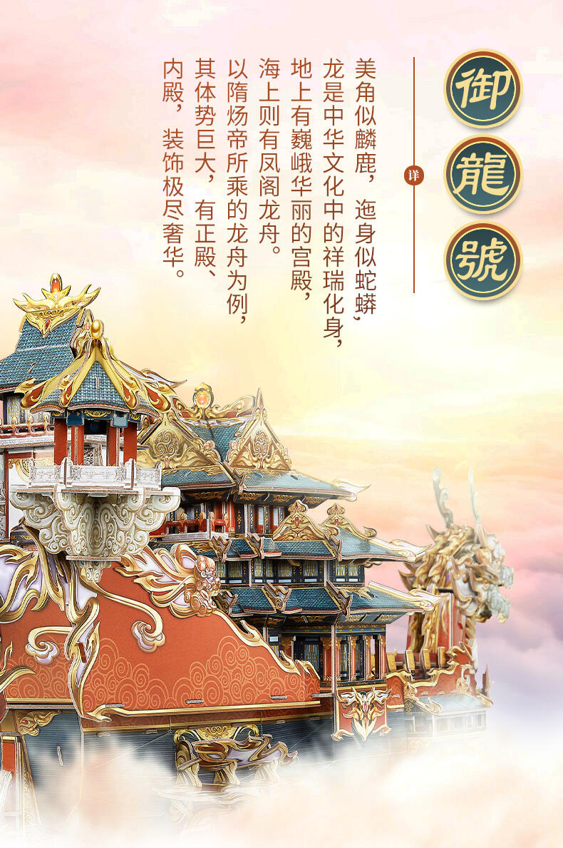 产品背景:美角似麟鹿,迤身似蛇蟒,“龙”是中华文化中的祥瑞化身,地上有巍峨华丽的宫殿,海上则有凤阁龙舟。以隋炀帝所乘的龙舟为例,其体势巨大,有正殿、内殿,装饰极尽奢华。