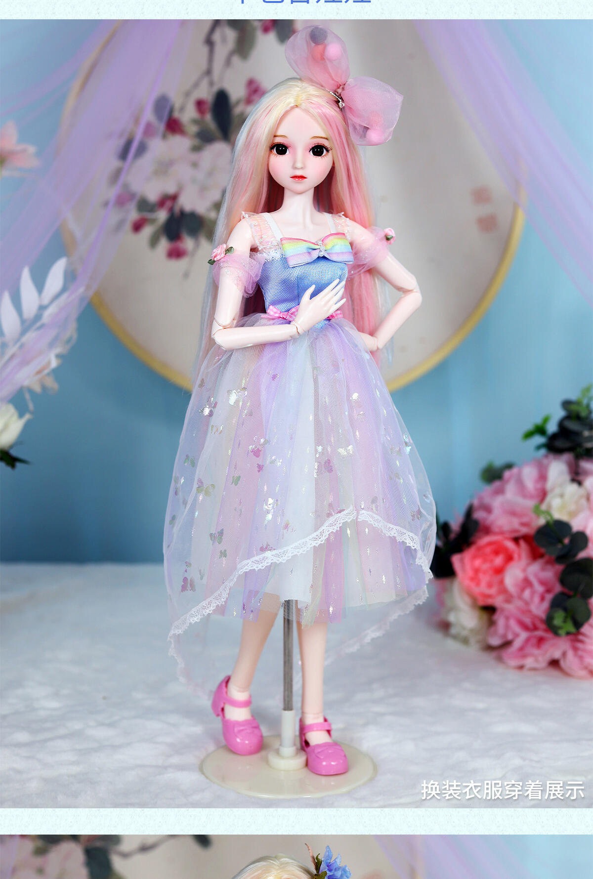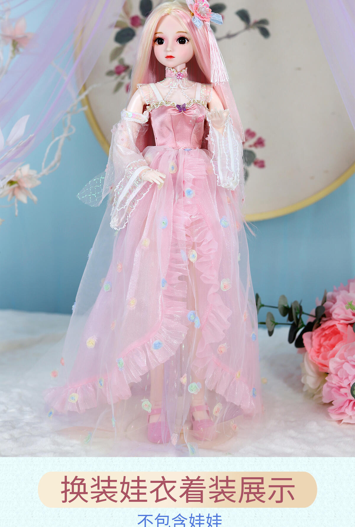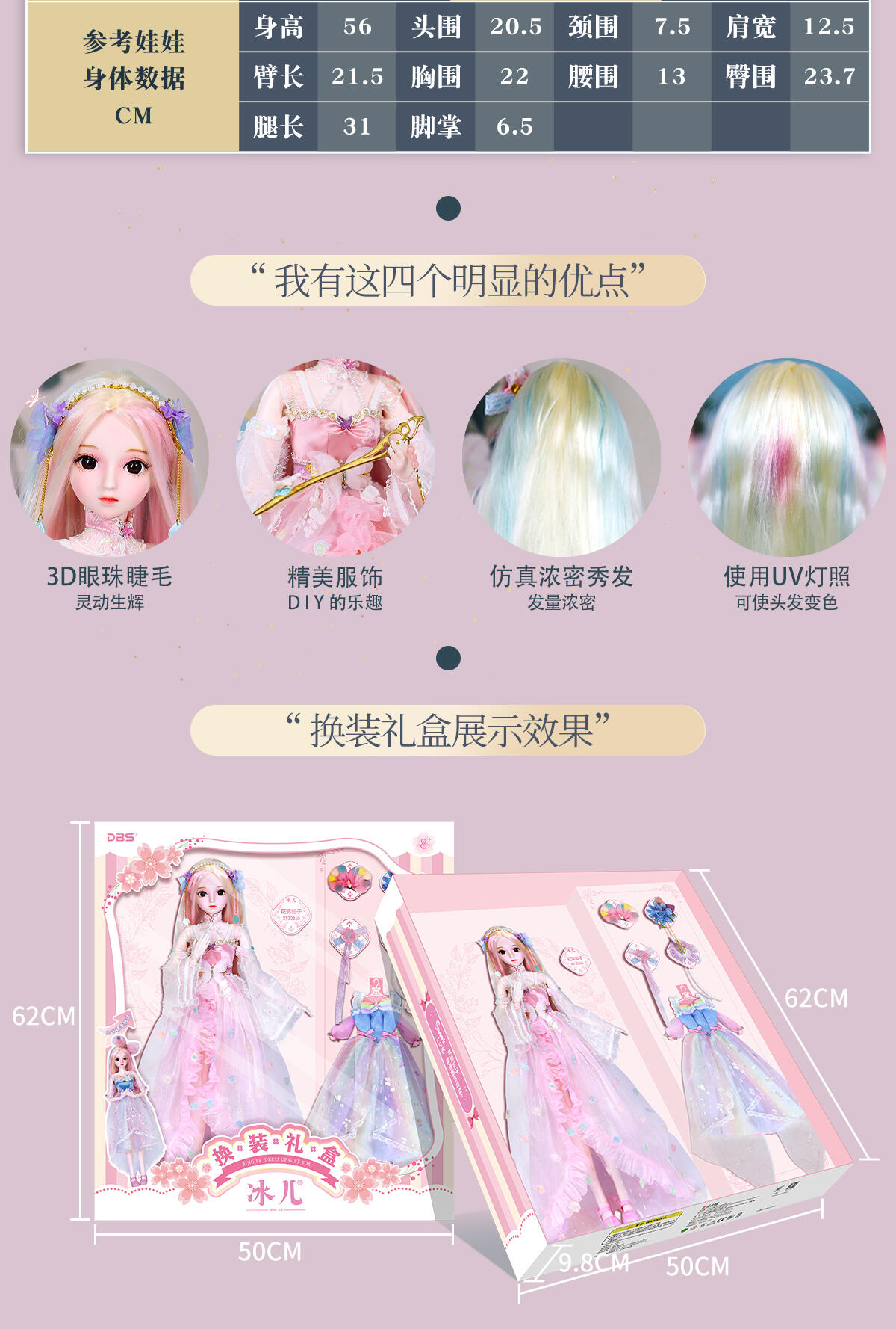 55公分高度大娃娃,灵活的关节,多套配饰,可随心搭配,四款发卡可给小孩自己佩戴在头上。