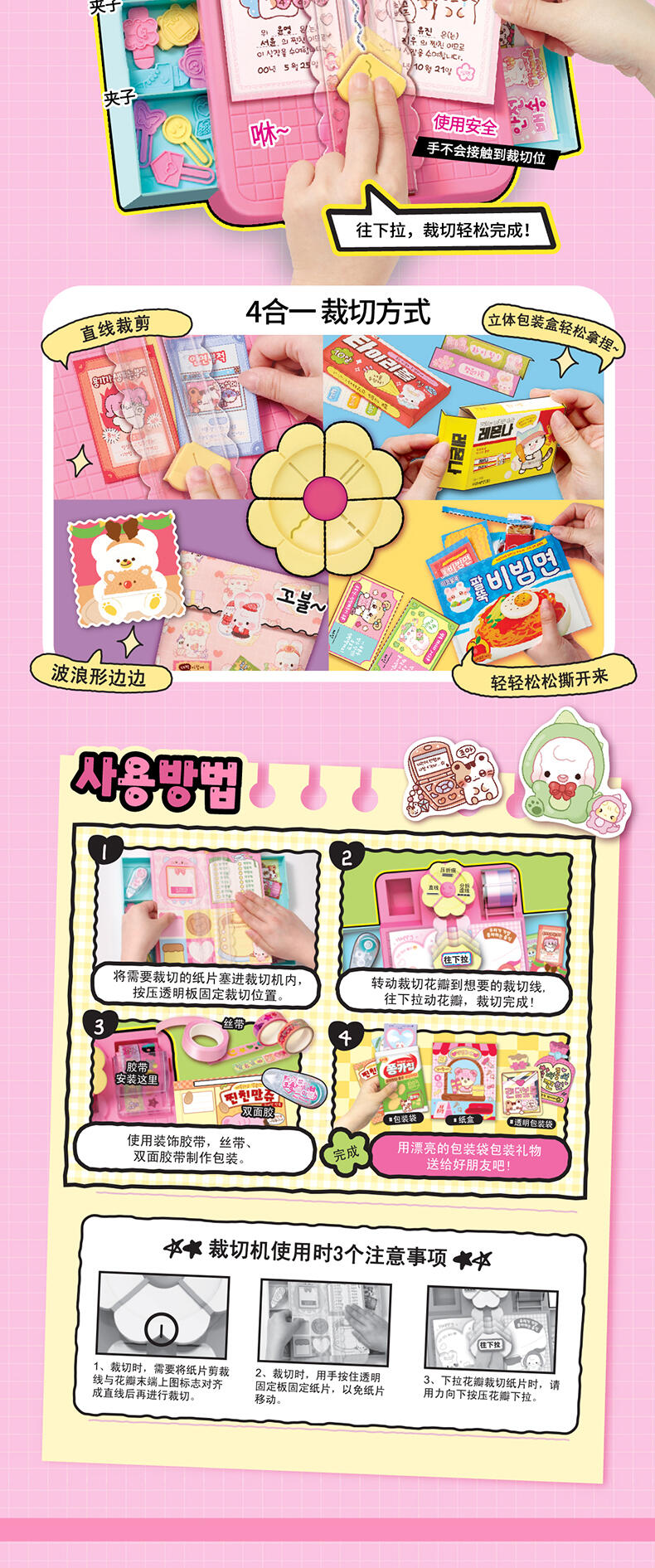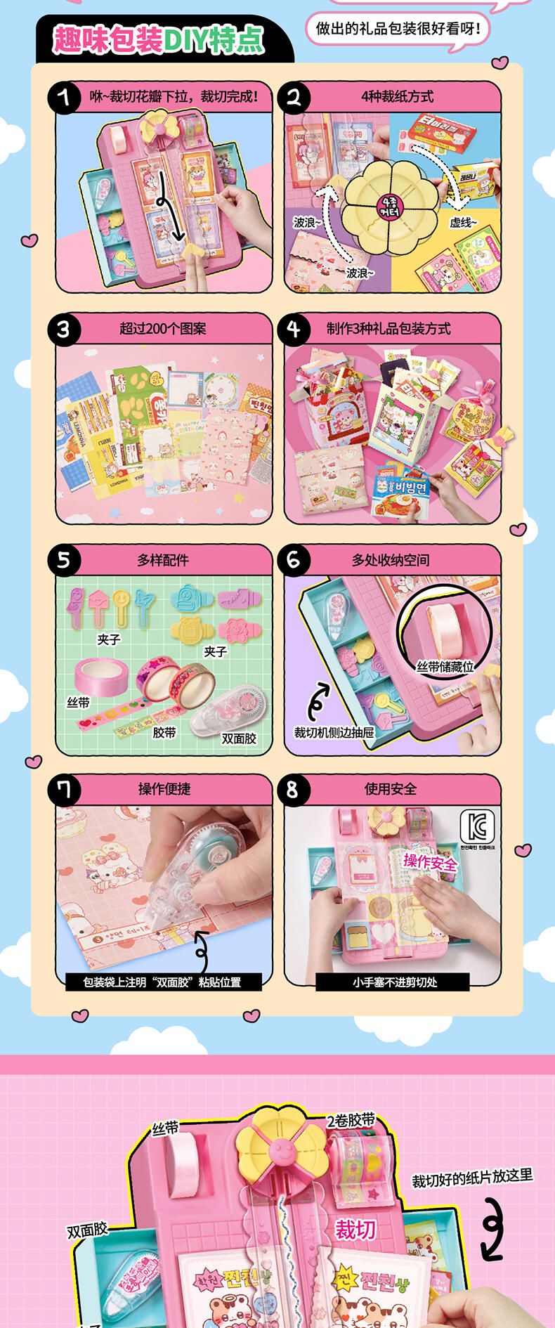 1、小学生手工制作包装盒包装袋 2、4种裁纸纹路,DIY好看的礼品包装 3、200种图案,让礼品袋更加丰富 4、裁切机使用方便,下拉裁切花瓣,裁切成功